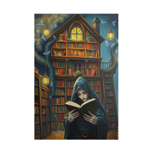 Gothic Bookstore Jigsaw Puzzle, Cloaked Figure Pale Skin Intense Eyes, Dark Fantasy Whimsical, Challenging Adult Tabletop Game, Giftable
