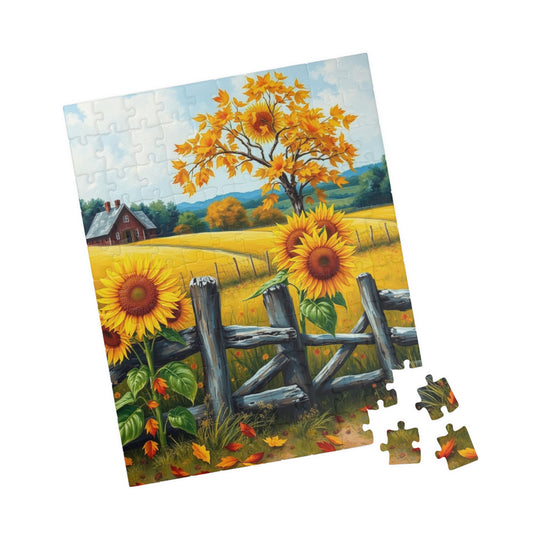 Jigsaw Puzzle, Sunflower Field Landscape Puzzle, Autumn Leaves, Wooden Fence, 110-1014 Pieces, Relaxing Activity, Home Decor, Gift for