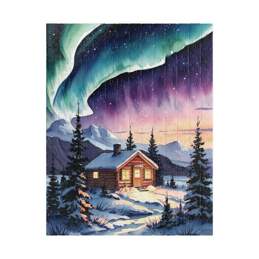 Northern Lights Landscape Puzzle, Aurora Borealis Snowy Cabin Watercolor Jigsaw Game, Hobby, Puzzle Lover Gift, Frameable Art, Relaxation