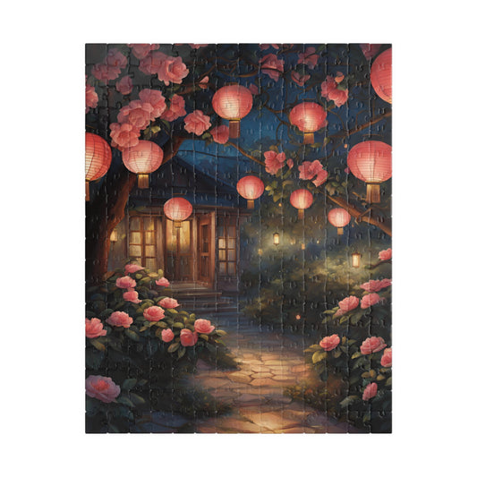 Cottage Landscape Jigsaw Puzzle, Nature-Inspired Floral Flower Design, Nighttime Lanterns and Camellias, Relaxing Hobby, Family Game Night