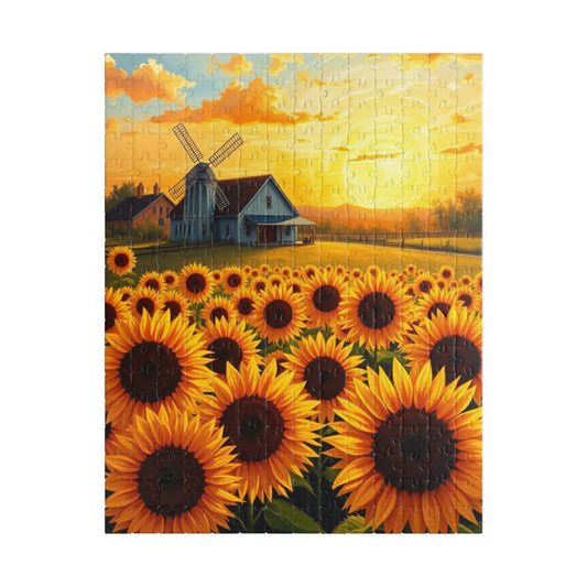 Jigsaw Puzzle, Sunflowers Landscape 110-1014 Piece - Farmhouse Windmill Sunrise, Brain Teaser Game, Family Activity, Home Decor, Gift Idea,