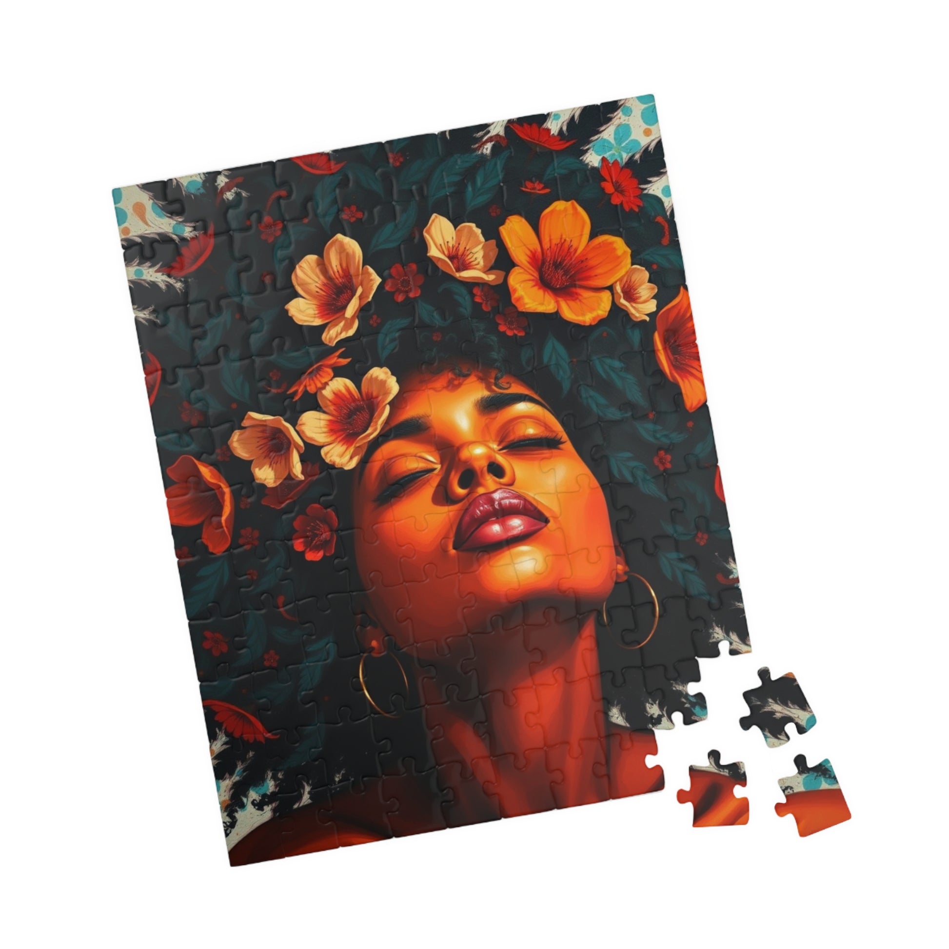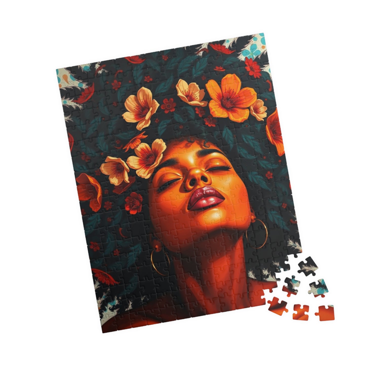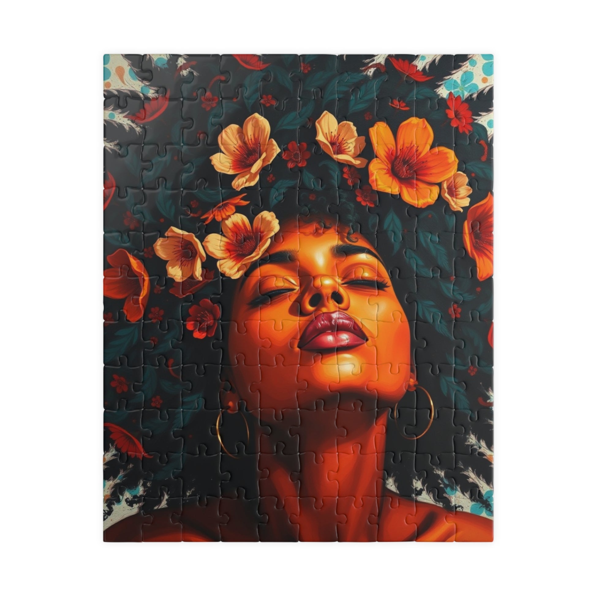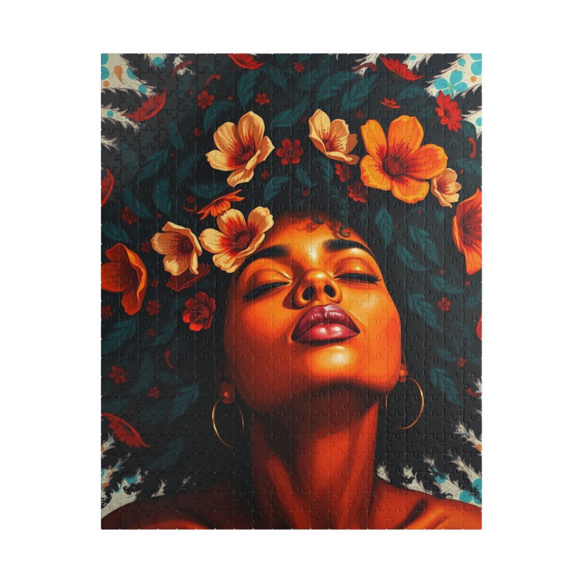 This vibrant puzzle featuring a facial close-up of an African American woman with colorful flowers in her hair exudes a feeling of beauty and empowerment. Perfect for fans of diverse and inclusive artwork, this puzzle can be a relaxing and engaging activity for anyone looking to unwind. Ideal for gifting during Black History Month or Women's History Month.