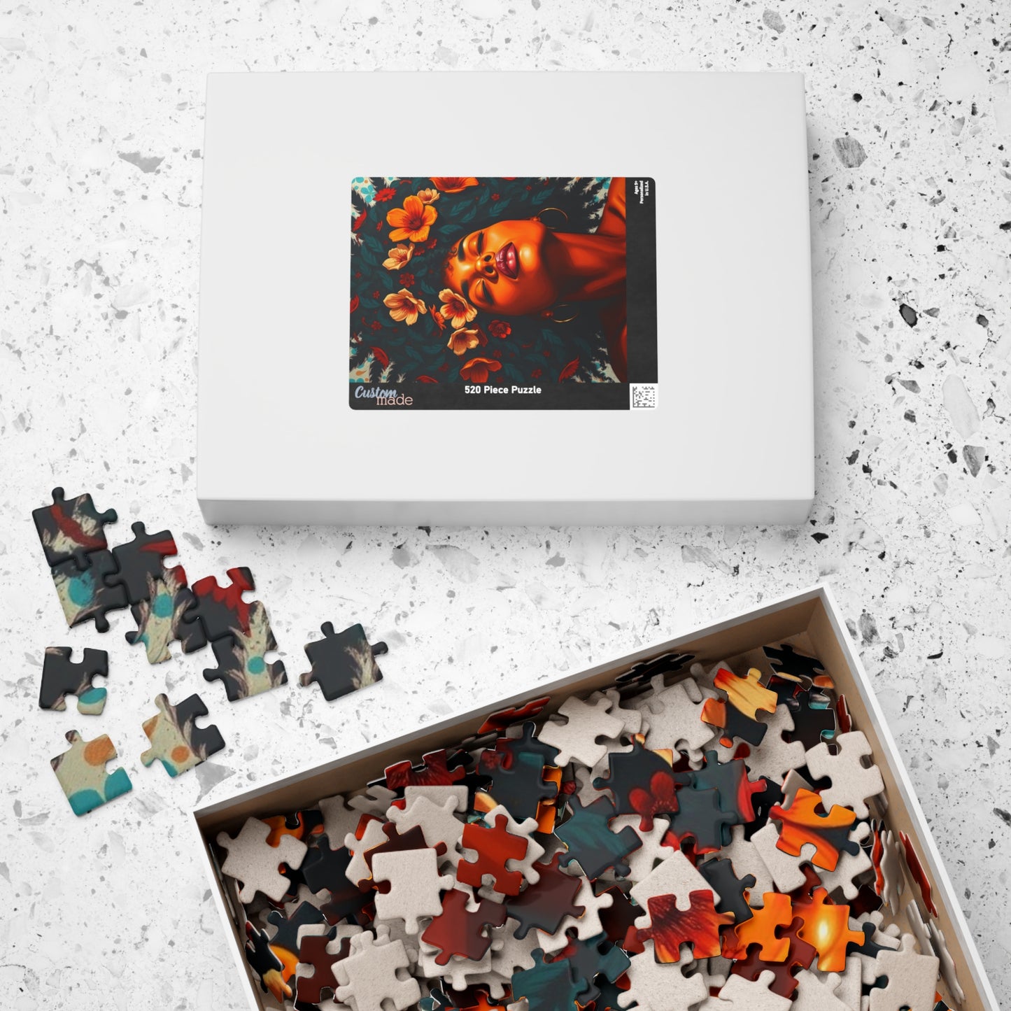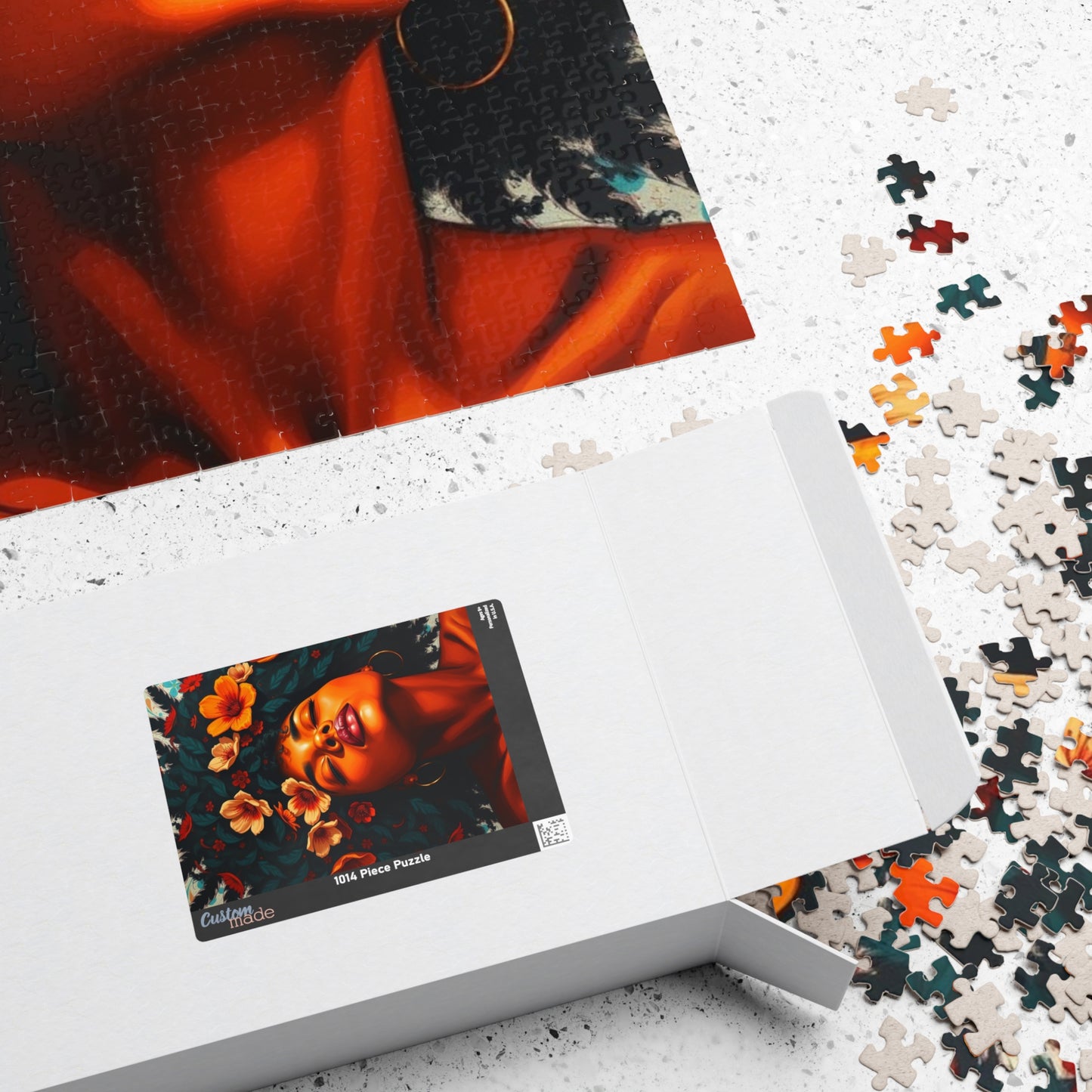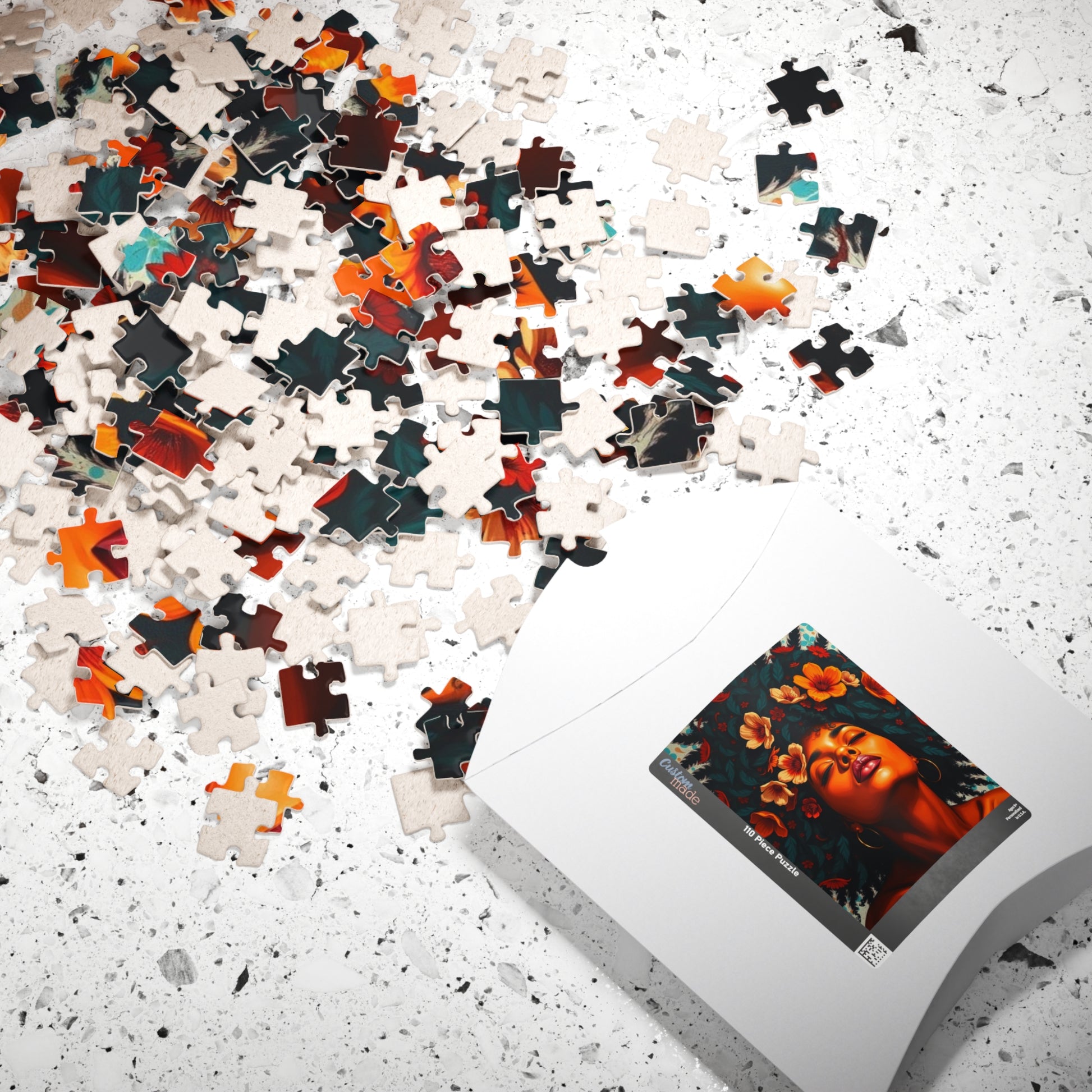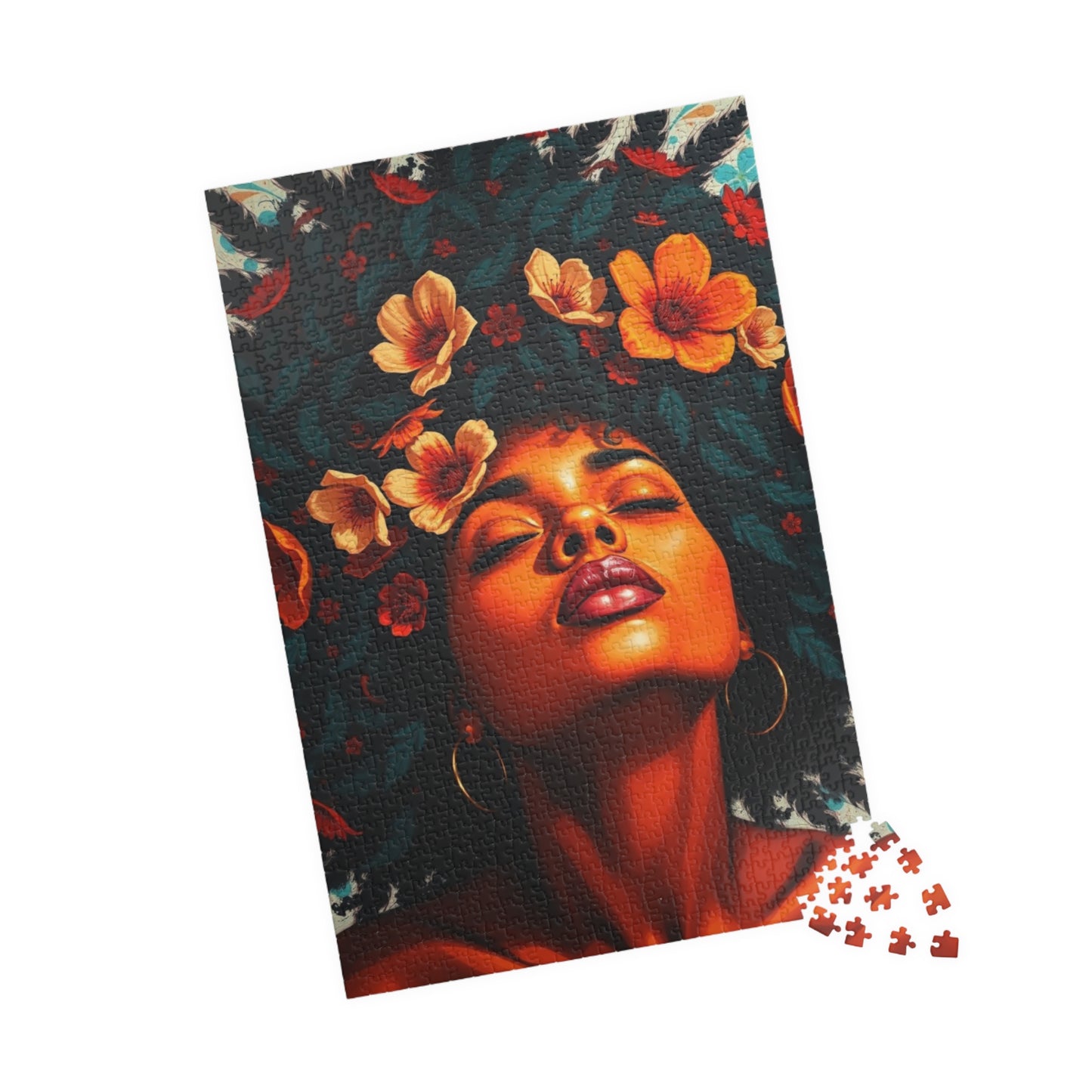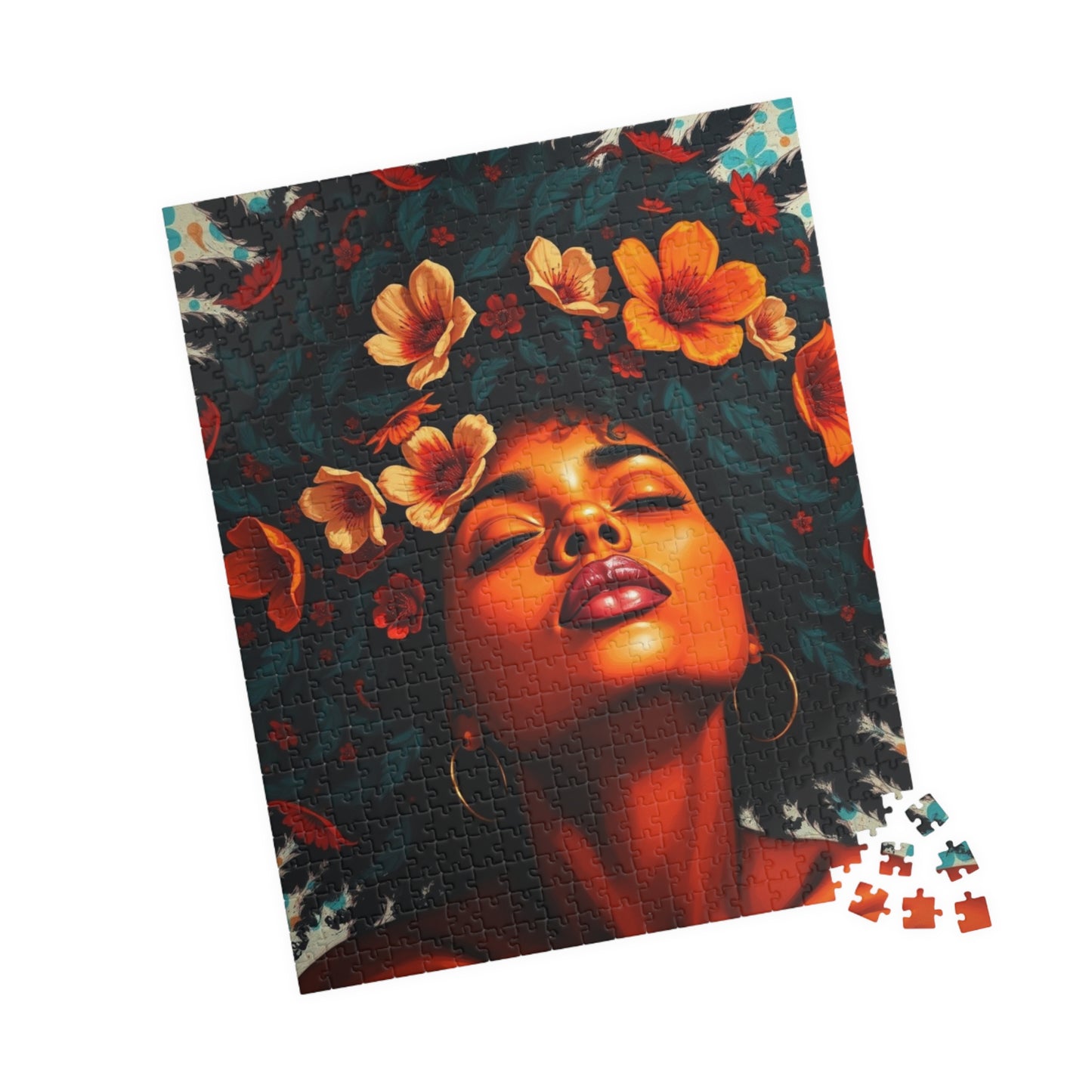 This vibrant puzzle featuring a facial close-up of an African American woman with colorful flowers in her hair exudes a feeling of beauty and empowerment. Perfect for fans of diverse and inclusive artwork, this puzzle can be a relaxing and engaging activity for anyone looking to unwind. Ideal for gifting during Black History Month or Women's History Month.