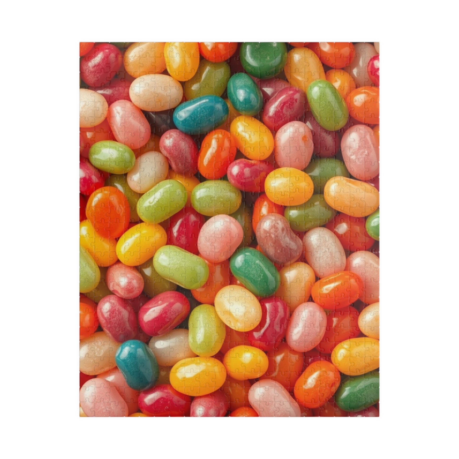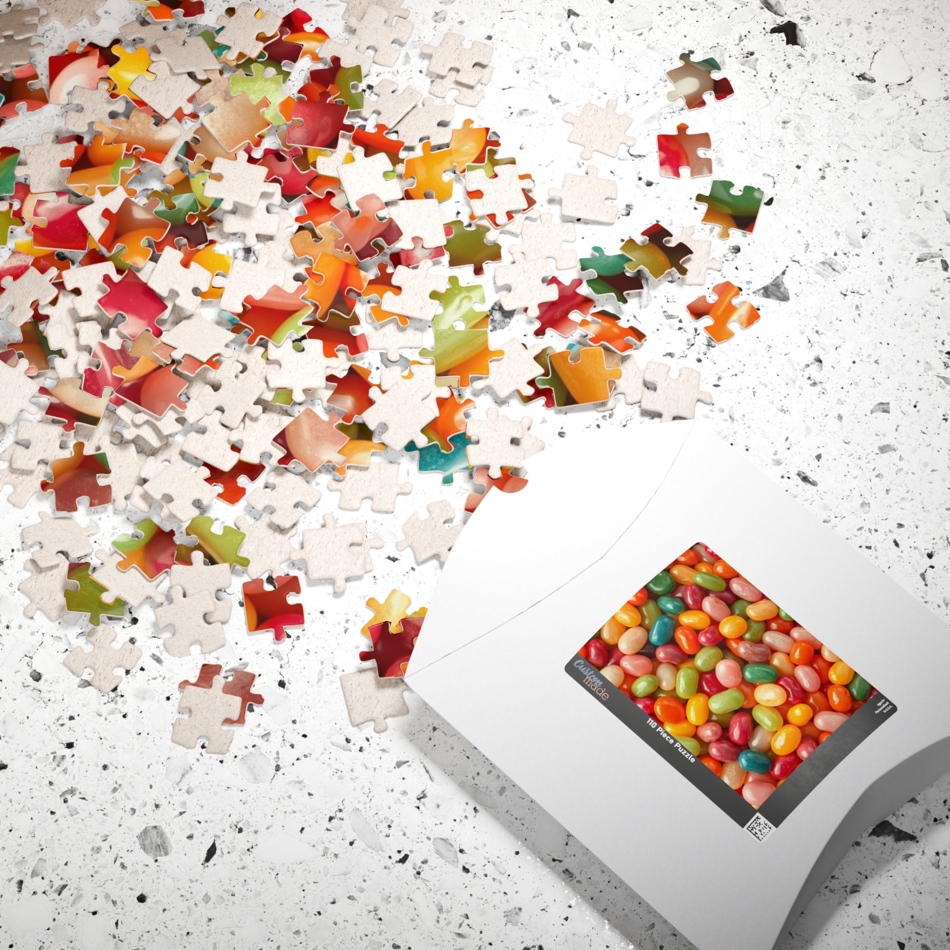 Dive into a colorful world of sweetness with this vibrant jelly bean collage puzzle! Featuring an array of bright, eye-catching colors seamlessly blended with smooth gradient transitions, this design captures the delicious chaos of a jar of jelly beans spilled in perfect harmony. With every piece, you'll uncover a burst of color and texture, making it a fun and satisfying challenge for puzzle lovers of all ages.