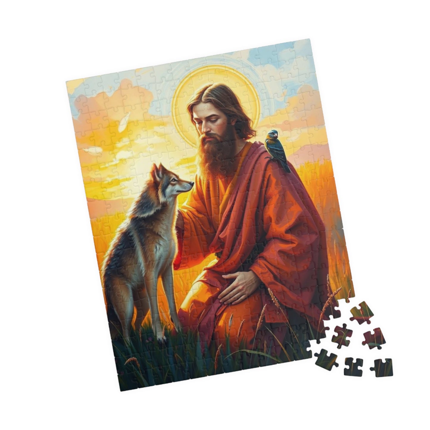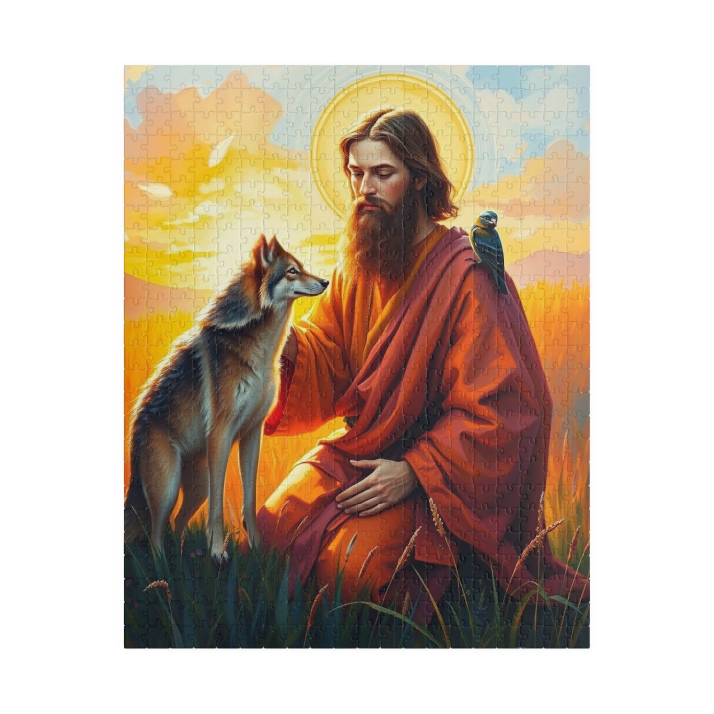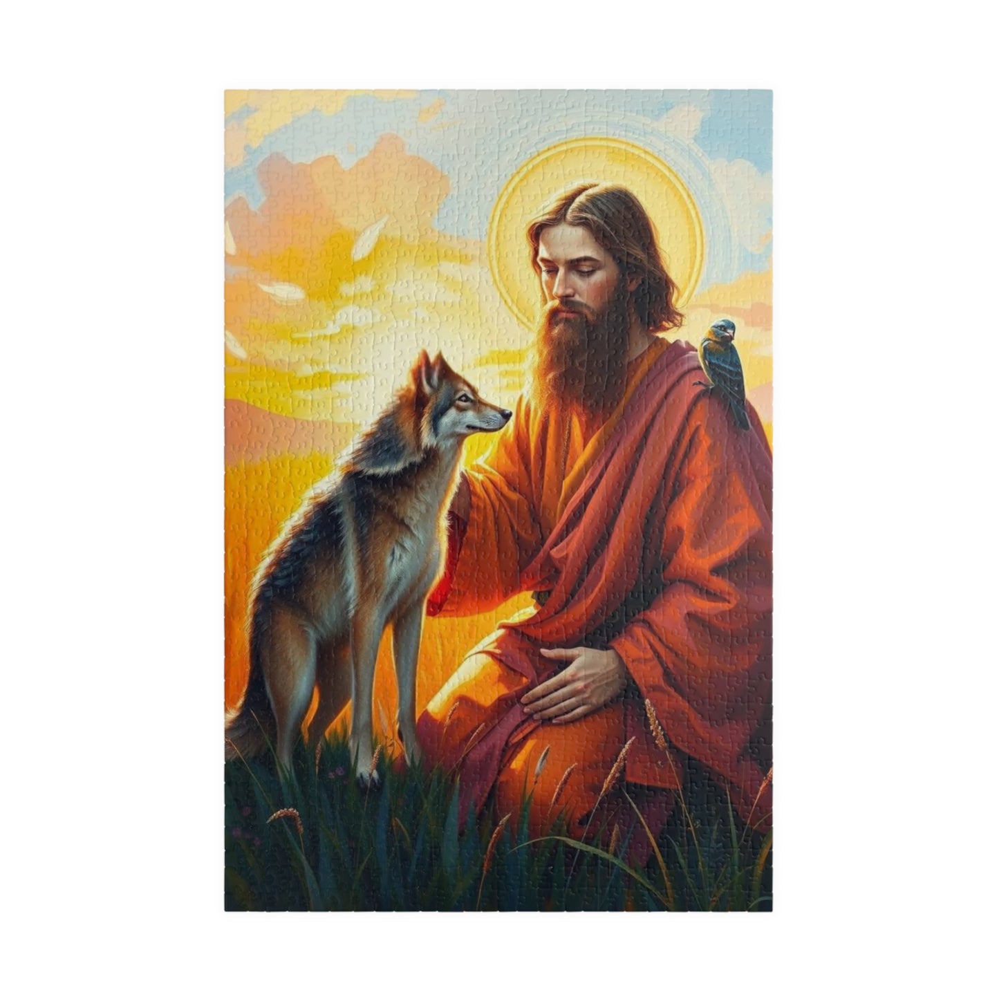 A serene and peaceful puzzle featuring Saint Francis blessing a wolf in a vibrant meadow during a golden sunset. Perfect for those who enjoy calming and intricate puzzles. Ideal for religious holidays or those who appreciate nature-themed decor.
