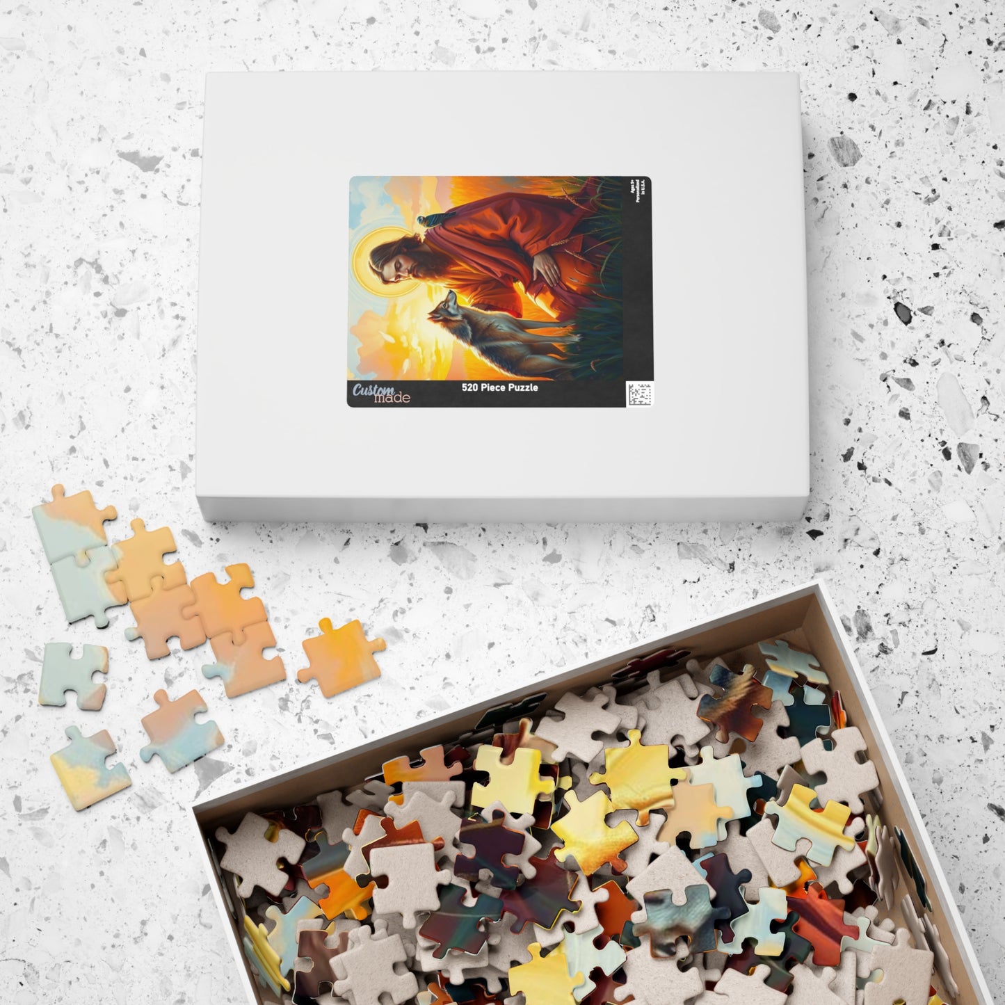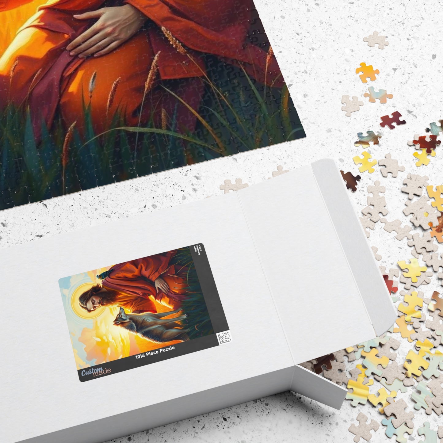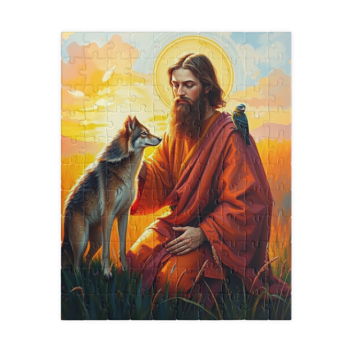 A serene and peaceful puzzle featuring Saint Francis blessing a wolf in a vibrant meadow during a golden sunset. Perfect for those who enjoy calming and intricate puzzles. Ideal for religious holidays or those who appreciate nature-themed decor.