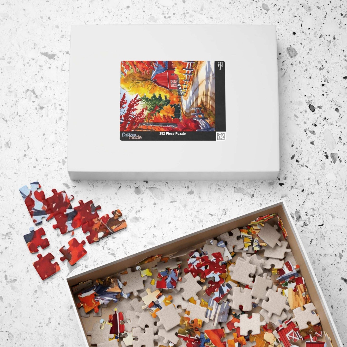 Immerse yourself in the charming beauty of New England with this stunning autumn-themed puzzle. Set against the backdrop of a vibrant forest, the scene comes alive with rich shades of red, orange, and yellow as the leaves of the trees turn to their fall colors. A winding road stretches through the landscape, leading past a classic red barn with a rustic wooden fence and a glimpse of a distant farmhouse. The peaceful atmosphere of this scene captures the heart of rural New England during the peak of autumn, making it the perfect puzzle for nature lovers and those seeking a serene, scenic escape. Whether you enjoy the relaxing process of puzzling or simply love the beauty of fall, this puzzle offers a rewarding experience as you bring this cozy countryside scene to life, piece by piece.