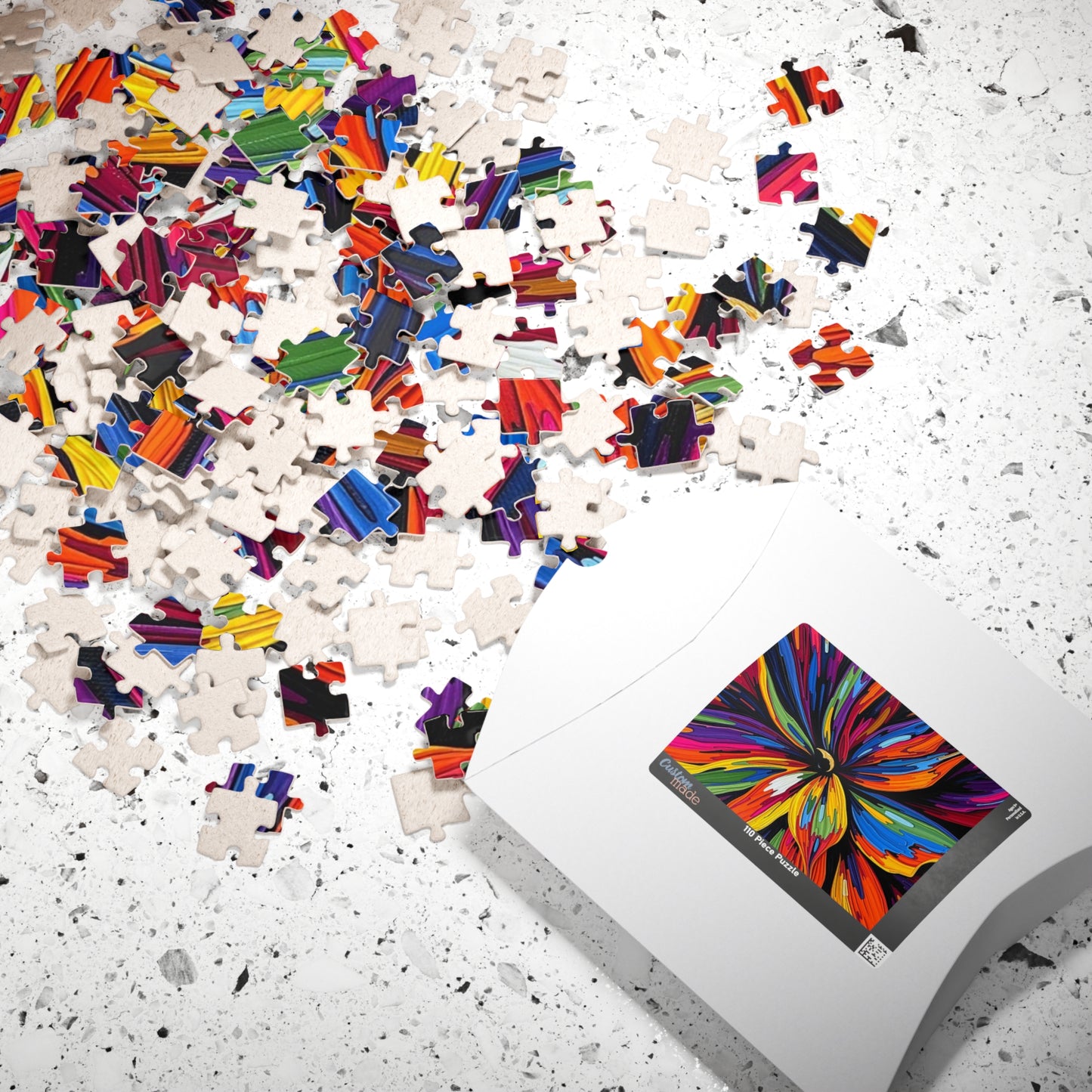 Immerse yourself in the bold beauty of this abstract flower puzzle, where vibrant, sweeping petals come to life in luminous detail. The rich colors are masterfully contrasted against deep black shadows, creating a striking visual impact. Inspired by the impasto painting technique, the highly textured surface adds depth and dimension, making this puzzle a captivating challenge and a stunning work of art when complete. Perfect for art lovers and puzzle enthusiasts, this piece offers a uniquely creative and rewarding experience!