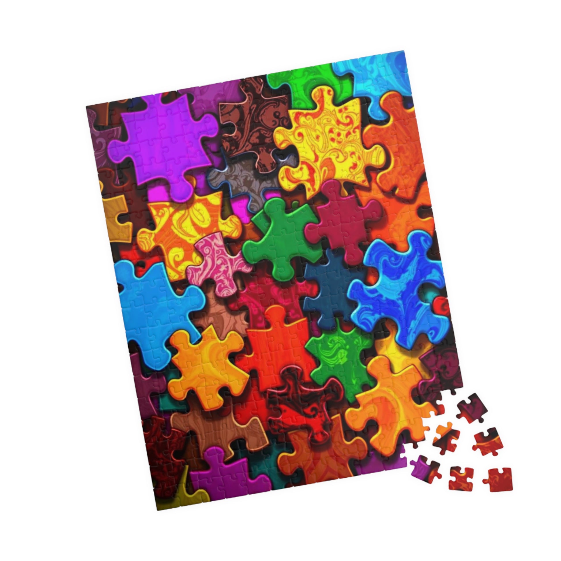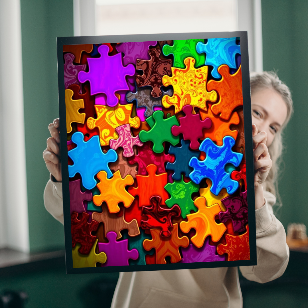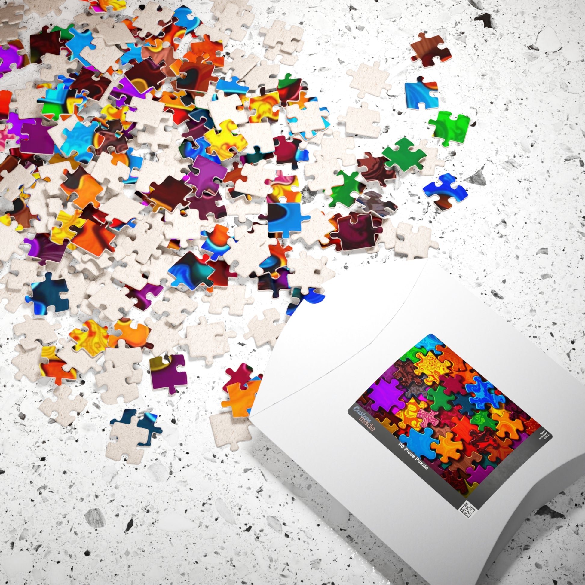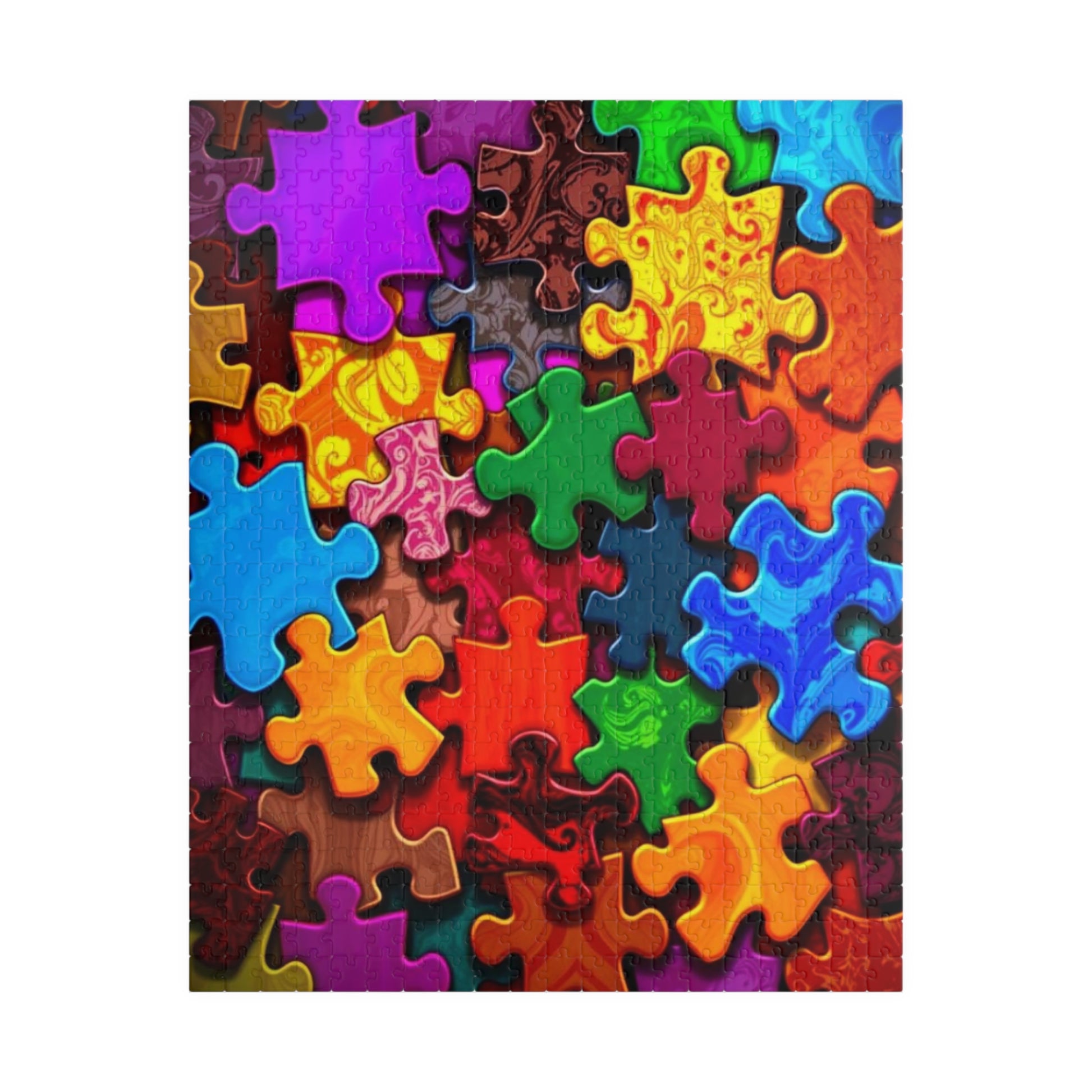 A colorful collage of overlapping jigsaw puzzle pieces in varied colors, styles, and patterns. Perfect for puzzle enthusiasts and those who enjoy a fun and challenging activity. Great for gifting during holidays, birthdays, or family gatherings.