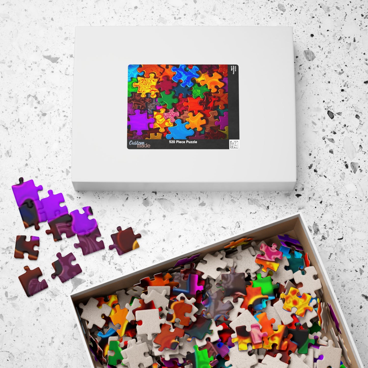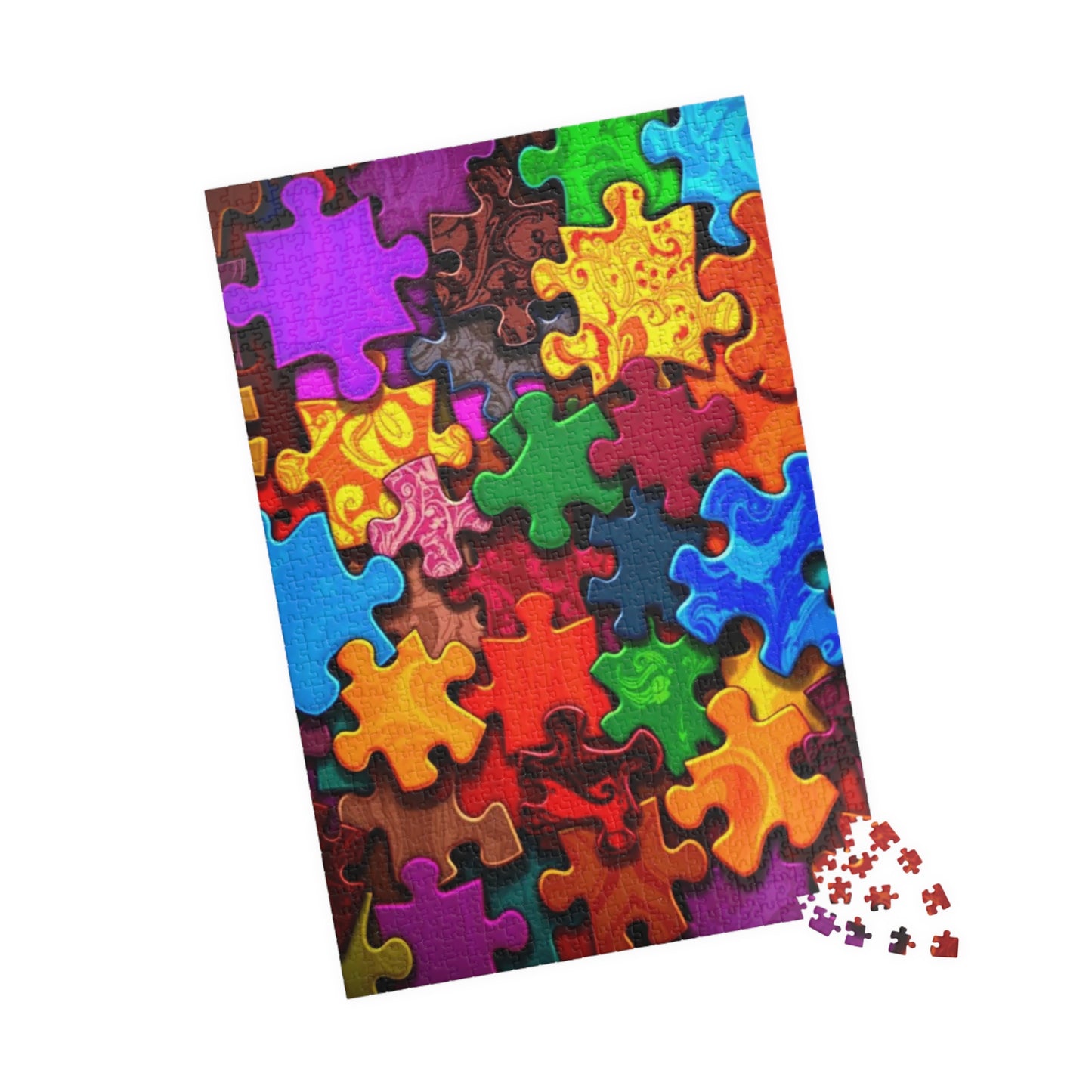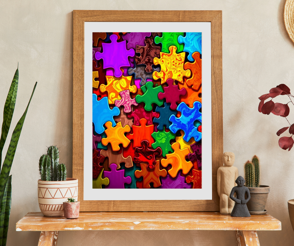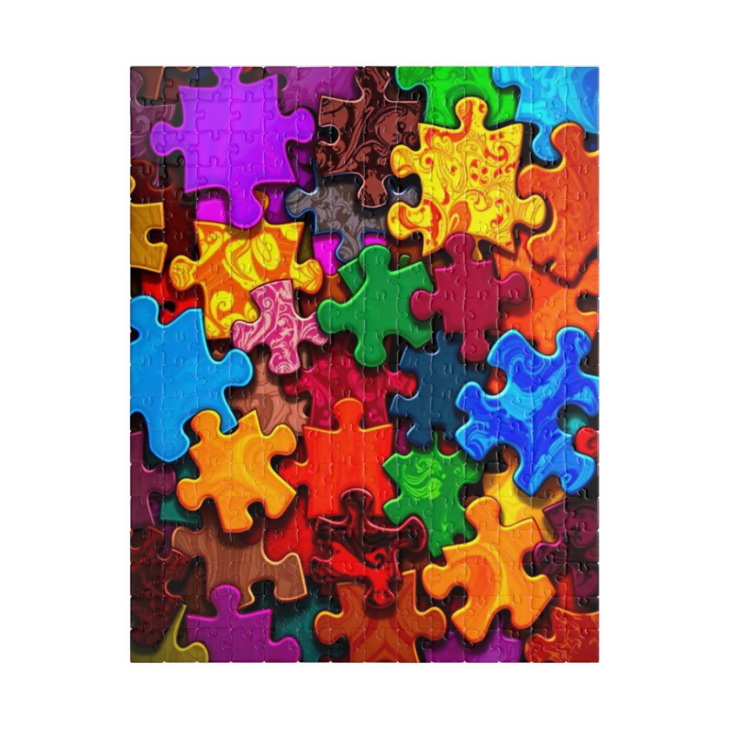 A colorful collage of overlapping jigsaw puzzle pieces in varied colors, styles, and patterns. Perfect for puzzle enthusiasts and those who enjoy a fun and challenging activity. Great for gifting during holidays, birthdays, or family gatherings.