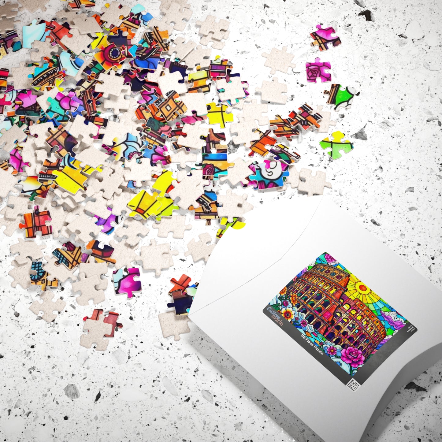 Immerse yourself in a dazzling fusion of history and imagination with this vibrant puzzle! Featuring a surreal, stained-glass depiction of the Colosseum, this design bursts with dreamlike details, bold colors, and whimsical floral accents. Bizarre and fantastical elements blend seamlessly into the energetic composition, creating a one-of-a-kind puzzle experience that’s as captivating to assemble as it is to admire. Perfect for art lovers, history buffs, and puzzle enthusiasts alike, this masterpiece will transport you to a world where creativity knows no bounds!