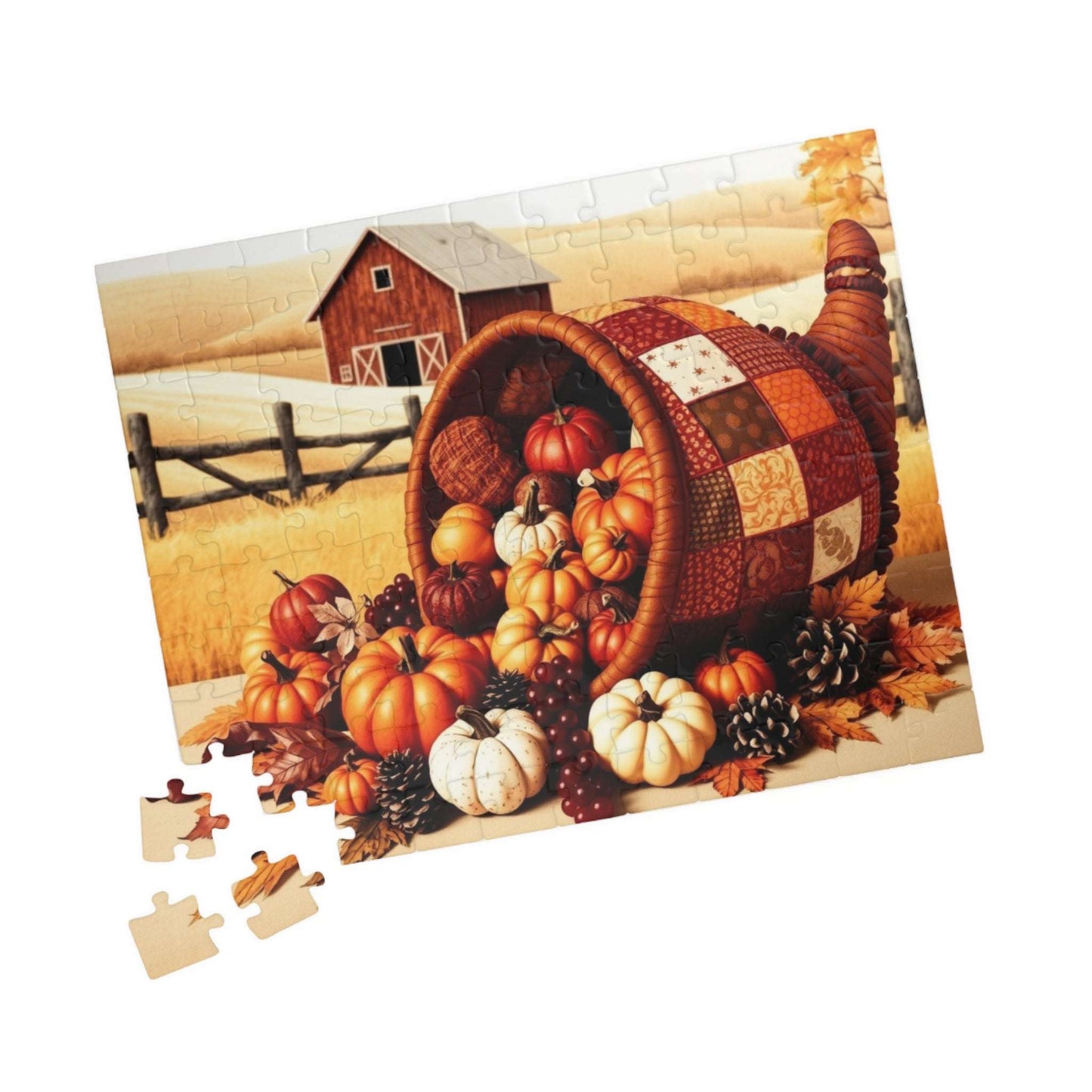 Celebrate the bounty of autumn with this richly detailed Patchwork Cornucopia puzzle. A quilted horn of plenty overflows with pumpkins, gourds, apples, and wheat, each piece stitched together in cozy patchwork patterns of orange, gold, and deep red. Behind the cornucopia, a rustic farmyard sets the scene, complete with a red barns, rolling fields, and fluttering leaves in full fall color. With its warm tones and handcrafted folk-art feel, this puzzle is perfect for Thanksgiving gatherings, cozy fall afternoons, or anyone who loves the charm of the harvest season. Also, ideal for puzzle enthusiasts, families, or anyone looking for a relaxing yet stimulating pastime.