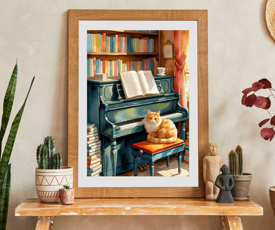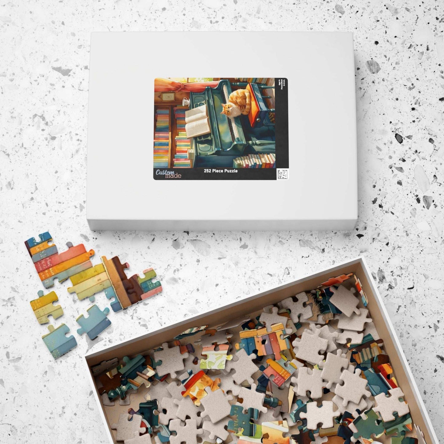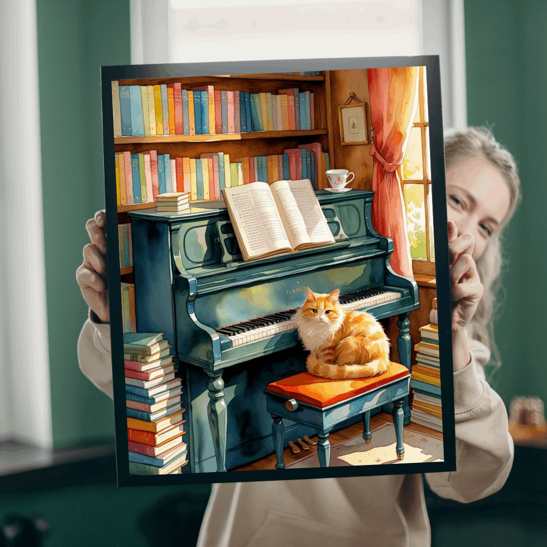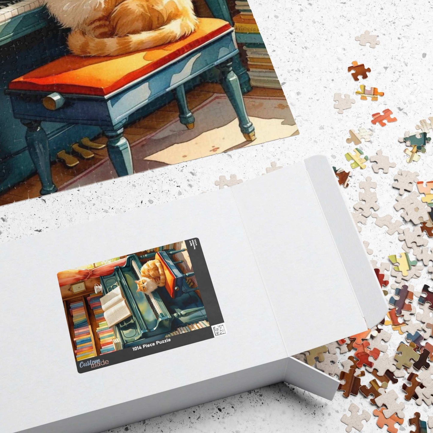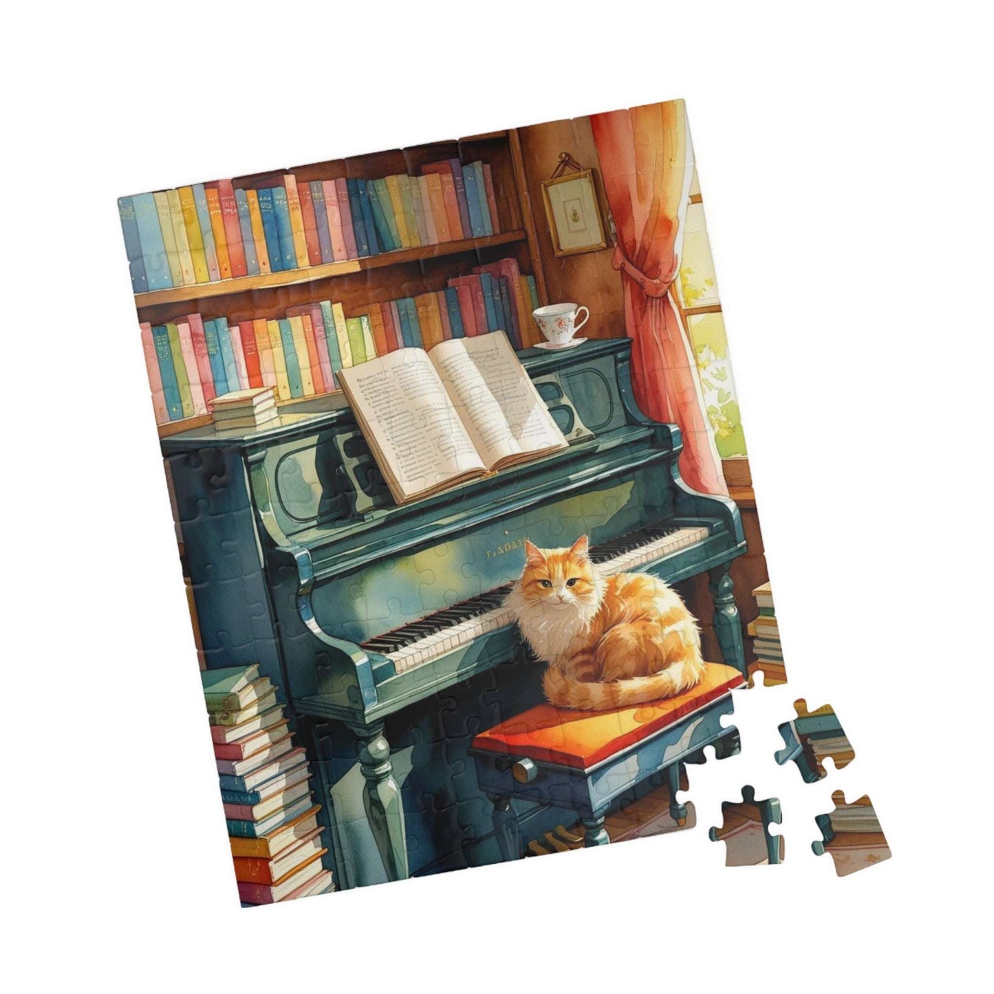 A vibrant puzzle featuring an upright piano in a cozy reading nook surrounded by colorful books and a cat, perfect for quiet evenings in or as a thoughtful gift for bookworms and music enthusiasts. Ideal for winter holidays, birthdays, and leisurely weekends spent indoors.
