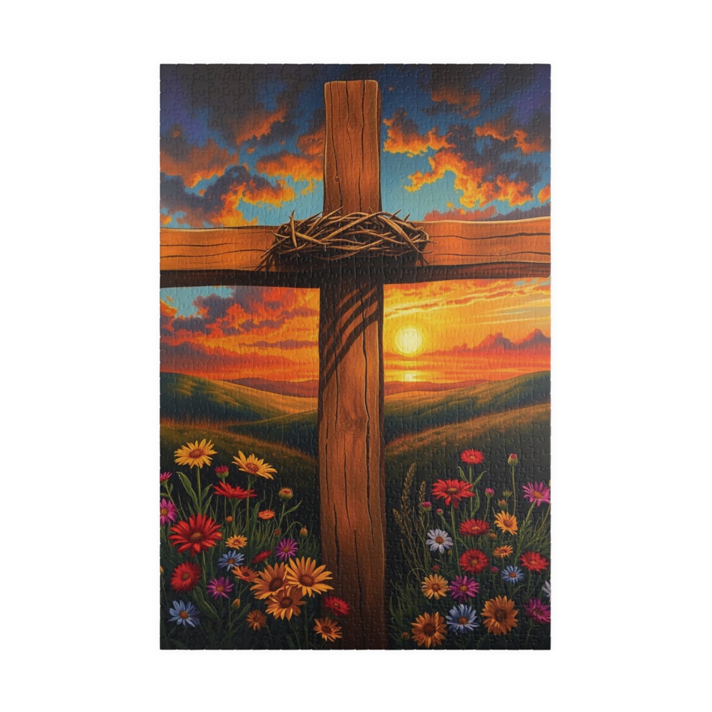 Experience a powerful and evocative scene with this stunning puzzle, featuring a bird’s-eye view of a wooden cross crowned with thorns, bathed in the warm glow of a vibrant sunset. The dramatic lighting casts harsh shadows, emphasizing the raw texture of the wood and the intricate details of the thorny crown. In the foreground, colorful wildflowers sway gently, offering a striking contrast between suffering and renewal, sacrifice and beauty. The bold brushstrokes and rich textures bring depth to the composition, making each puzzle piece a part of an inspiring and thought-provoking experience. Ideal for those who appreciate faith-based artwork, symbolic imagery, and meaningful challenges, this puzzle is a captivating blend of emotion, artistry, and spiritual reflection.