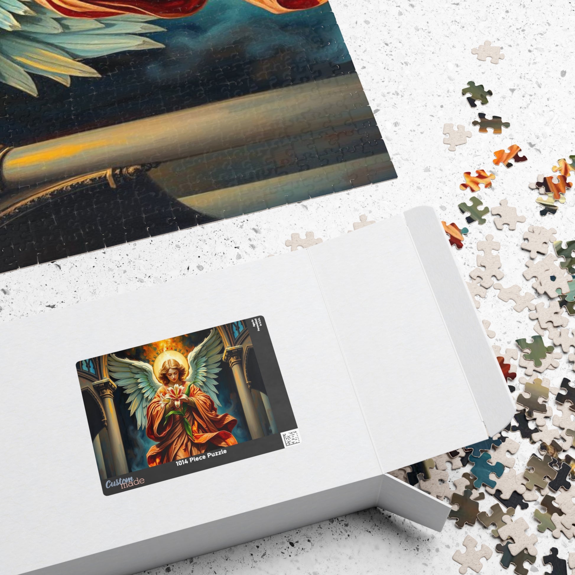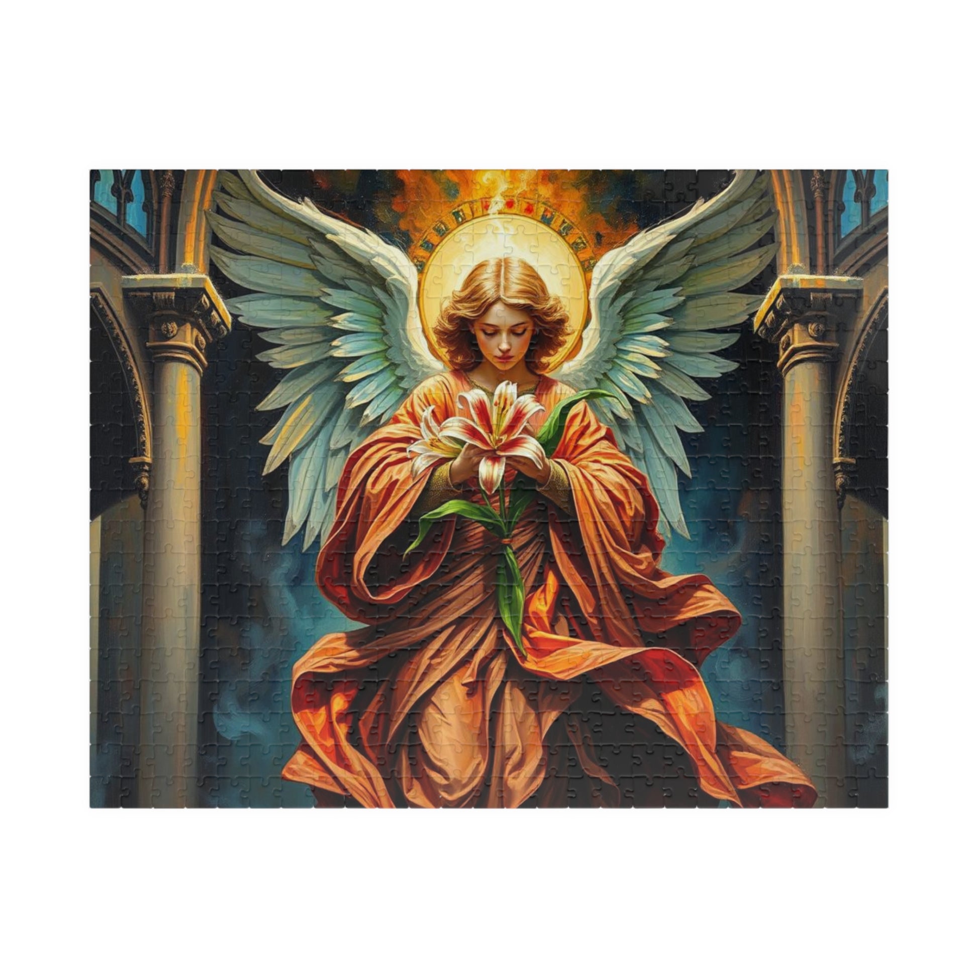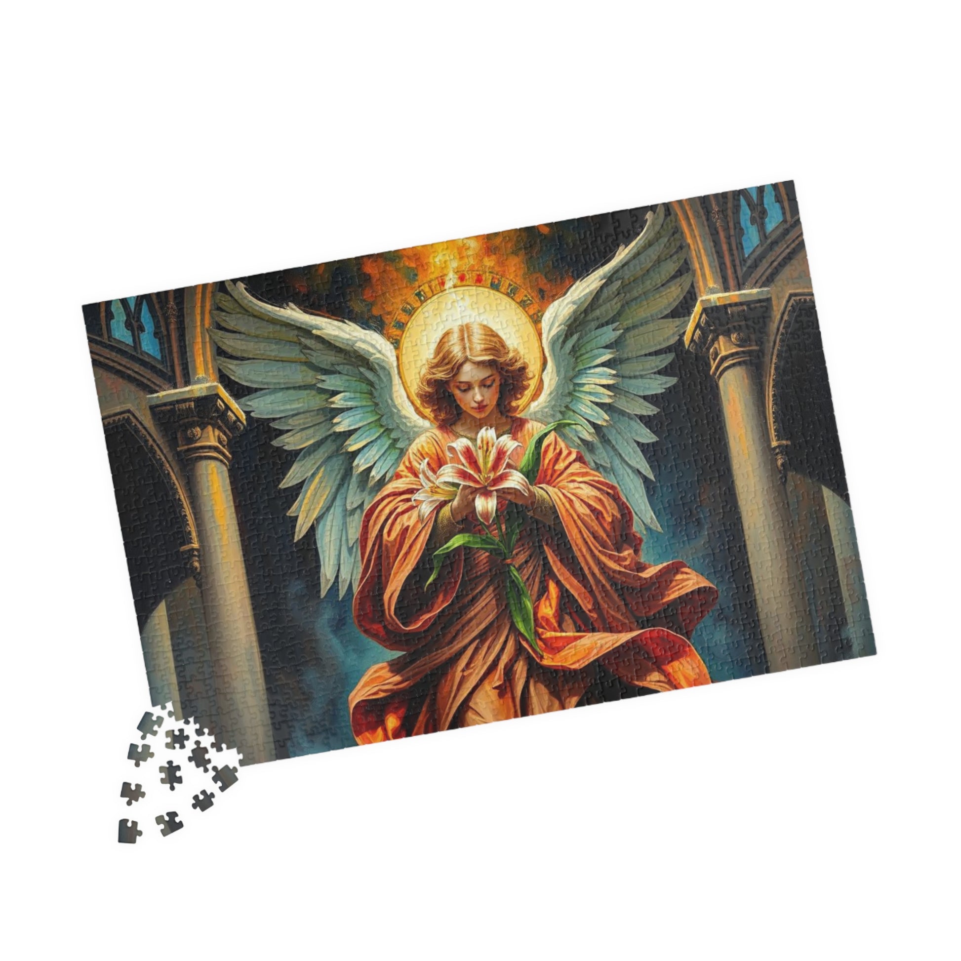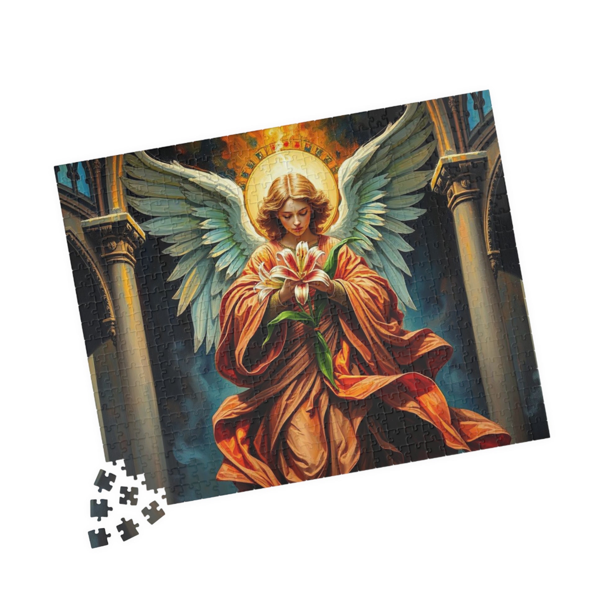Elegant gothic puzzle featuring a Divine Messenger angel in flowing robes offering a lily, bathed in gold and surrounded by Gothic arches. Perfect for those who love intricate designs and appreciate a touch of mystique. Ideal for gothic art enthusiasts, puzzle lovers, and those who enjoy celestial themes. Great for gifting during Halloween, Christmas, or birthdays.