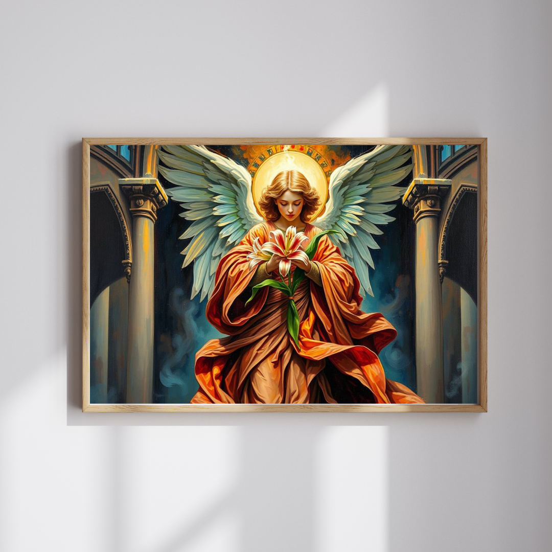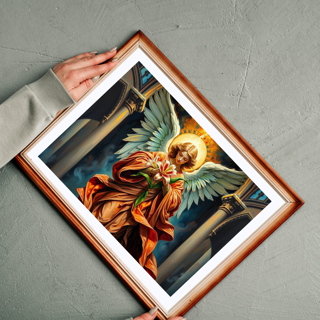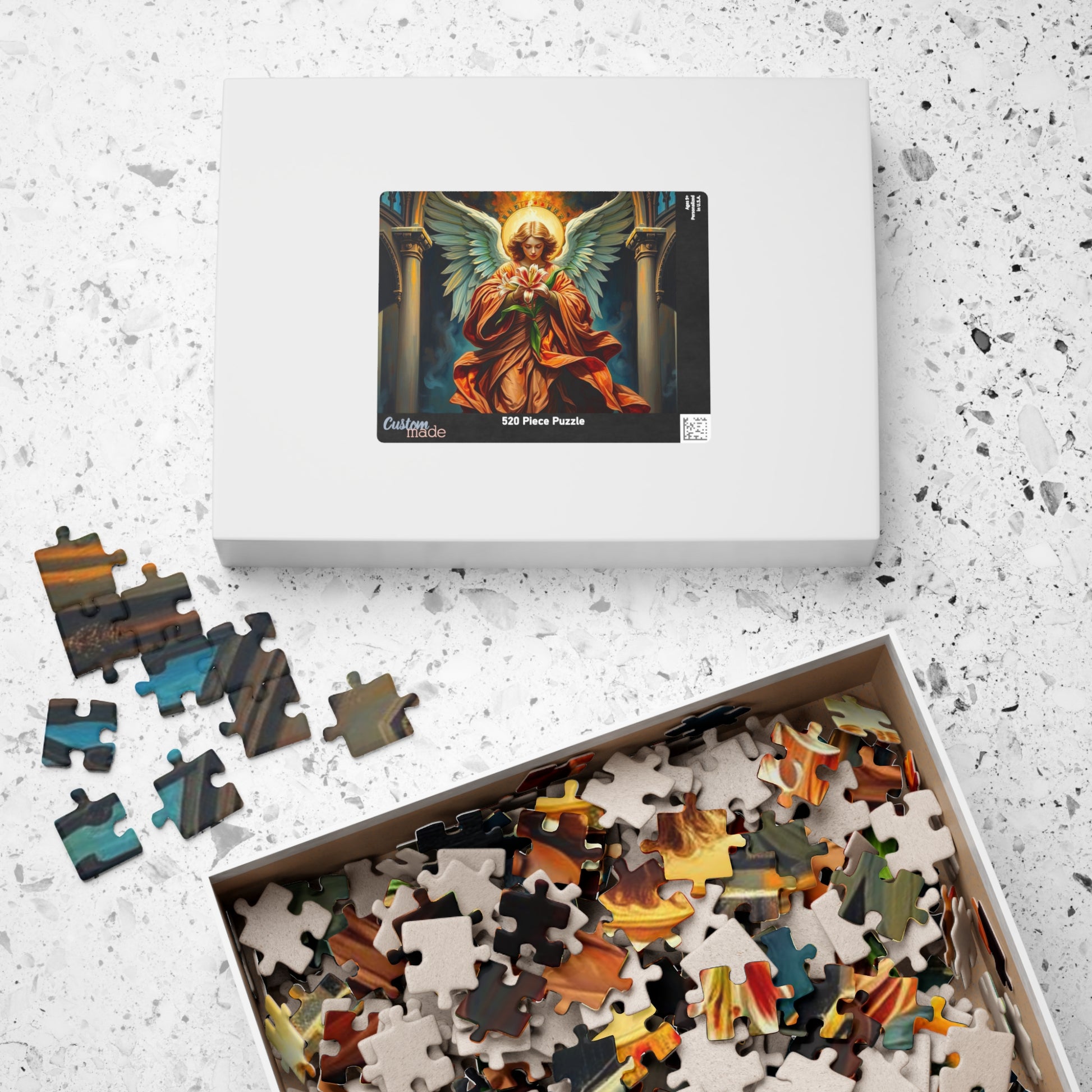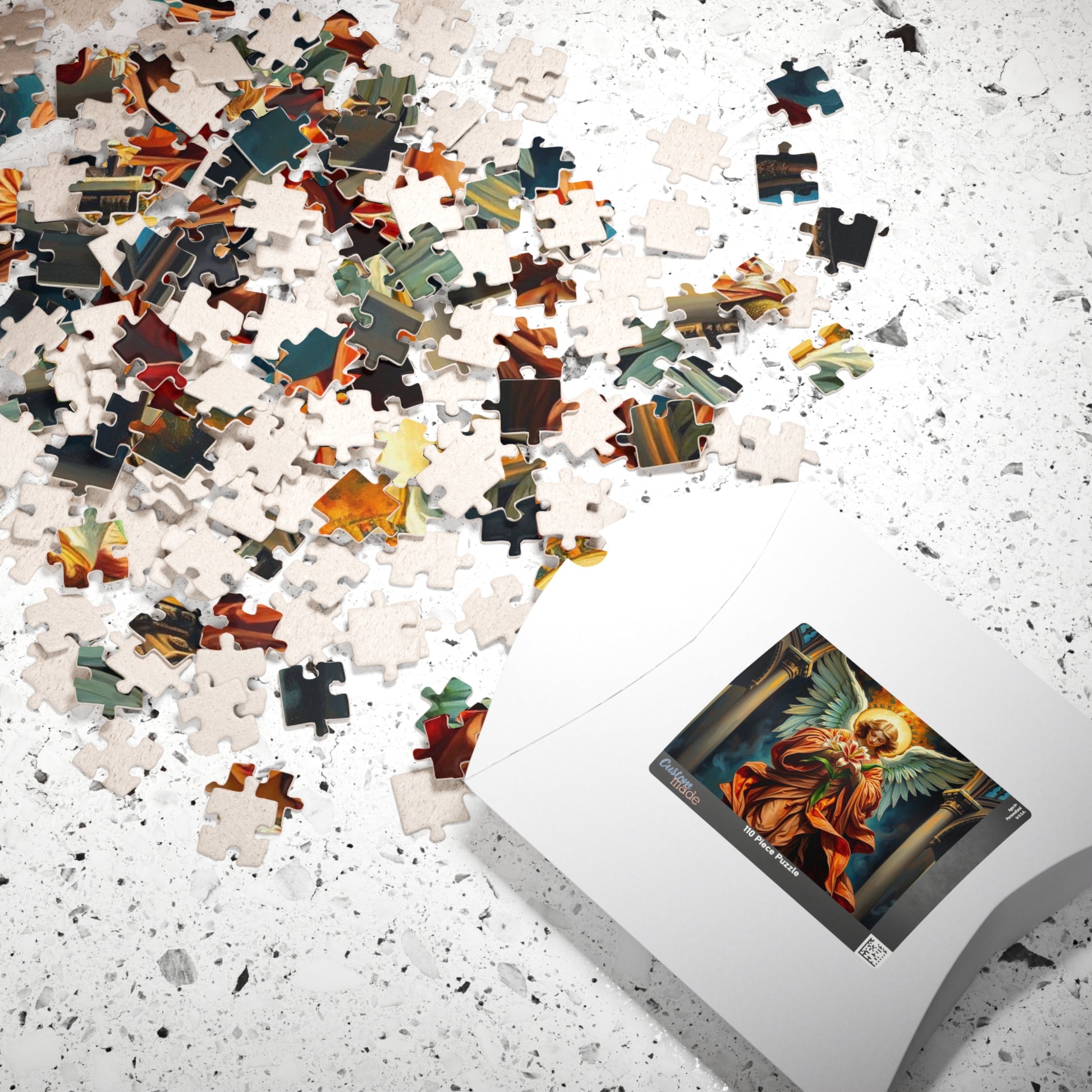 Elegant gothic puzzle featuring a Divine Messenger angel in flowing robes offering a lily, bathed in gold and surrounded by Gothic arches. Perfect for those who love intricate designs and appreciate a touch of mystique. Ideal for gothic art enthusiasts, puzzle lovers, and those who enjoy celestial themes. Great for gifting during Halloween, Christmas, or birthdays.
