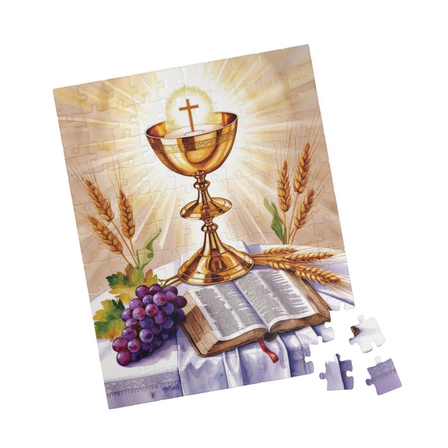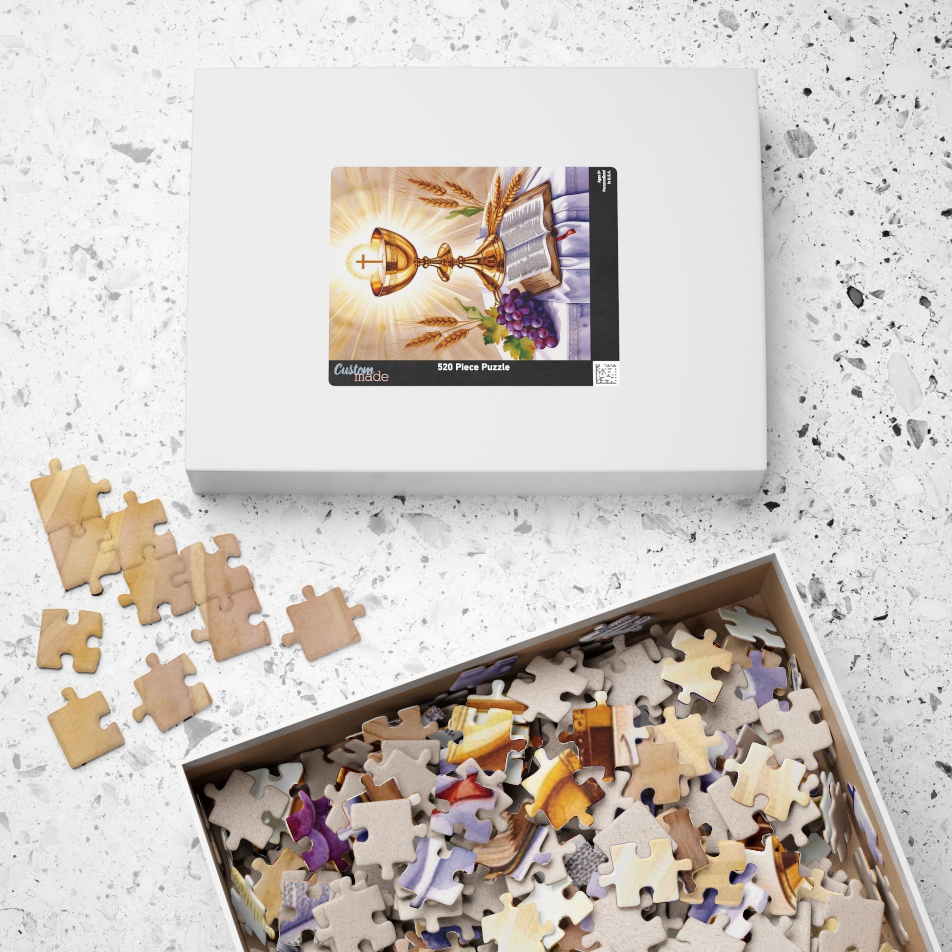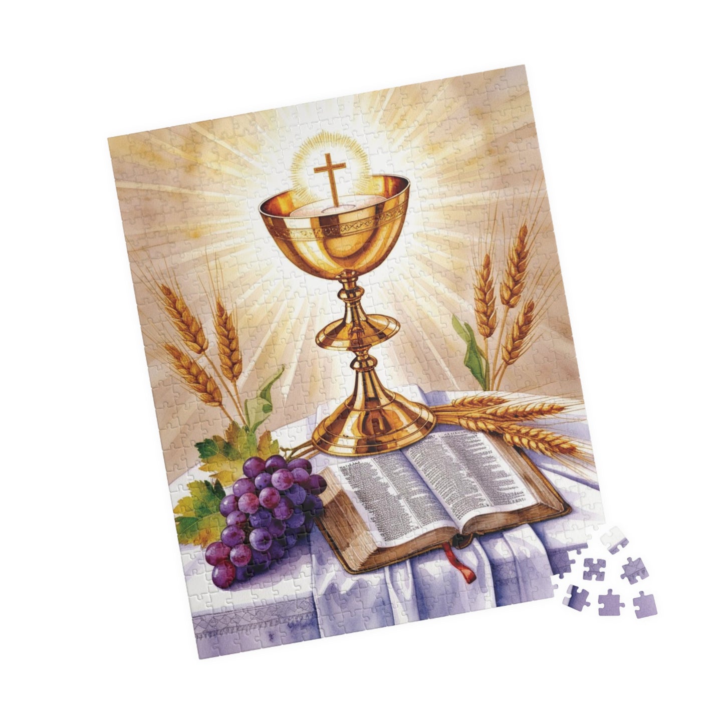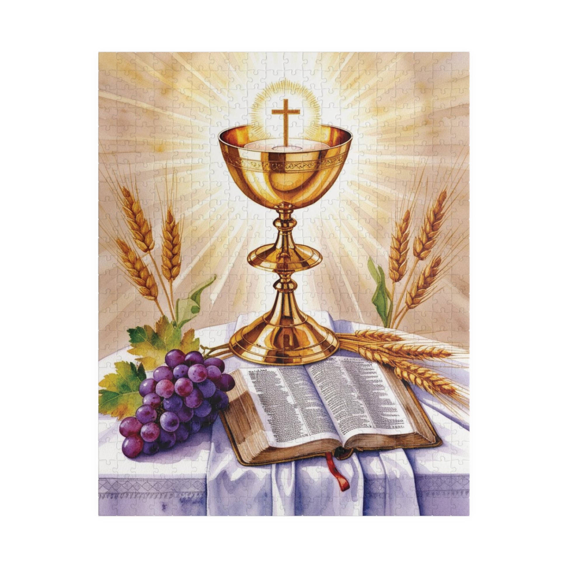 This Christian religious-themed puzzle features a golden chalice surrounded by rays of divine light, with grapes, wheat, and an open Bible on a white altar cloth. Perfect for those seeking a serene and spiritual atmosphere in their daily lives. Ideal for Christians looking for a meaningful and thoughtful gift, suitable for religious holidays and celebrations.