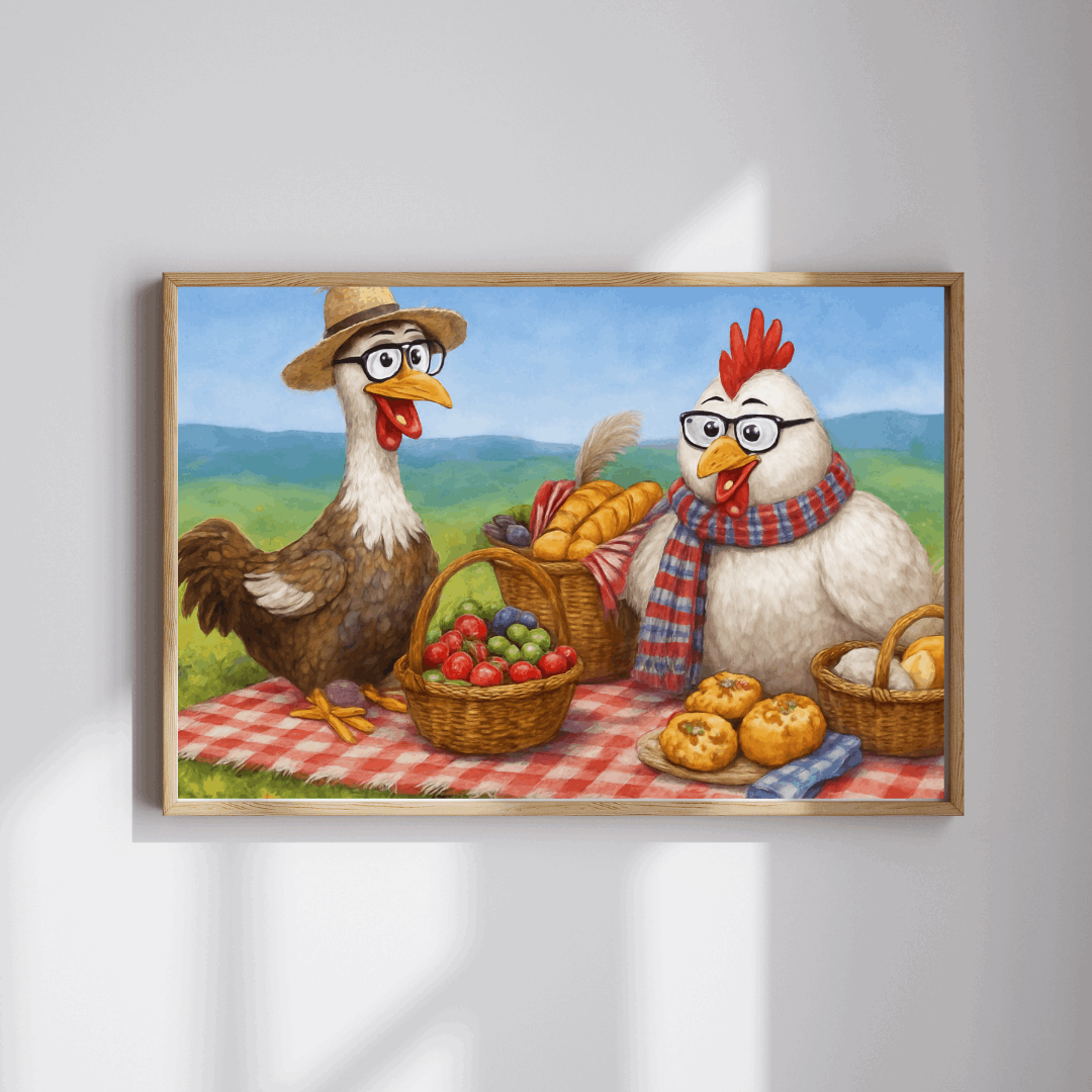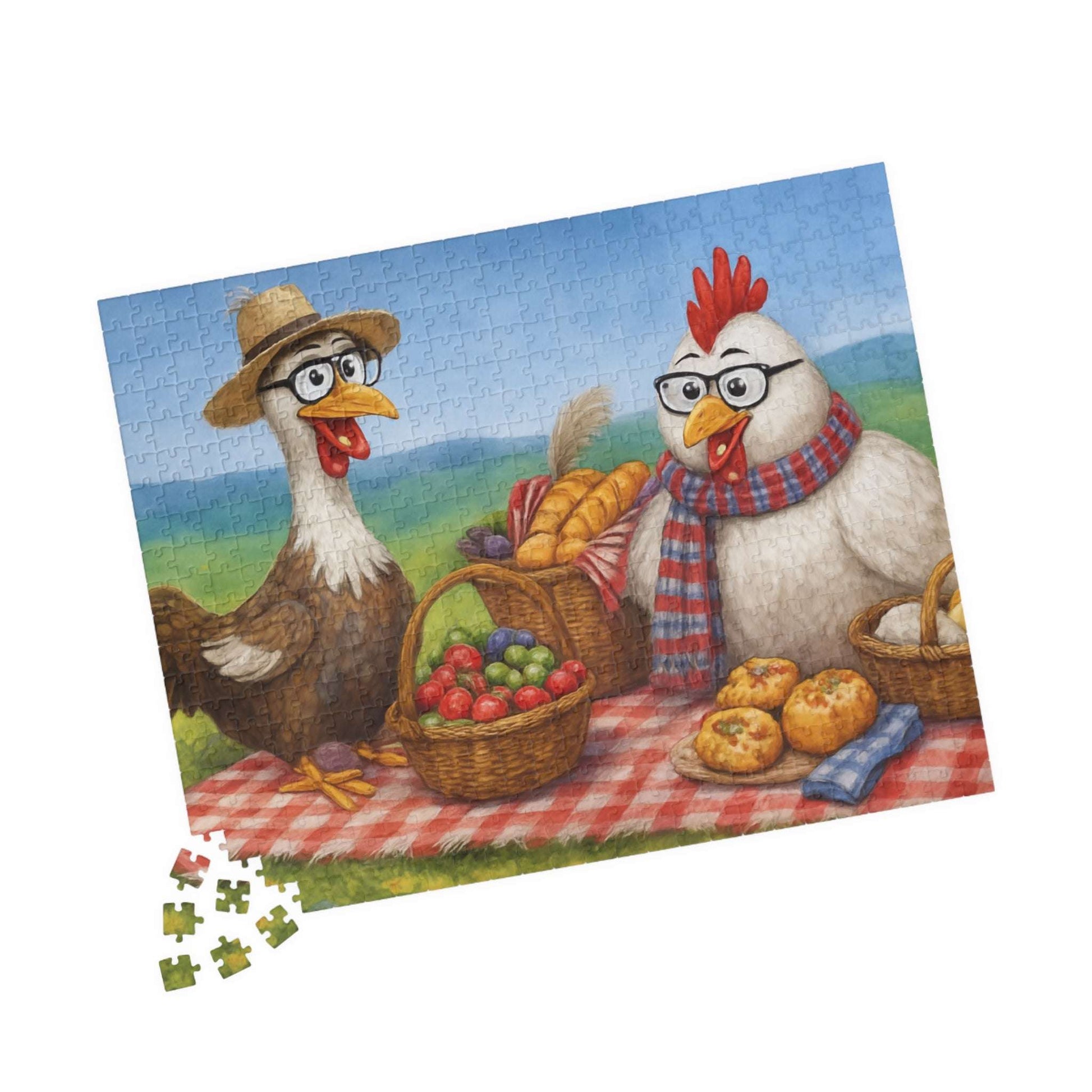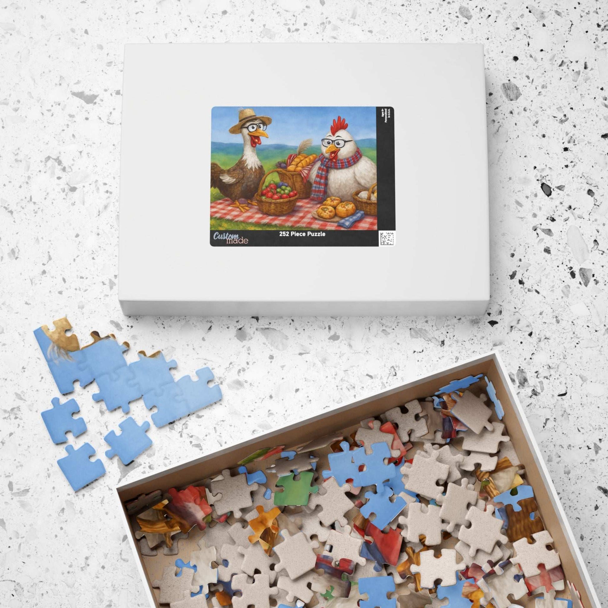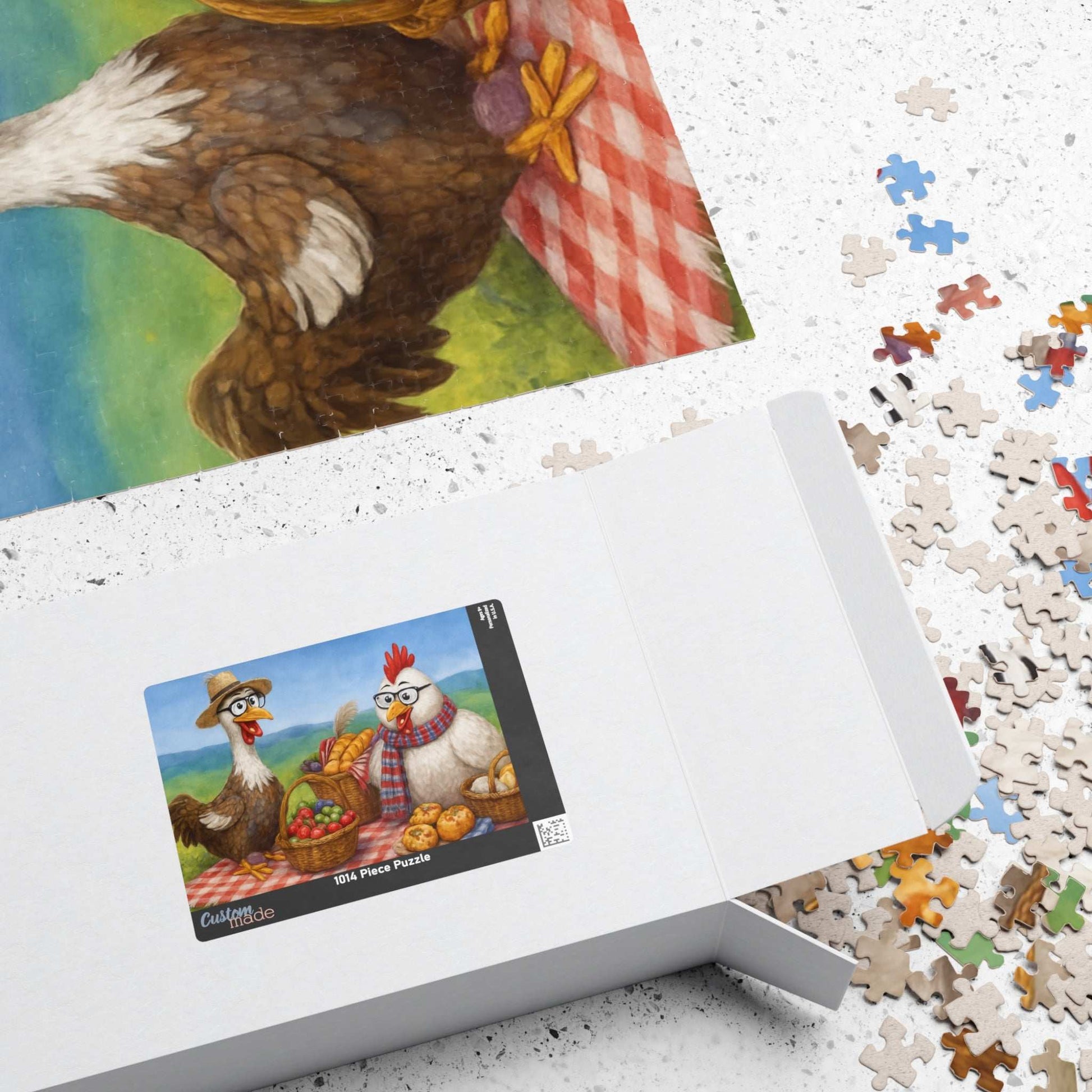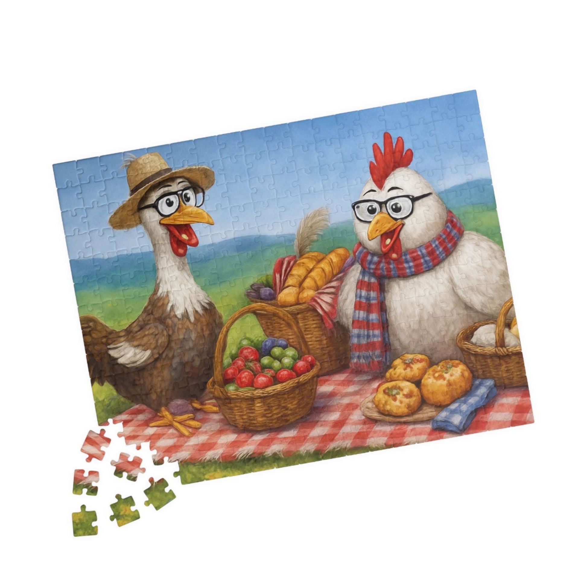 This is a delightful puzzle that captures the playful charm of a sunny farmyard afternoon. Featuring a whimsical scene of a two chickens enjoying a lively picnic, this puzzle bursts with cheerful colors and charming details that will keep puzzlers smiling piece after piece. Perfect for family gatherings, rainy-day fun, or peaceful solo time, it offers a joyful escape into a lighthearted countryside world. Whether you’re a casual puzzler or a seasoned enthusiast, this puzzle makes a wonderful gift for birthdays, holidays, or simply to brighten someone’s day. Relax, laugh, and enjoy the satisfaction of bringing this adorable farmyard story to life—one piece at a time.