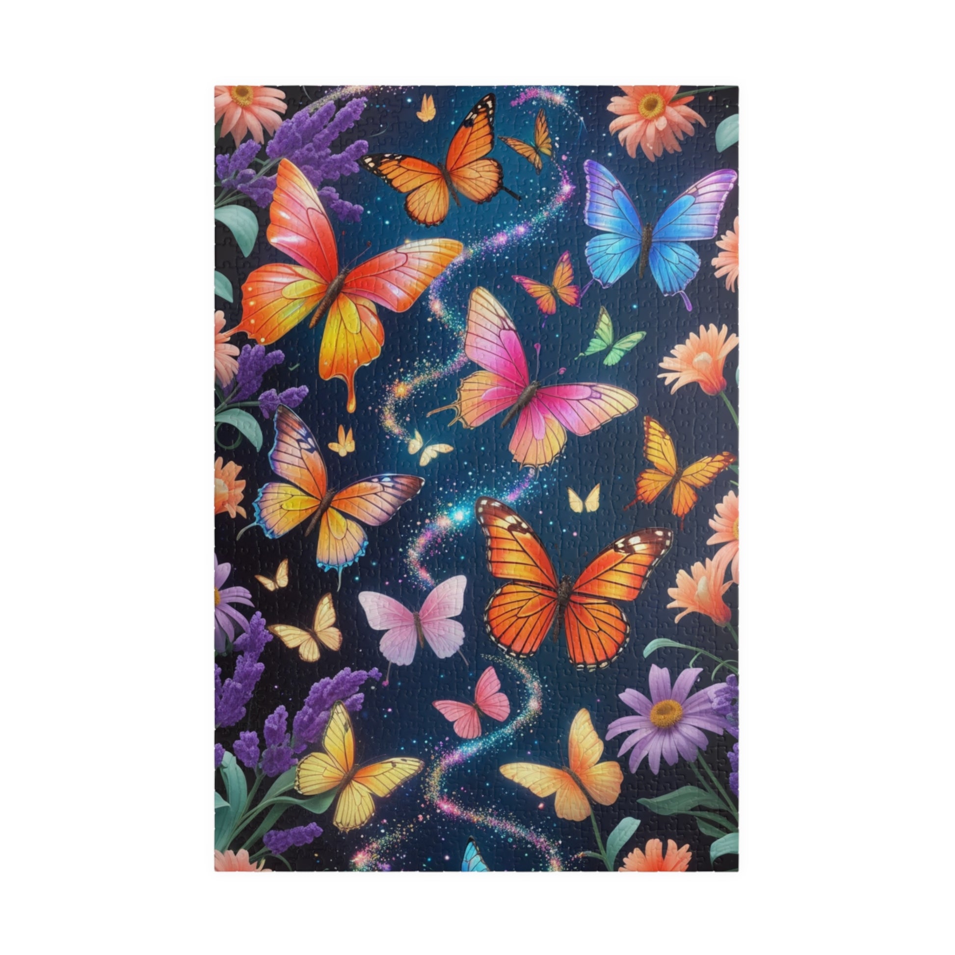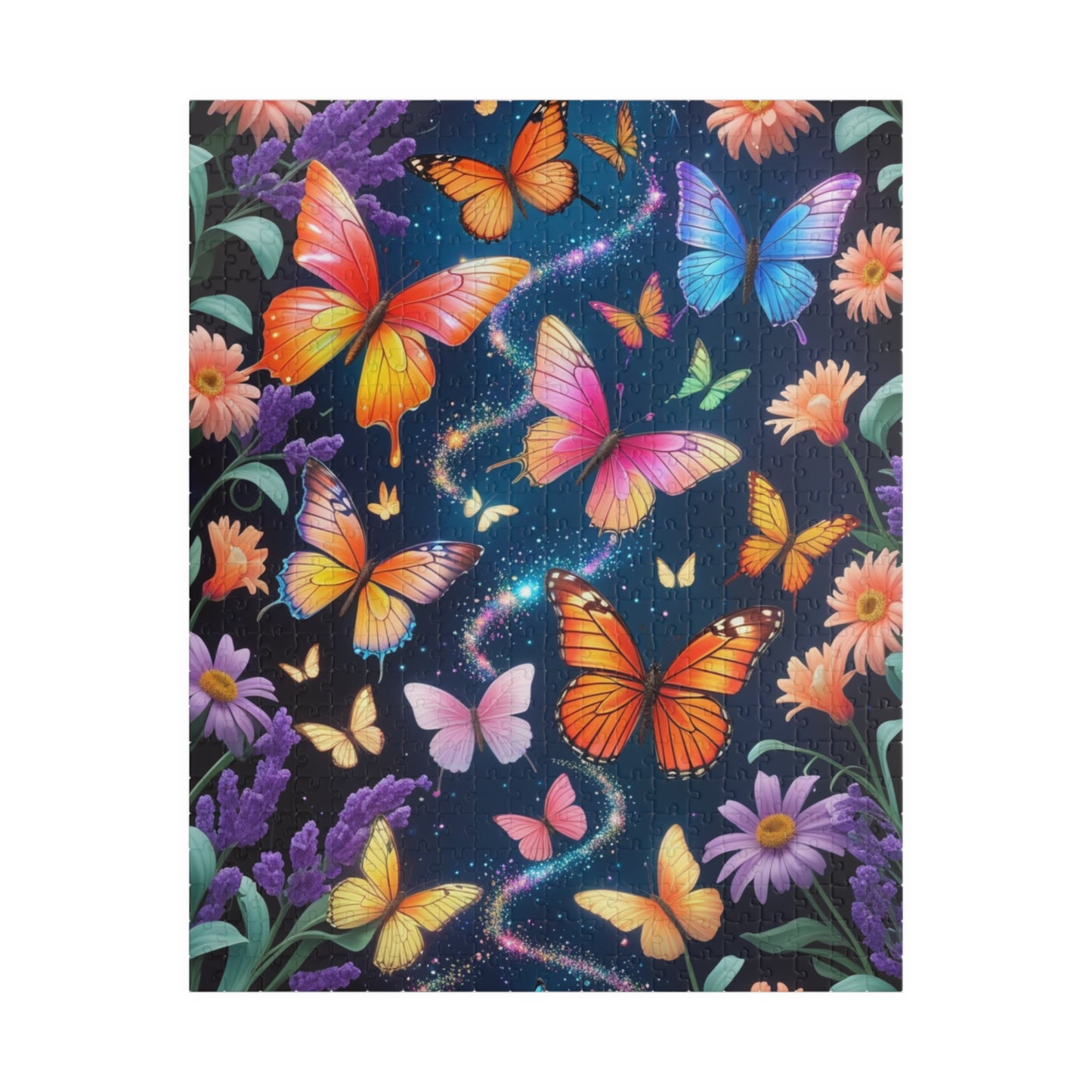 Dive into a world of whimsy with this vibrant puzzle featuring a fantastical collage of colorful butterflies and lush wildflowers. Each butterfly boasts intricately detailed wings in a kaleidoscope of radiant hues—glowing oranges, soft pinks, cool blues, and more—set against a blooming floral background of lavender, peach, and mint green. Playful, twisting stems and leaves add dynamic movement to the scene, with butterflies delicately perched or soaring through the air, leaving sparkling, iridescent trails behind. This captivating design offers hours of joy and creativity, making it the perfect choice for puzzle lovers and nature enthusiasts alike.