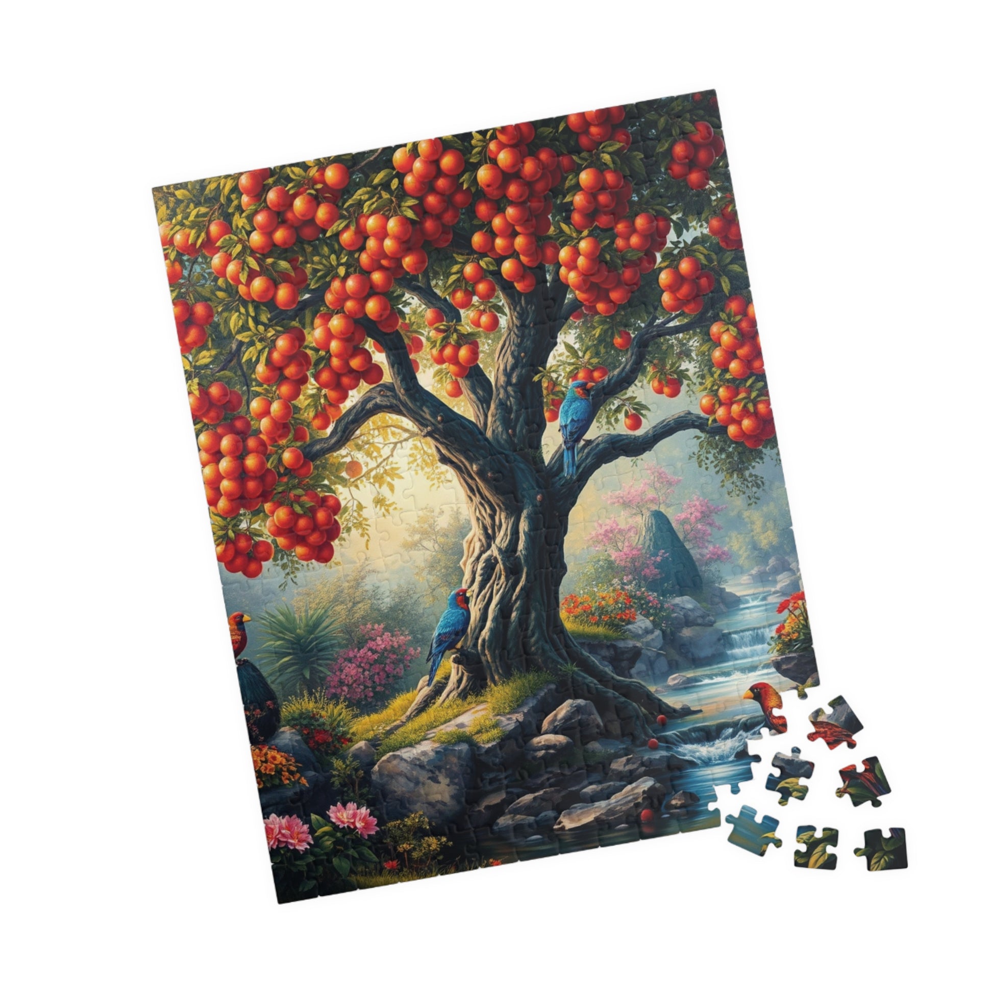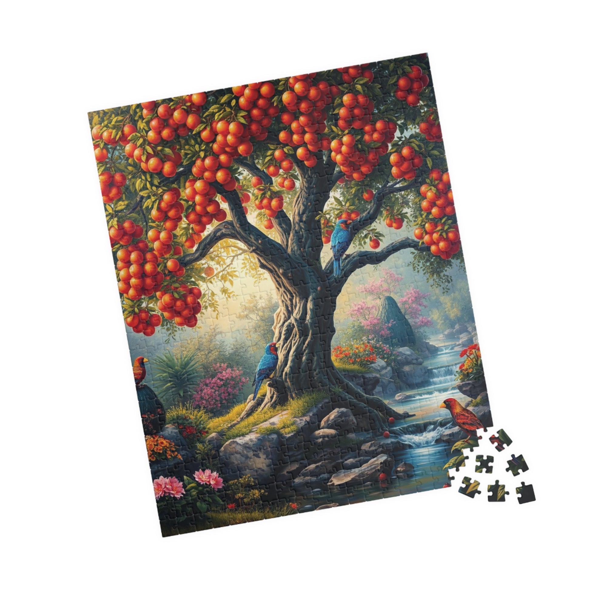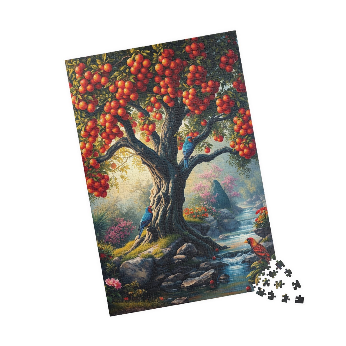 Immerse yourself in the biblical depiction of the Garden of Eden with a large fruit tree, stream, colorful birds, and flowers. Perfect for puzzle enthusiasts who enjoy vibrant and intricate designs. Ideal for gifting during holidays and special occasions such as Christmas and birthdays.