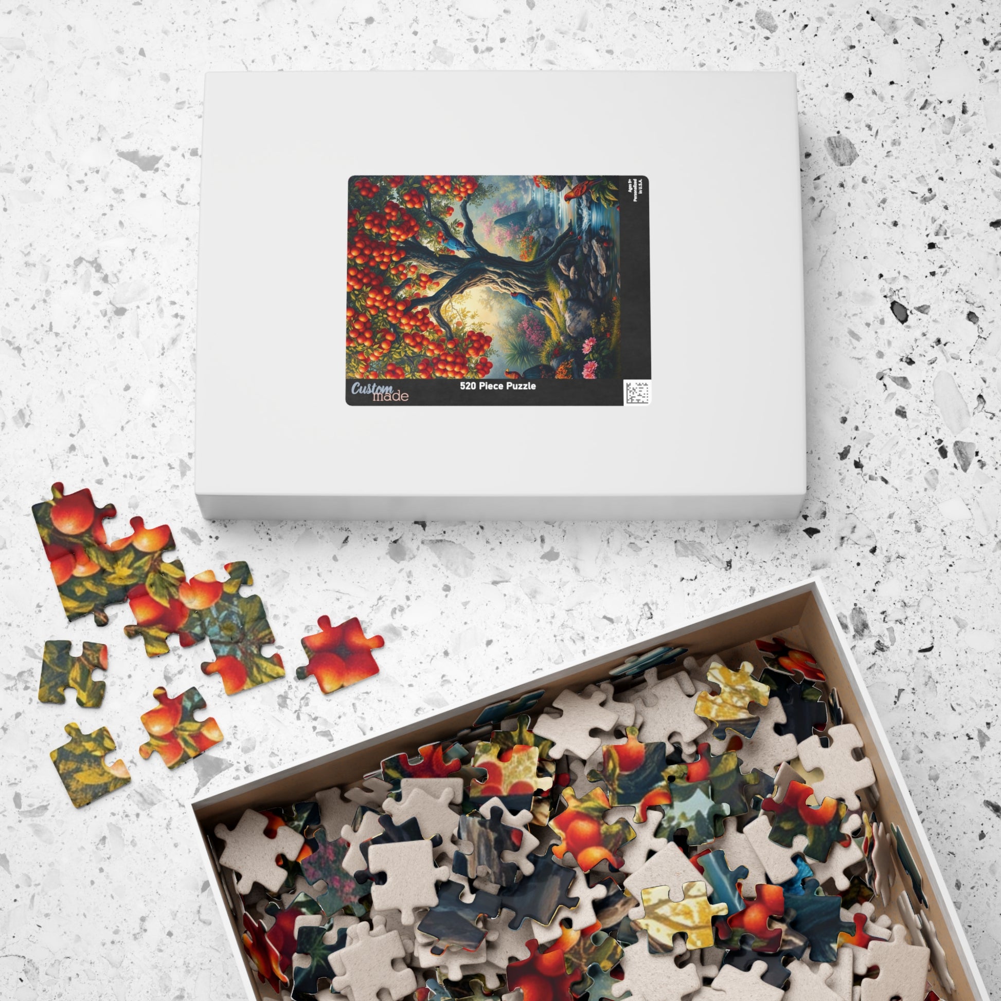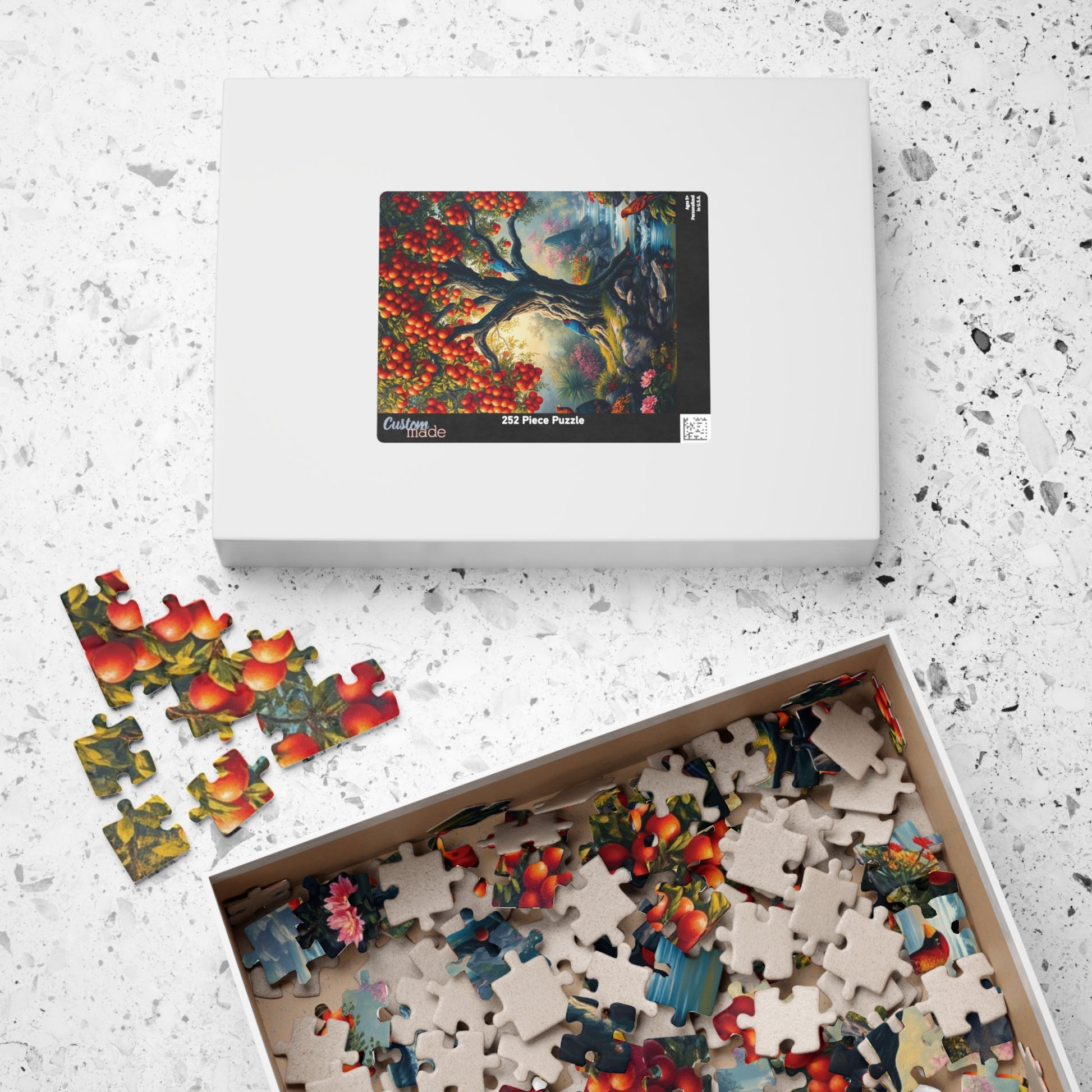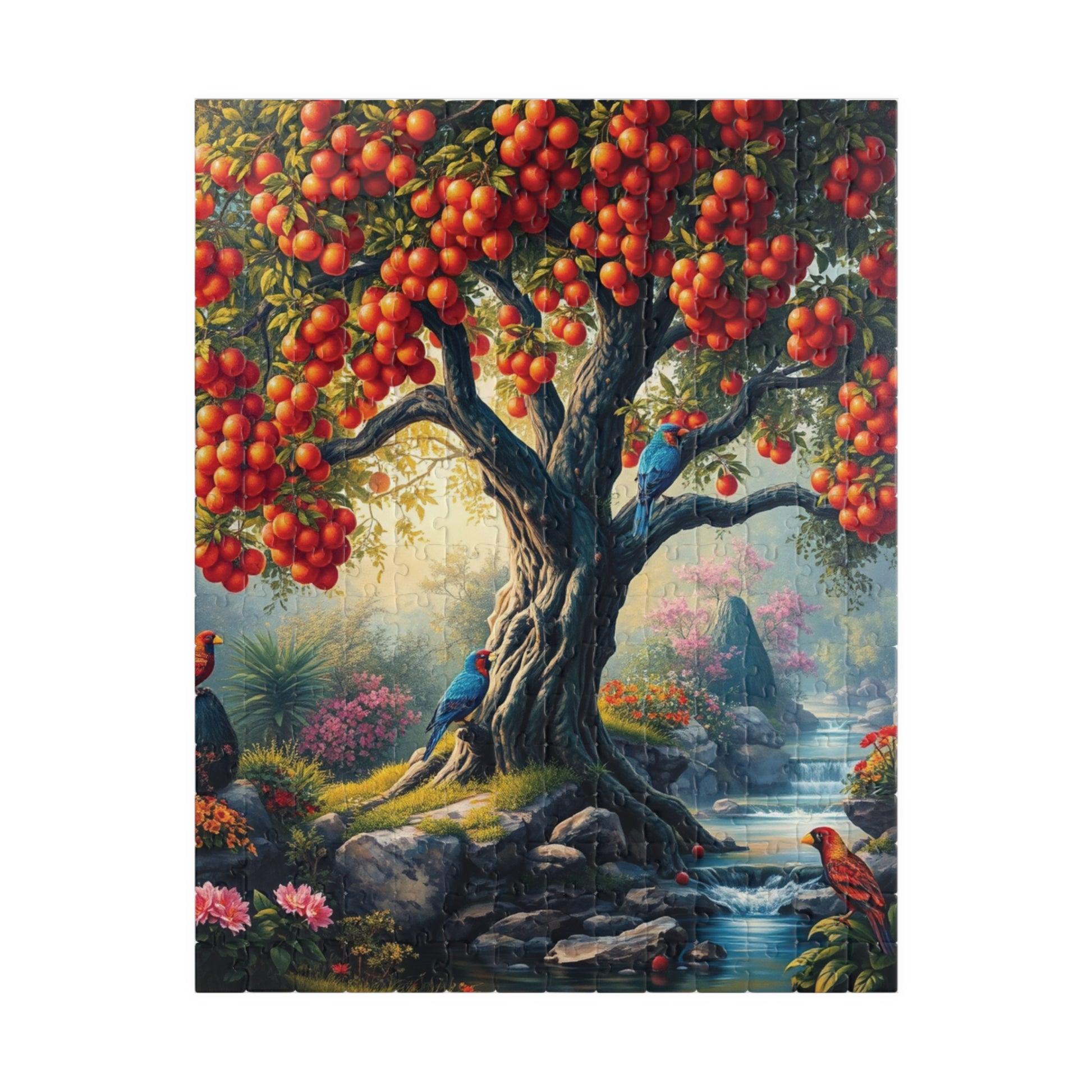 Immerse yourself in the biblical depiction of the Garden of Eden with a large fruit tree, stream, colorful birds, and flowers. Perfect for puzzle enthusiasts who enjoy vibrant and intricate designs. Ideal for gifting during holidays and special occasions such as Christmas and birthdays.