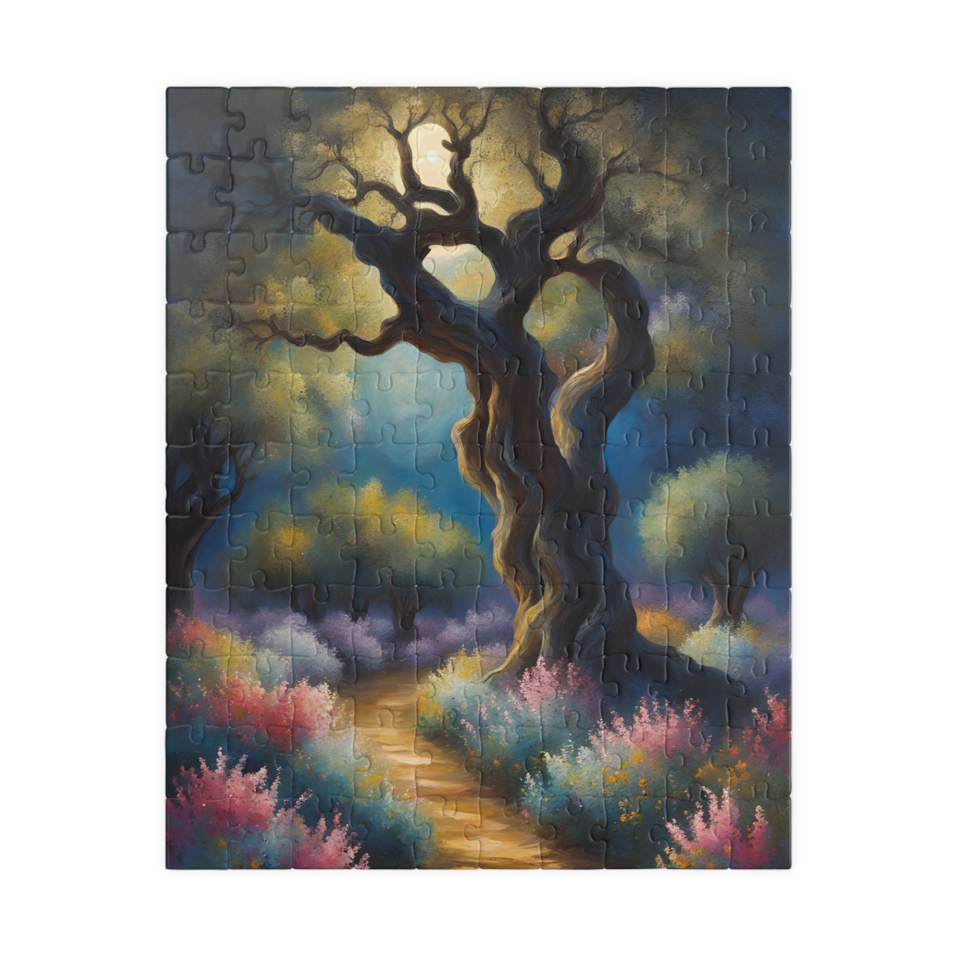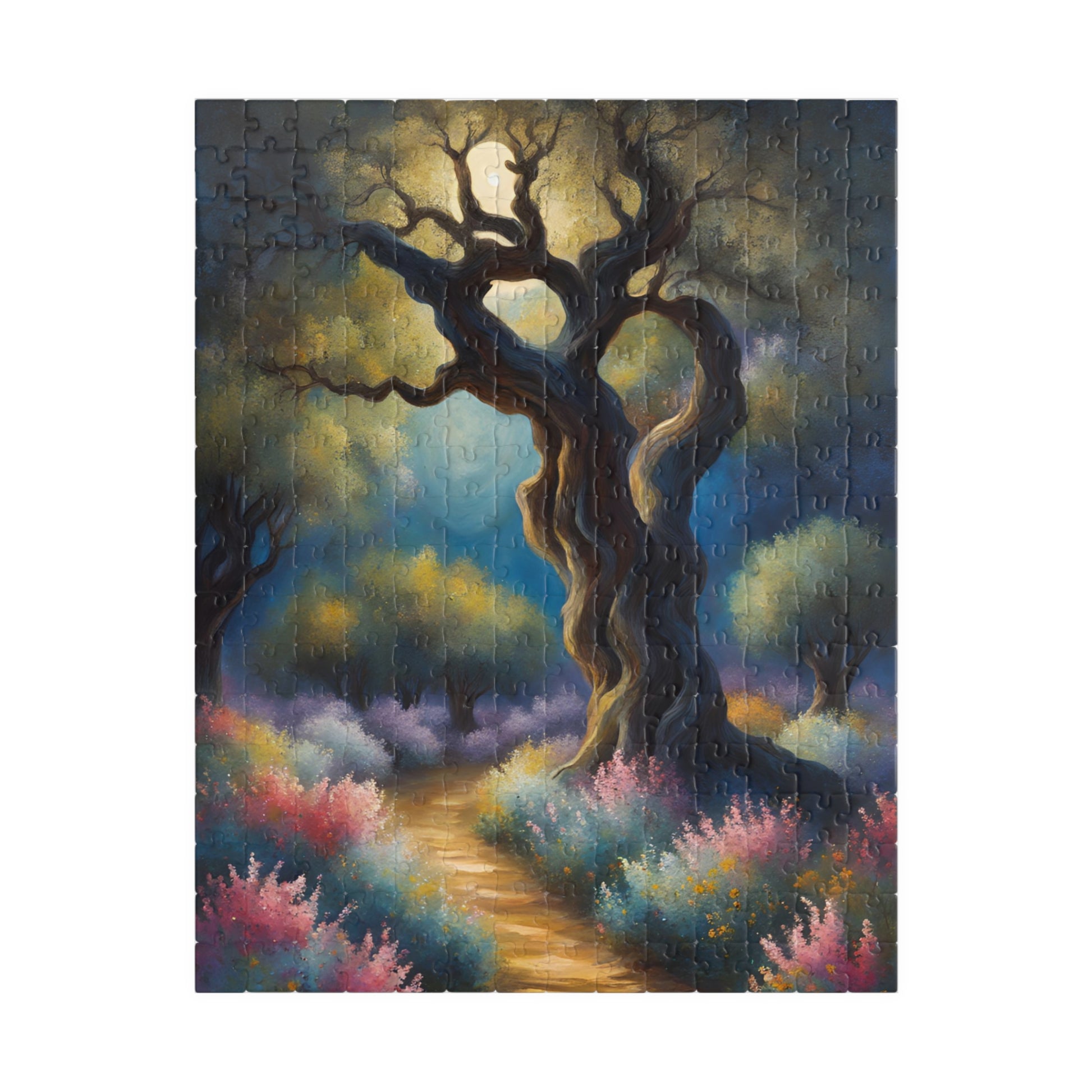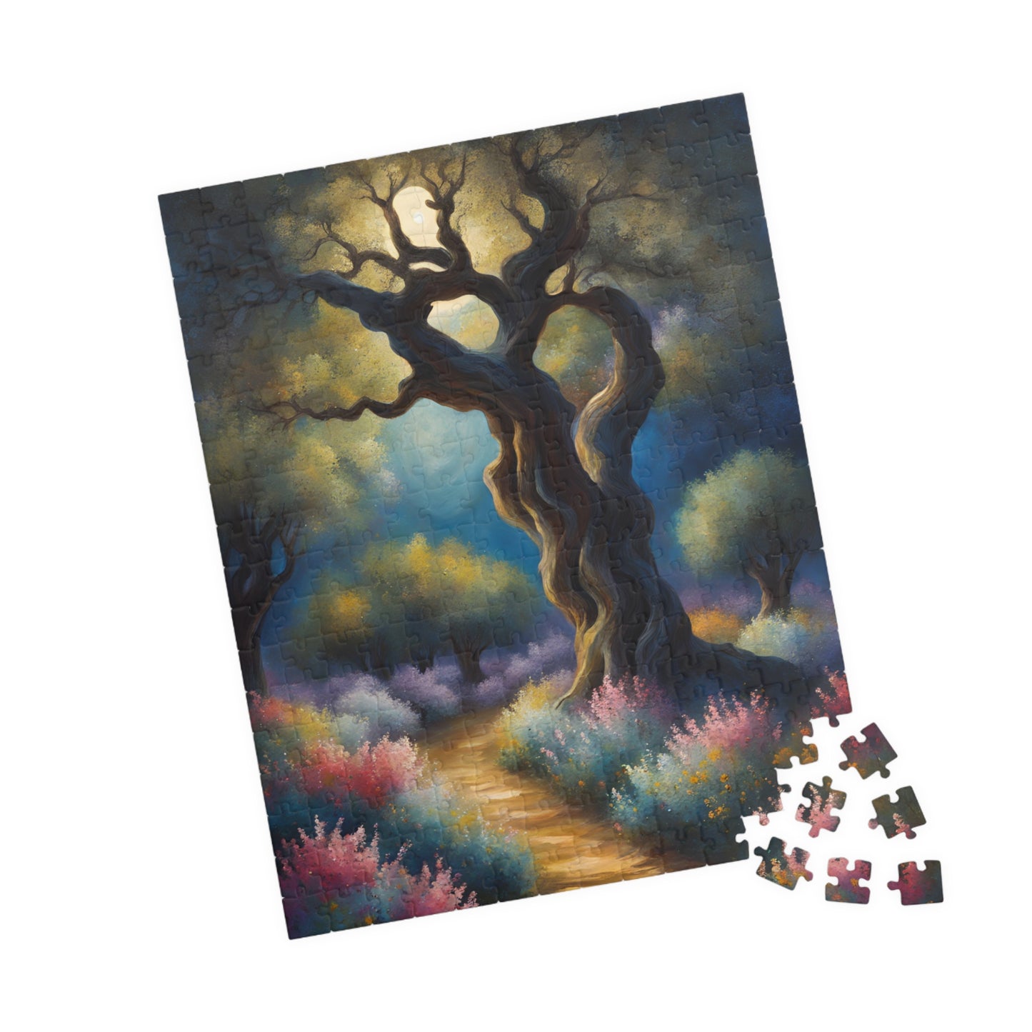 Escape to a tranquil moonlit garden with this stunning puzzle, featuring ancient olive trees standing tall and proud. Their gnarled trunks, twisted and deeply rooted in the earth, tell stories of resilience and time. Silvery leaves shimmer under the soft glow of the moon, while a gentle breeze whispers through the branches, creating an atmosphere of serene beauty and timeless peace. Perfect for nature lovers and puzzle enthusiasts, this captivating design offers a meditative journey with every piece. \