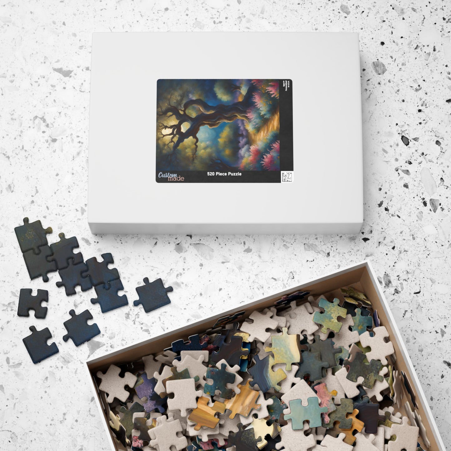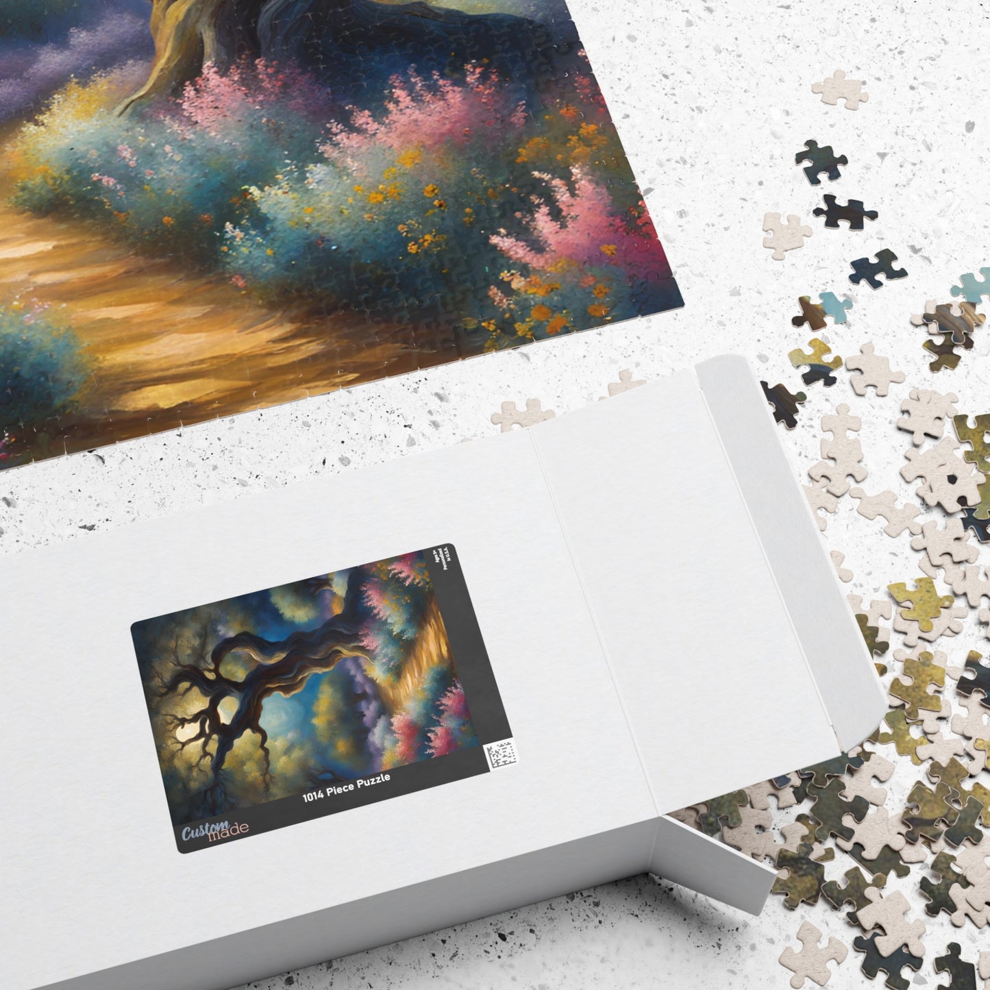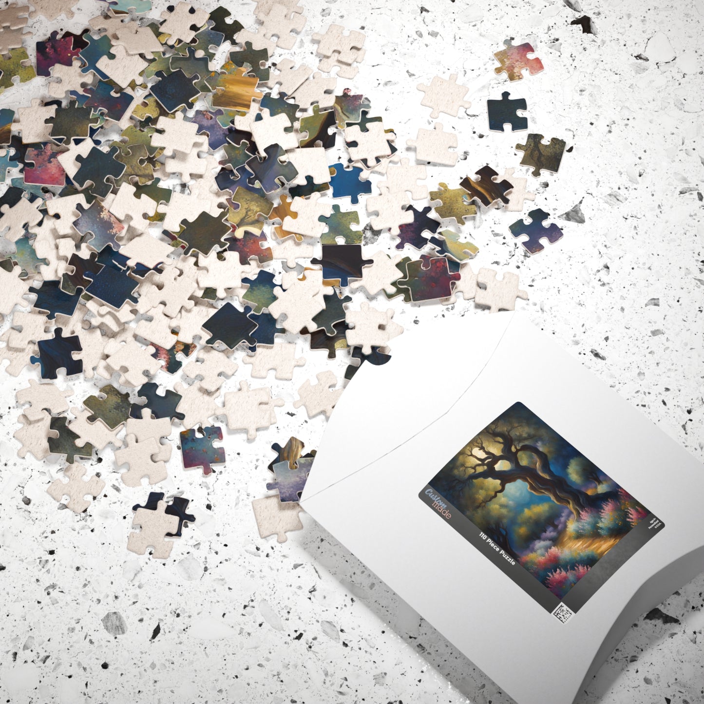 Escape to a tranquil moonlit garden with this stunning puzzle, featuring ancient olive trees standing tall and proud. Their gnarled trunks, twisted and deeply rooted in the earth, tell stories of resilience and time. Silvery leaves shimmer under the soft glow of the moon, while a gentle breeze whispers through the branches, creating an atmosphere of serene beauty and timeless peace. Perfect for nature lovers and puzzle enthusiasts, this captivating design offers a meditative journey with every piece. \