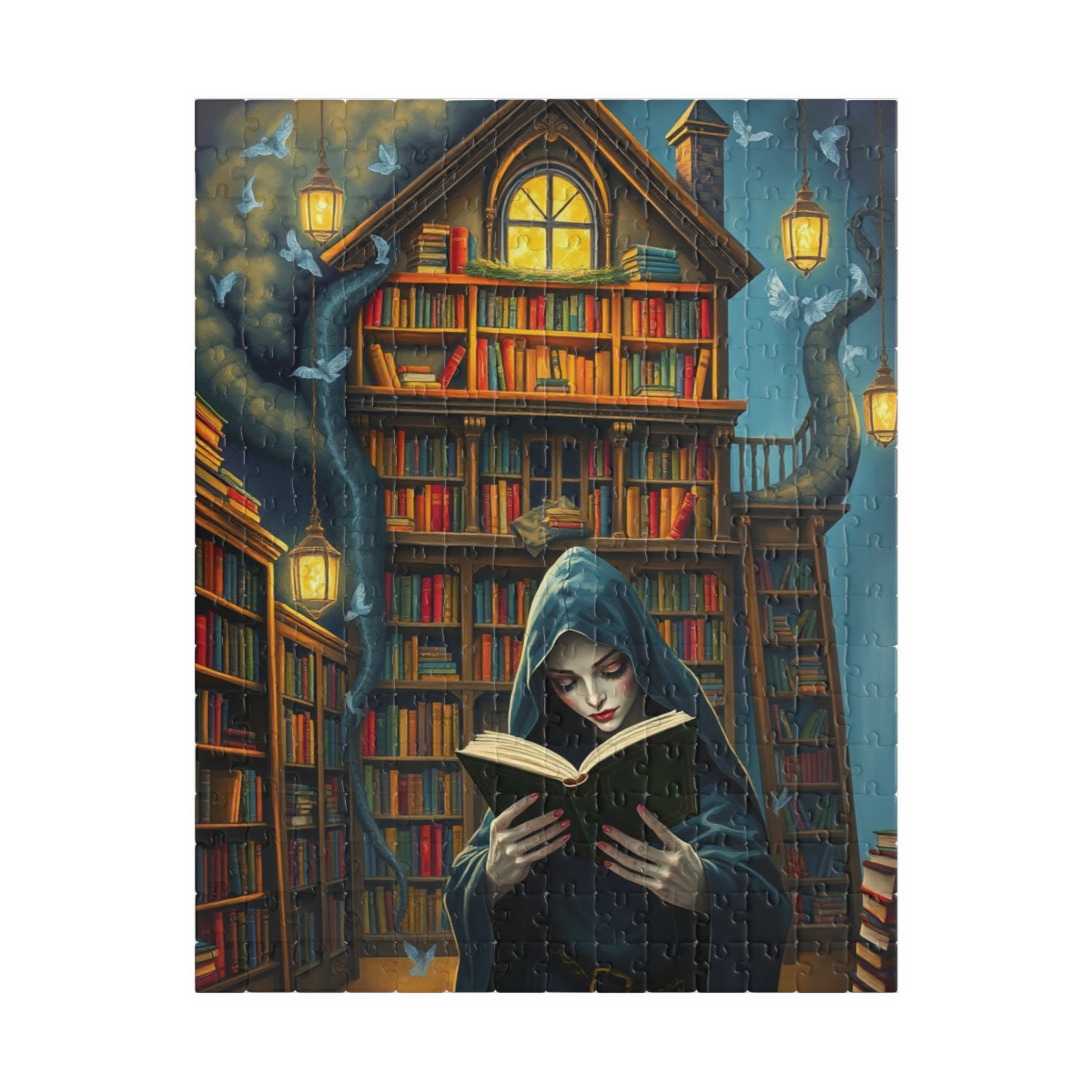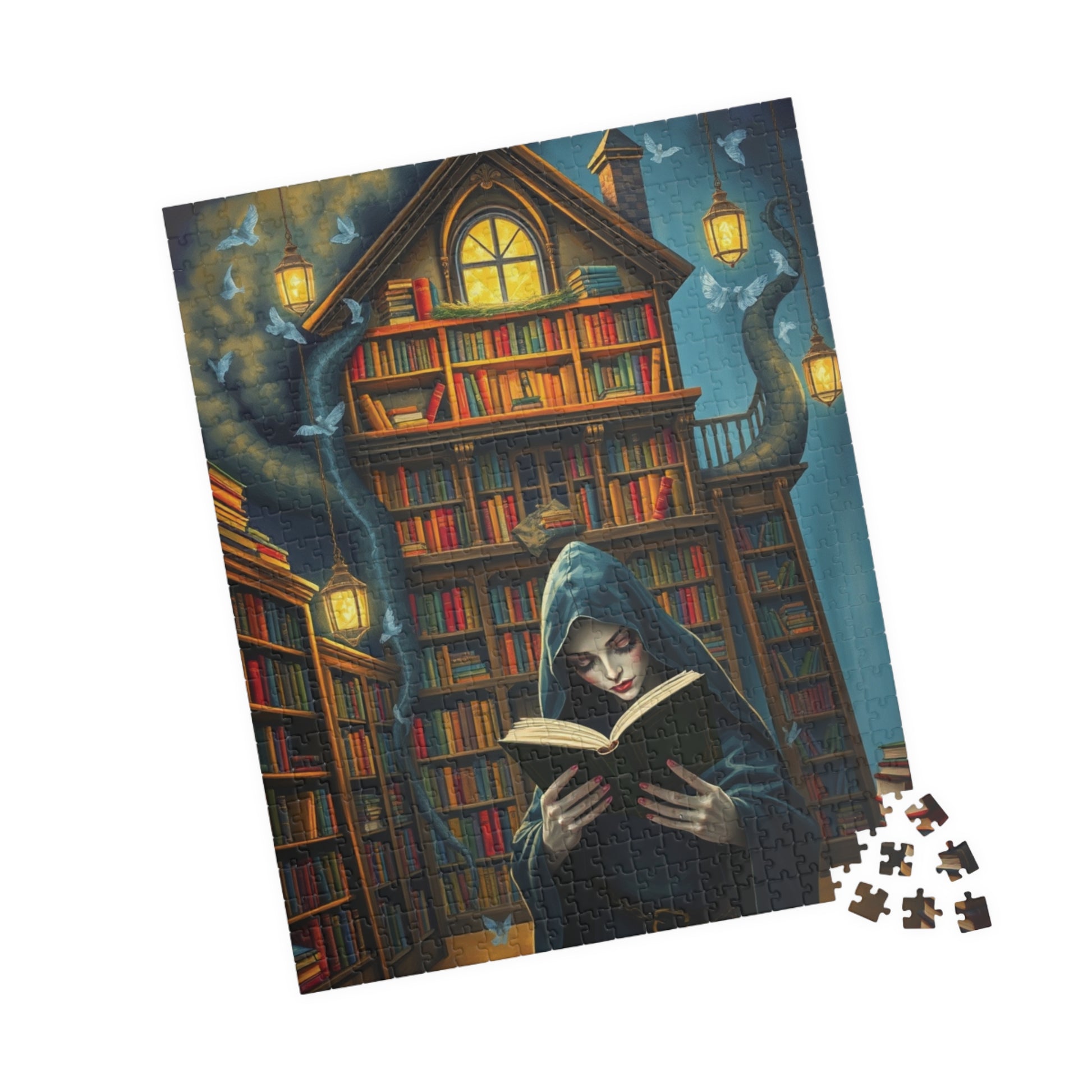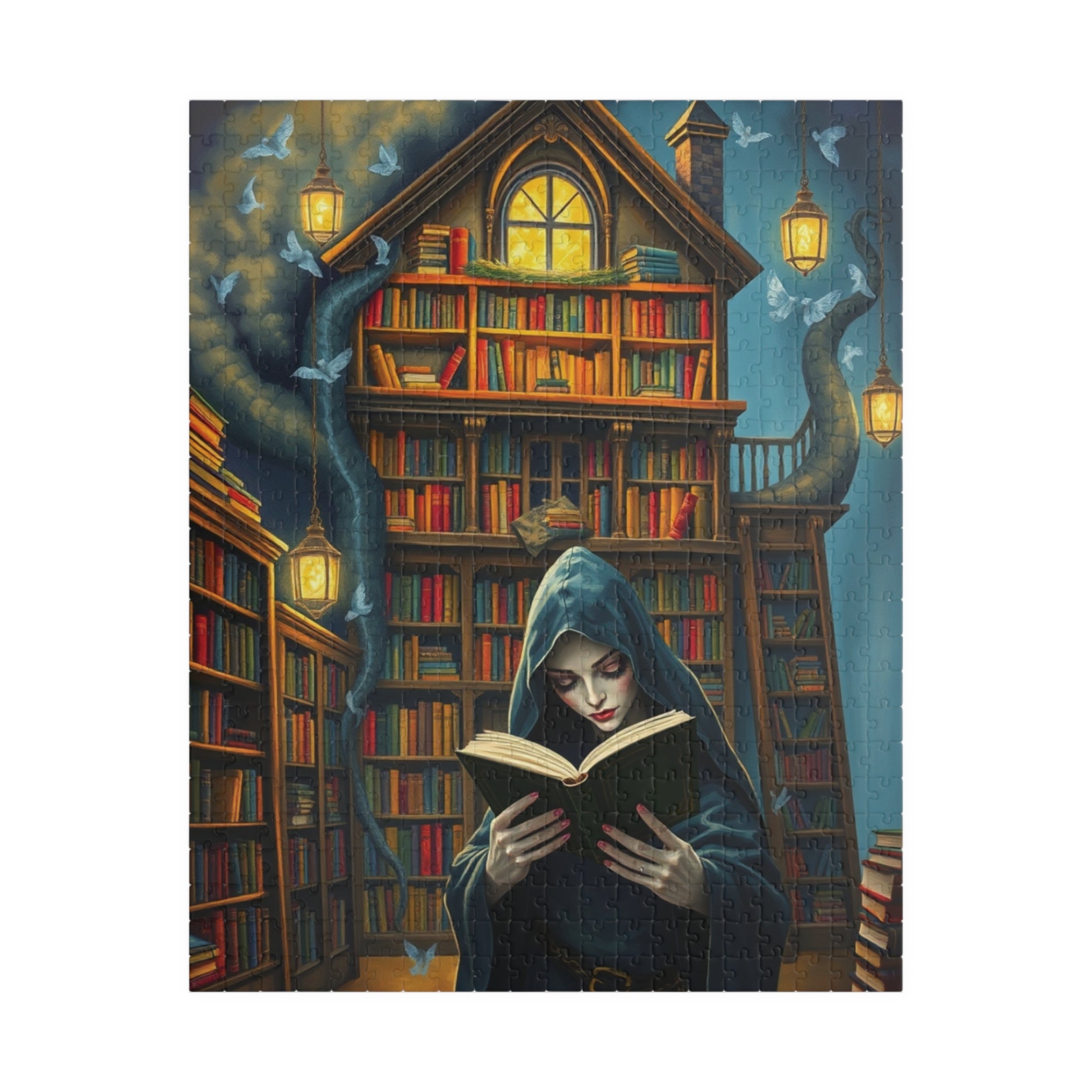 This gothic dark fantasy puzzle depicts a whimsical bookstore with a cloaked figure reading a book, creating an intense atmosphere. Perfect for those who love mysterious and fantasy-themed artwork, this puzzle is a great way to unwind and relax while challenging your mind. Ideal for gifting during Halloween, birthdays, or any occasion for puzzle enthusiasts.