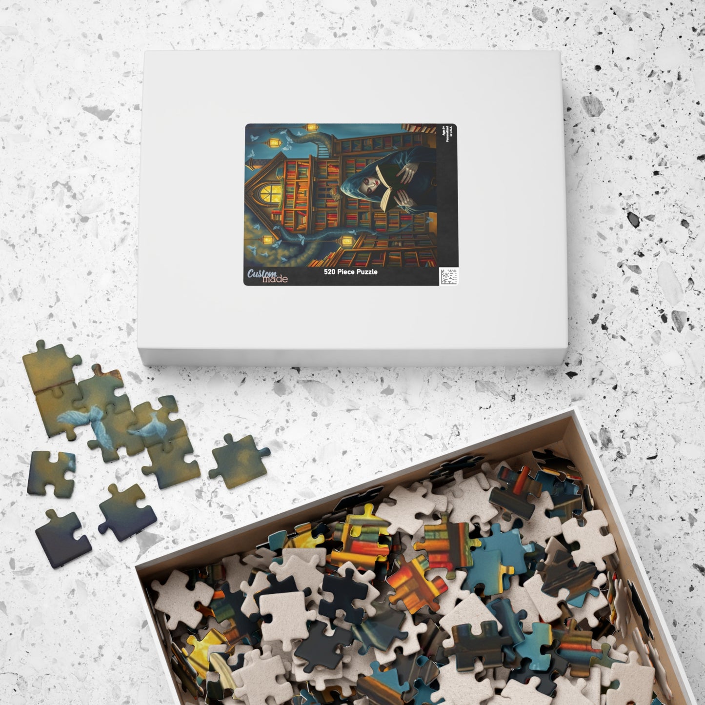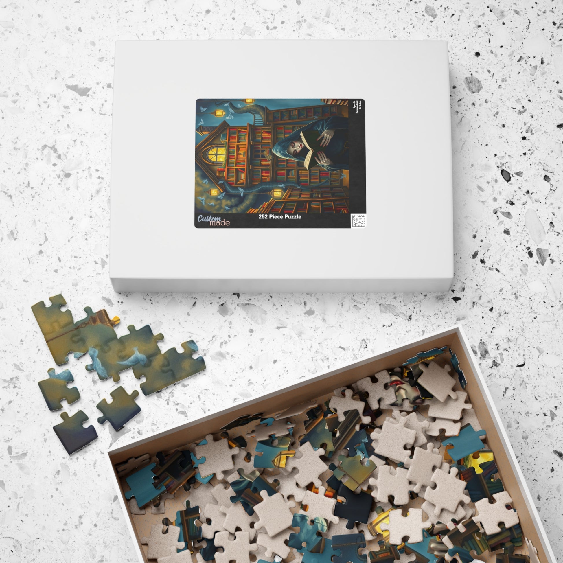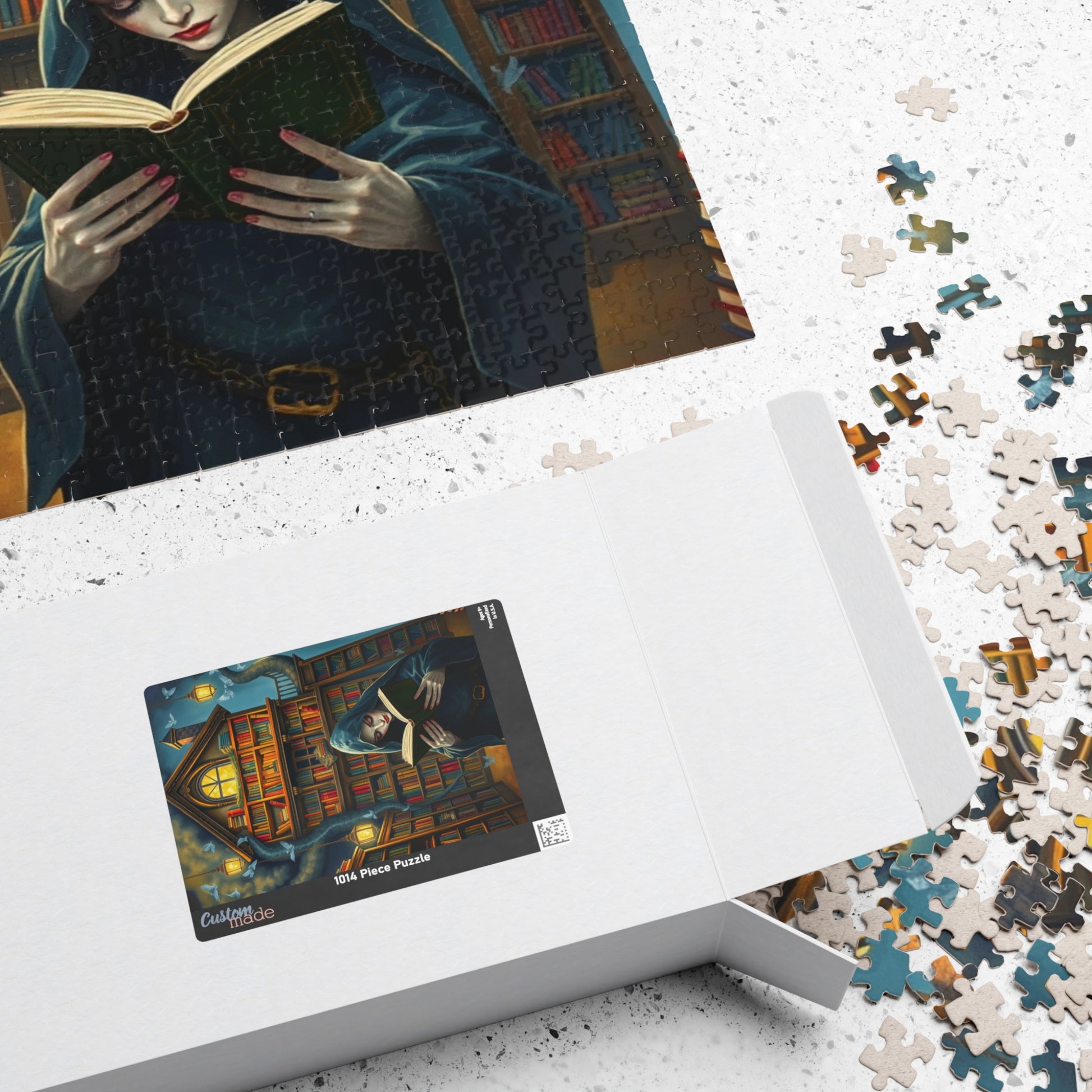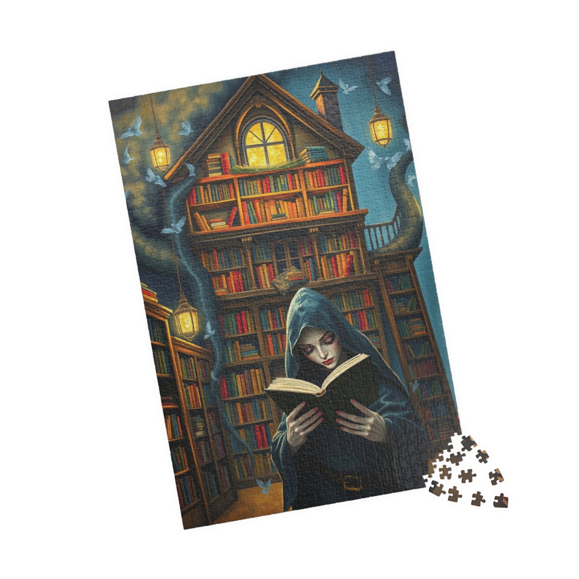 This gothic dark fantasy puzzle depicts a whimsical bookstore with a cloaked figure reading a book, creating an intense atmosphere. Perfect for those who love mysterious and fantasy-themed artwork, this puzzle is a great way to unwind and relax while challenging your mind. Ideal for gifting during Halloween, birthdays, or any occasion for puzzle enthusiasts.