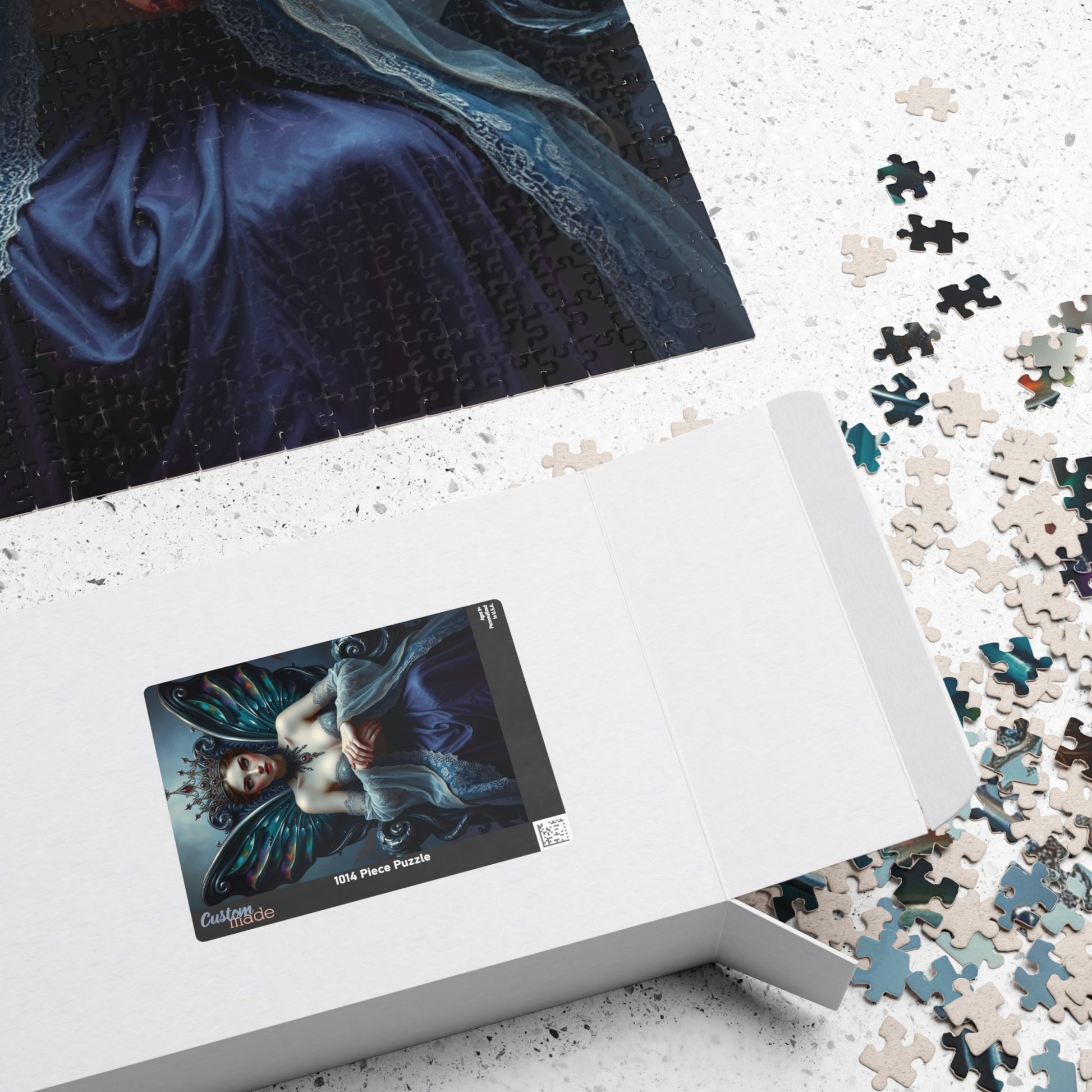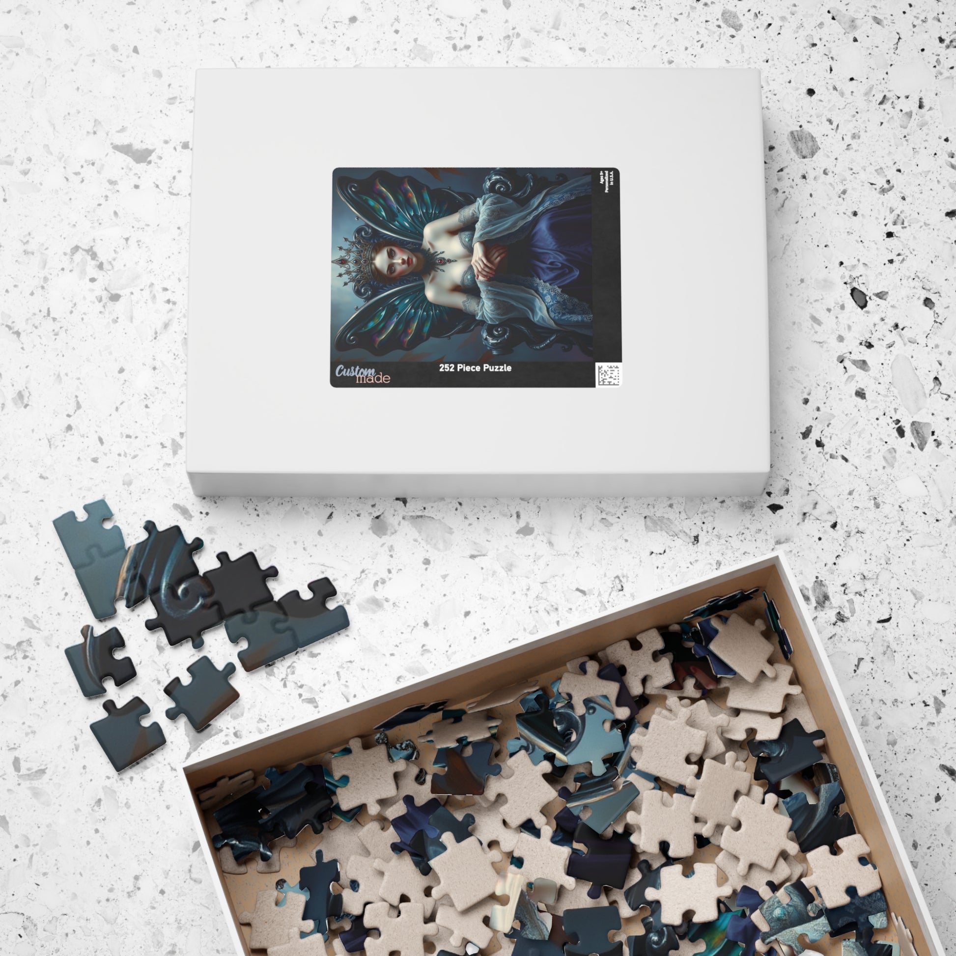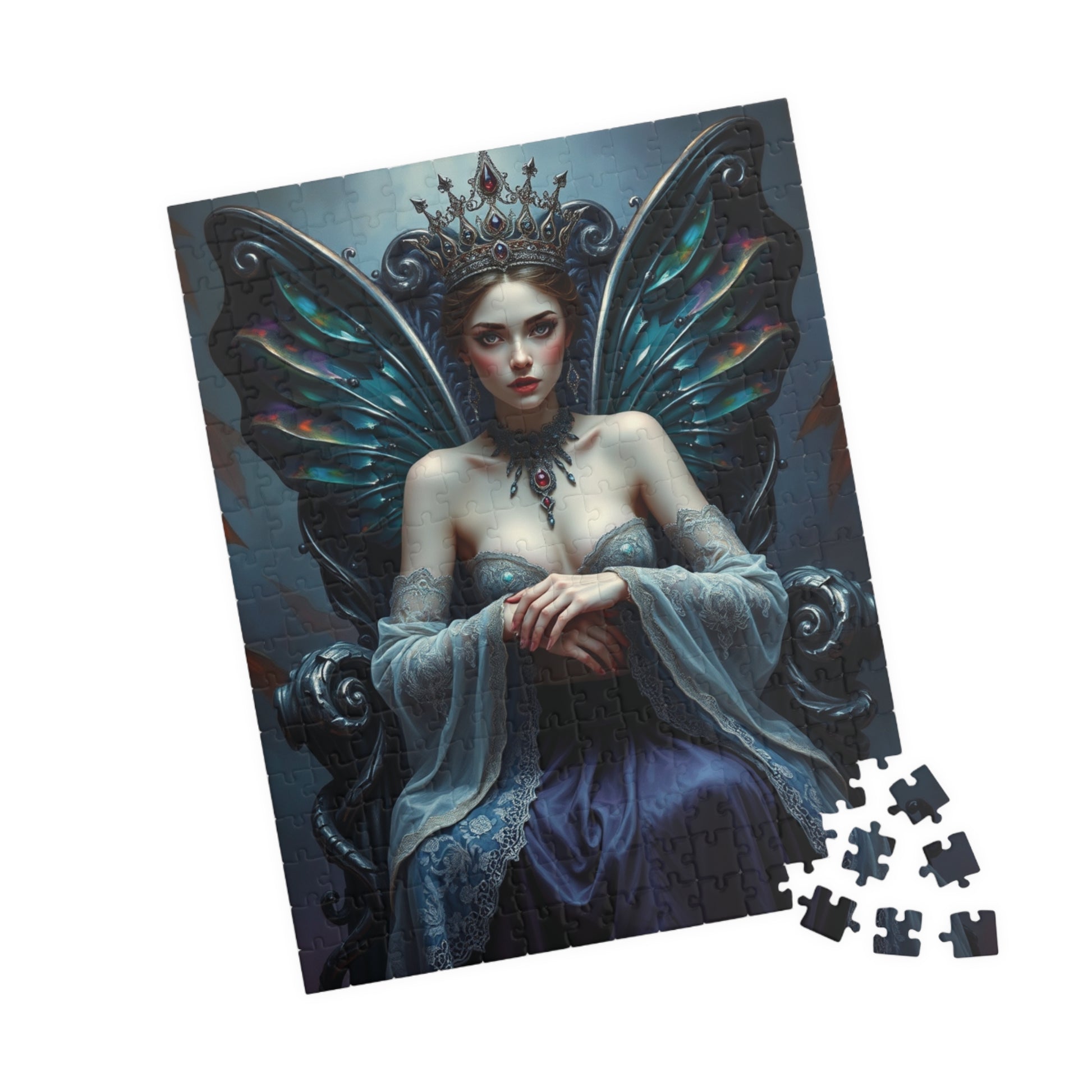 Engage in the mystery and elegance of the regal gothic fairy queen puzzle. With vibrant colors and a glossy finish, this puzzle features the fairy queen seated upon a twisted obsidian and silver throne, wearing a mesmerizing gown and crown. Perfect for puzzle enthusiasts who appreciate dark fantasy themes and intricate designs. Ideal for quiet evenings at home or as a unique gift for Halloween or fantasy lovers.