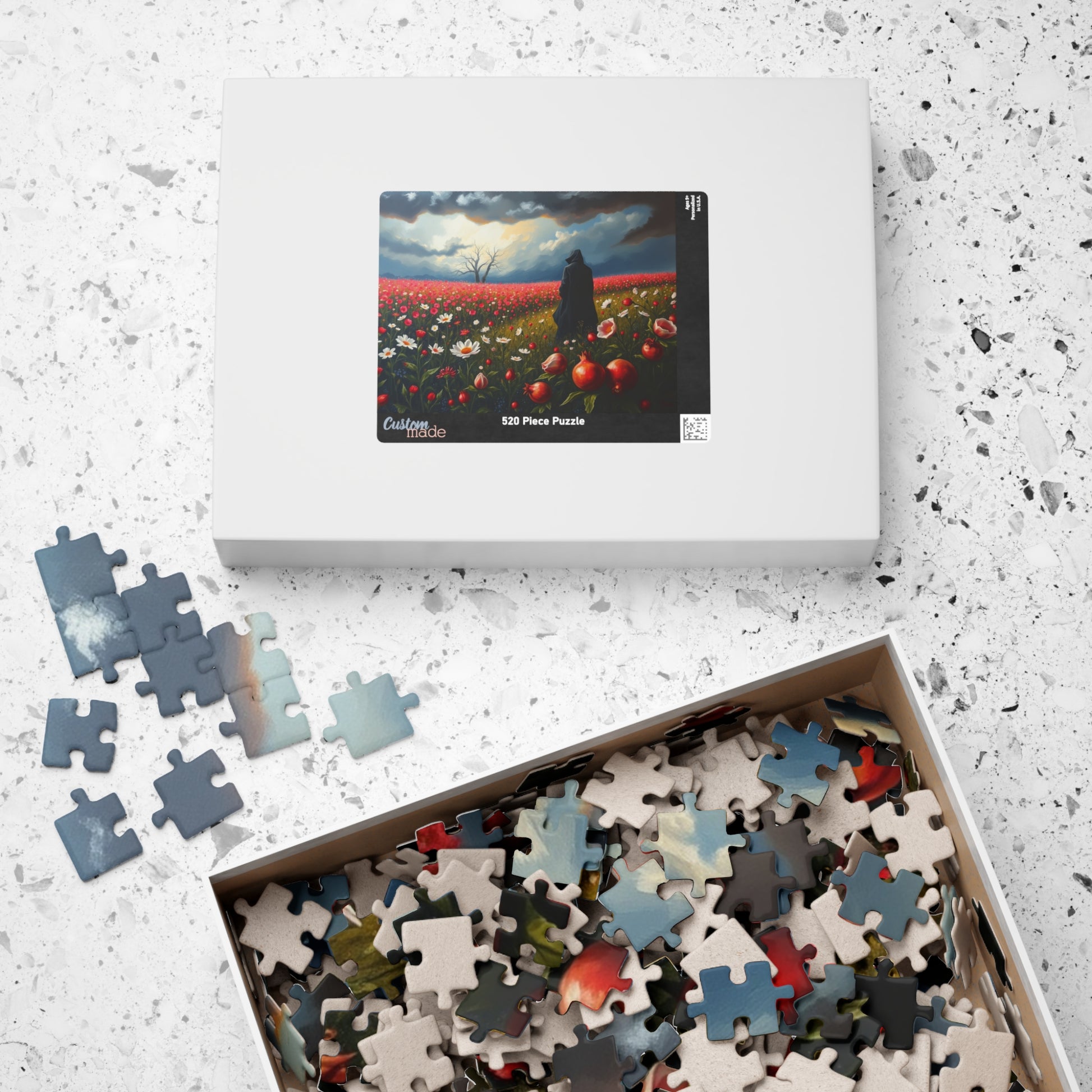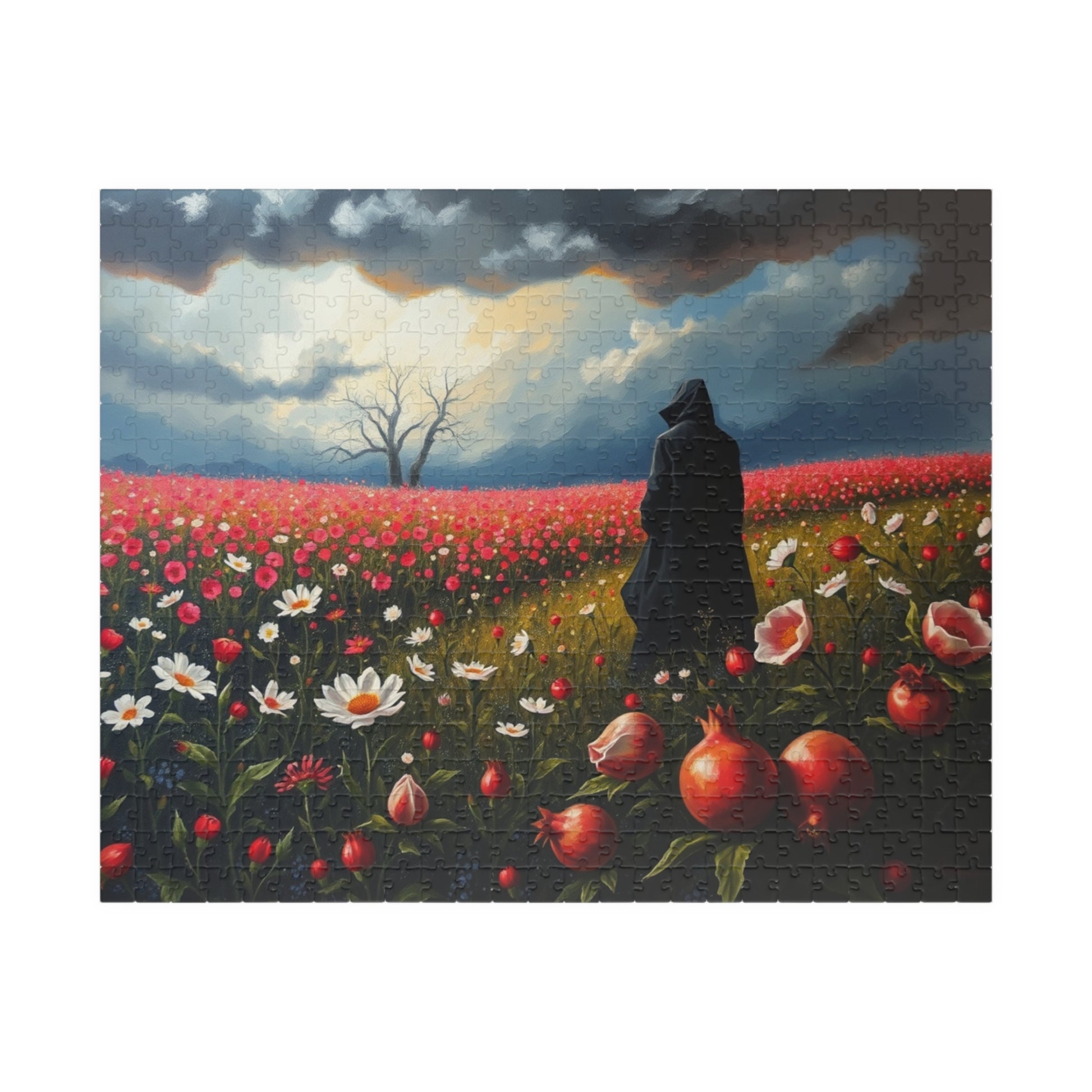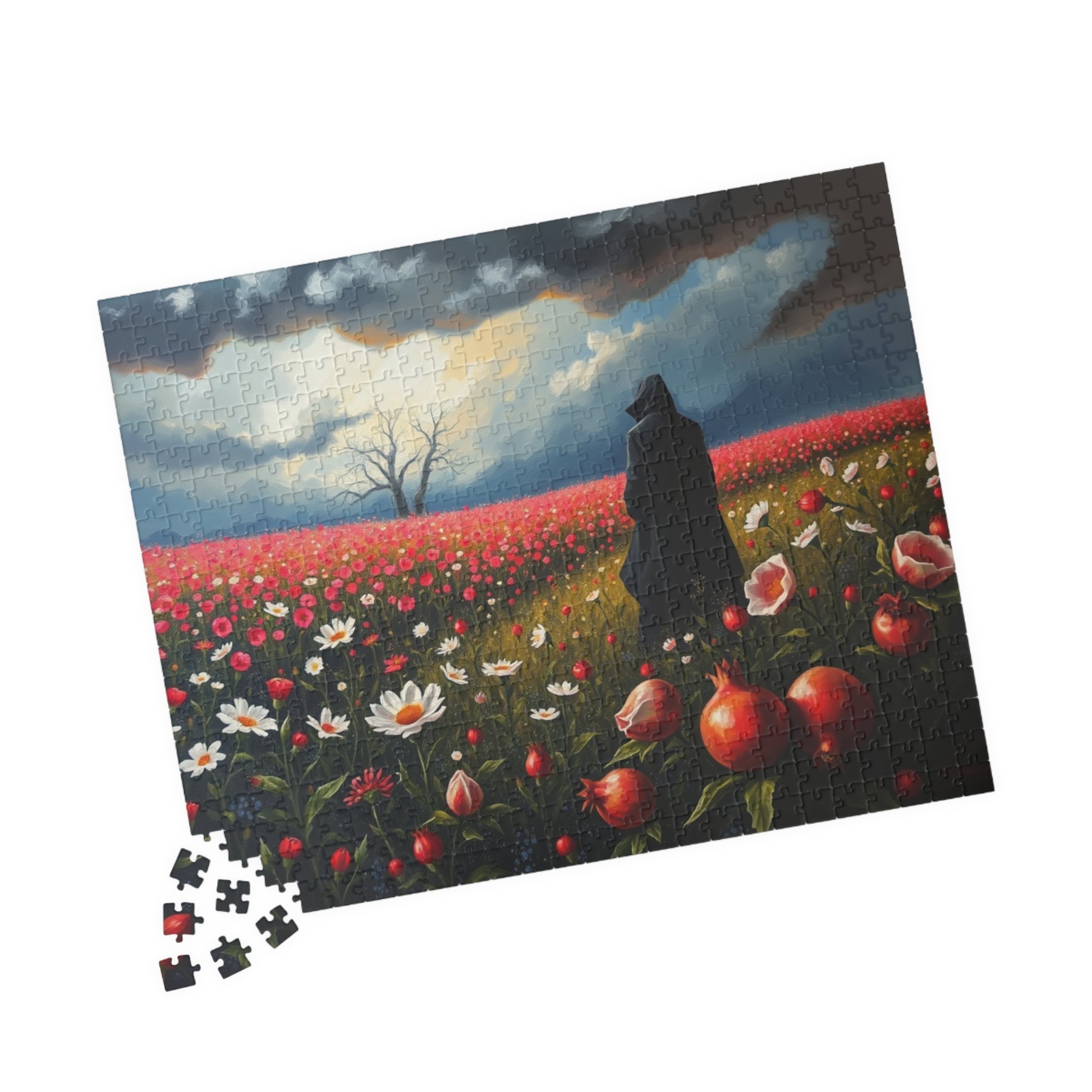 Gothic Jigsaw Puzzle, Lone Dark Figure in Blooming Flower Field, Challenging Puzzle for Adult, Artistic Activity Mindfulness Gift for Friend