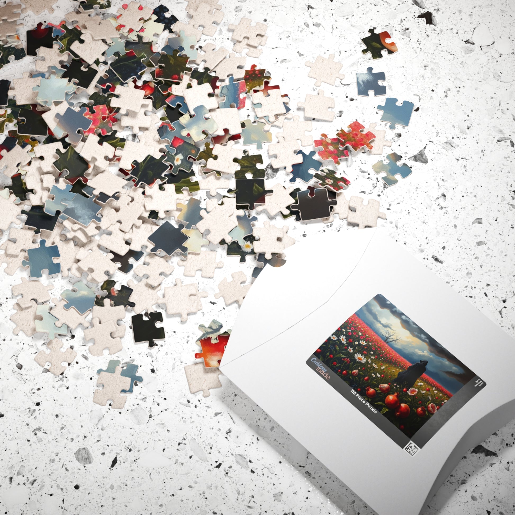 A mesmerizing puzzle featuring a lone, dark-clothed figure in the midst of a vibrant field of blooming flowers. Perfect for those who enjoy a challenge and love unique art pieces. Ideal for relaxing evenings at home or as a thoughtful gift for art lovers and puzzle enthusiasts. Relevant for birthdays, holidays, or any special occasion.
