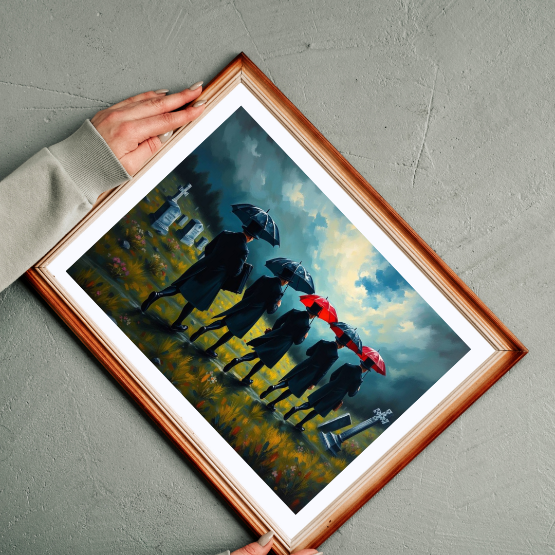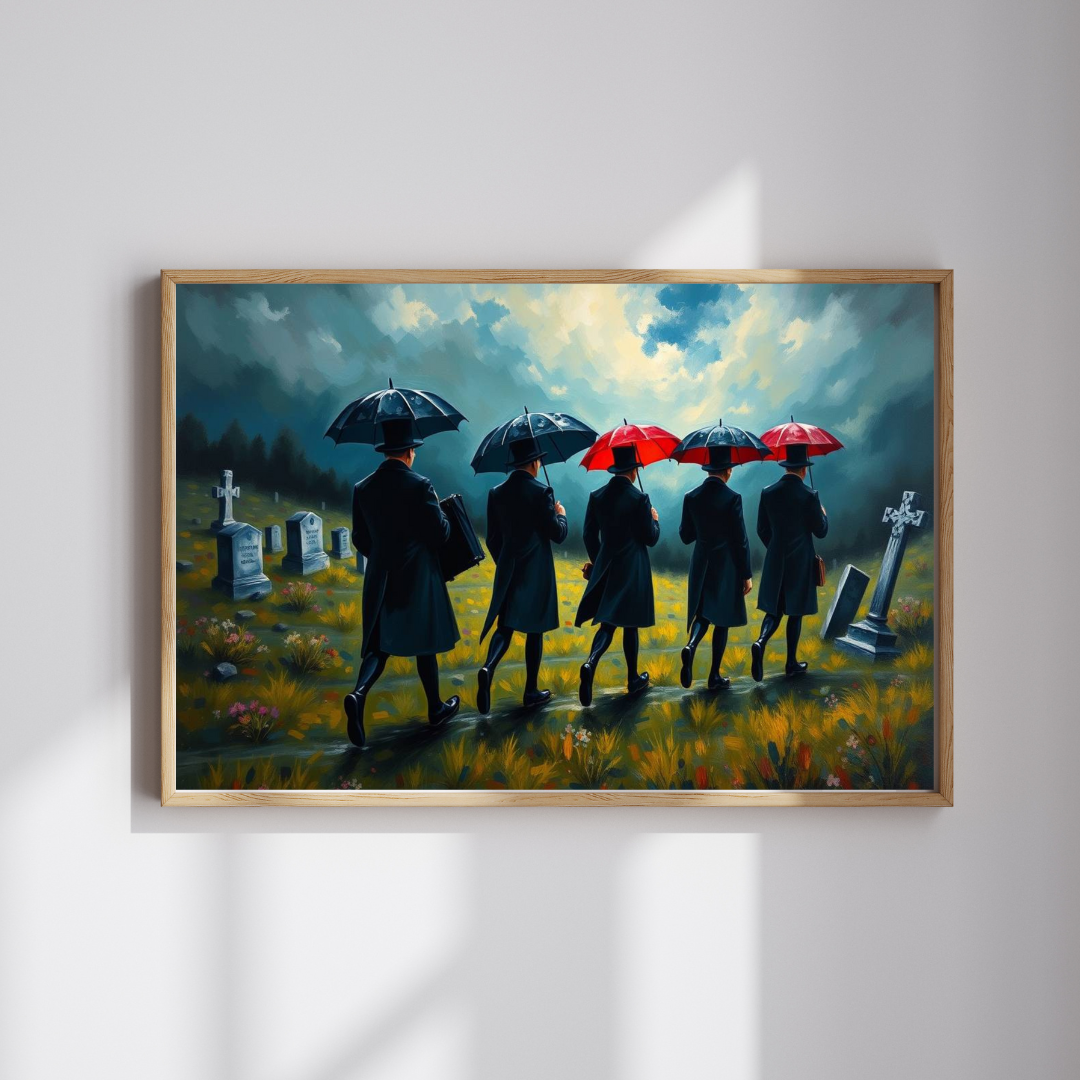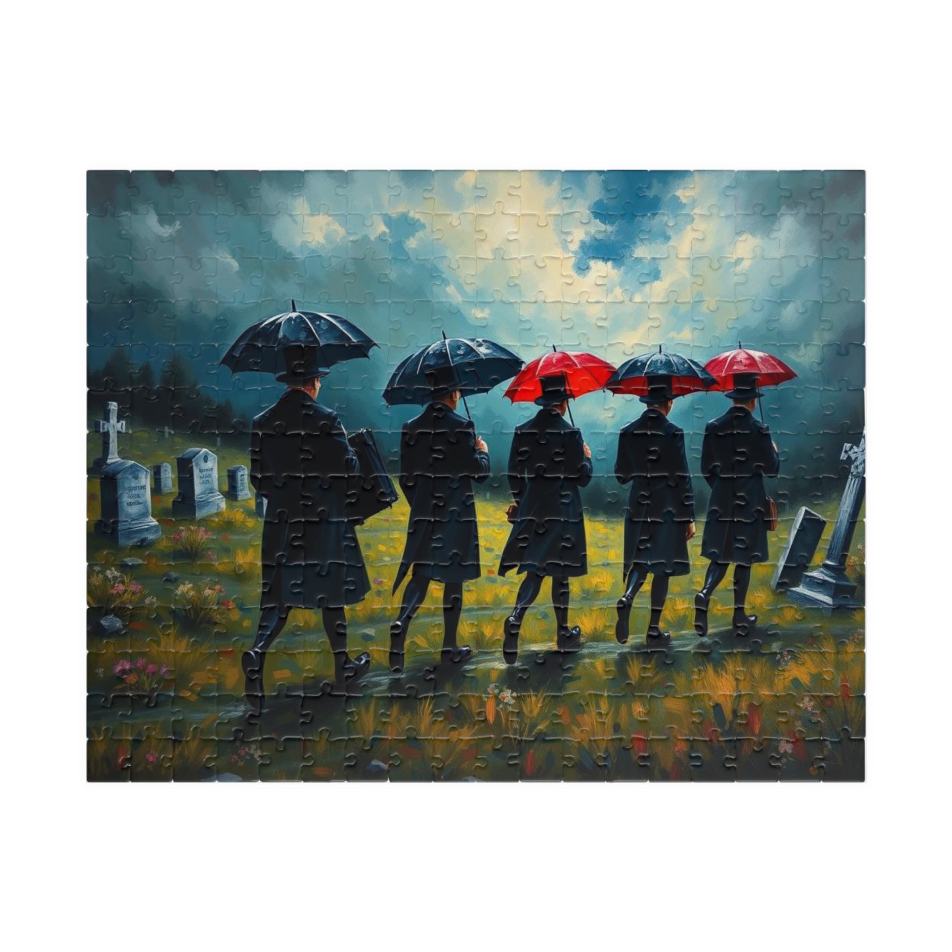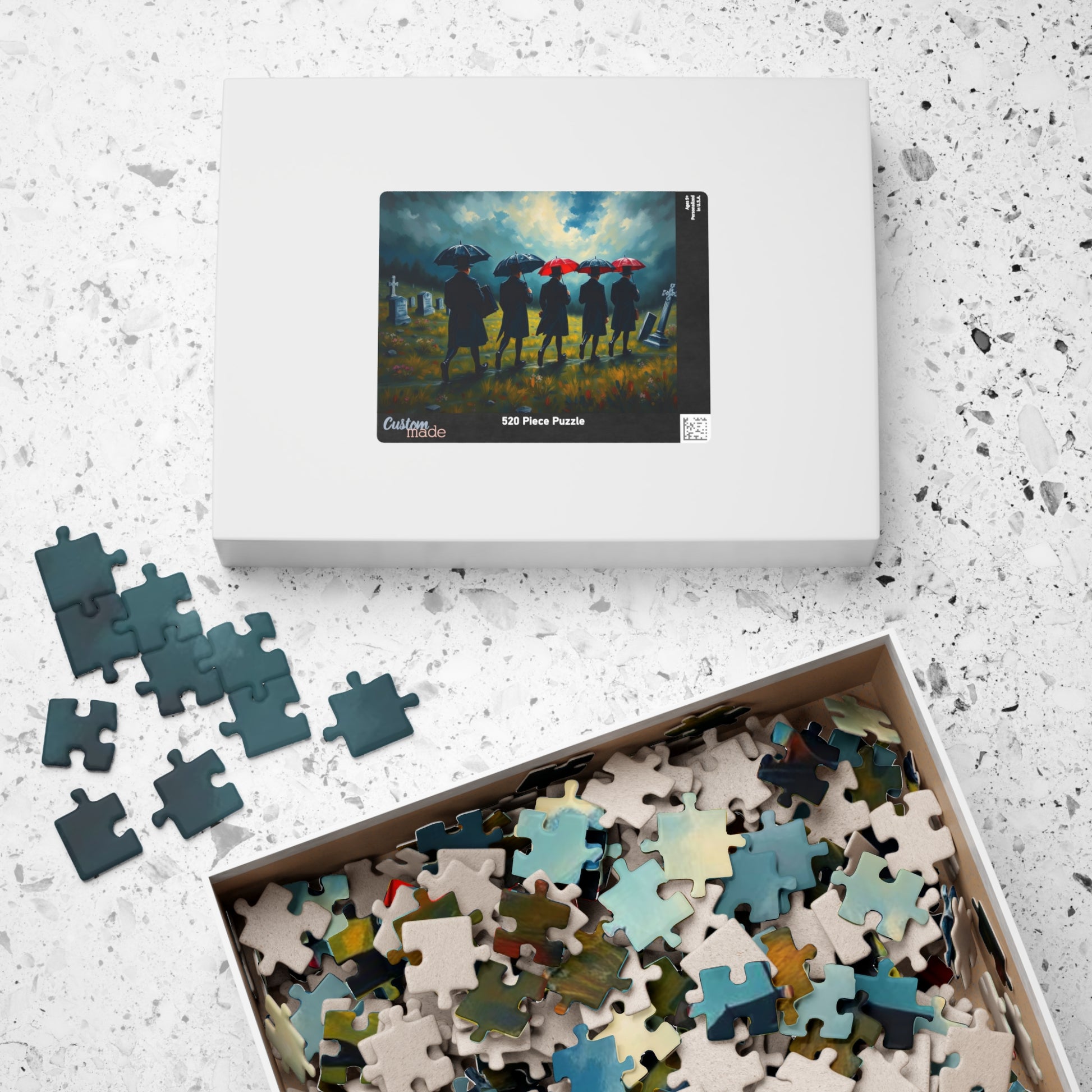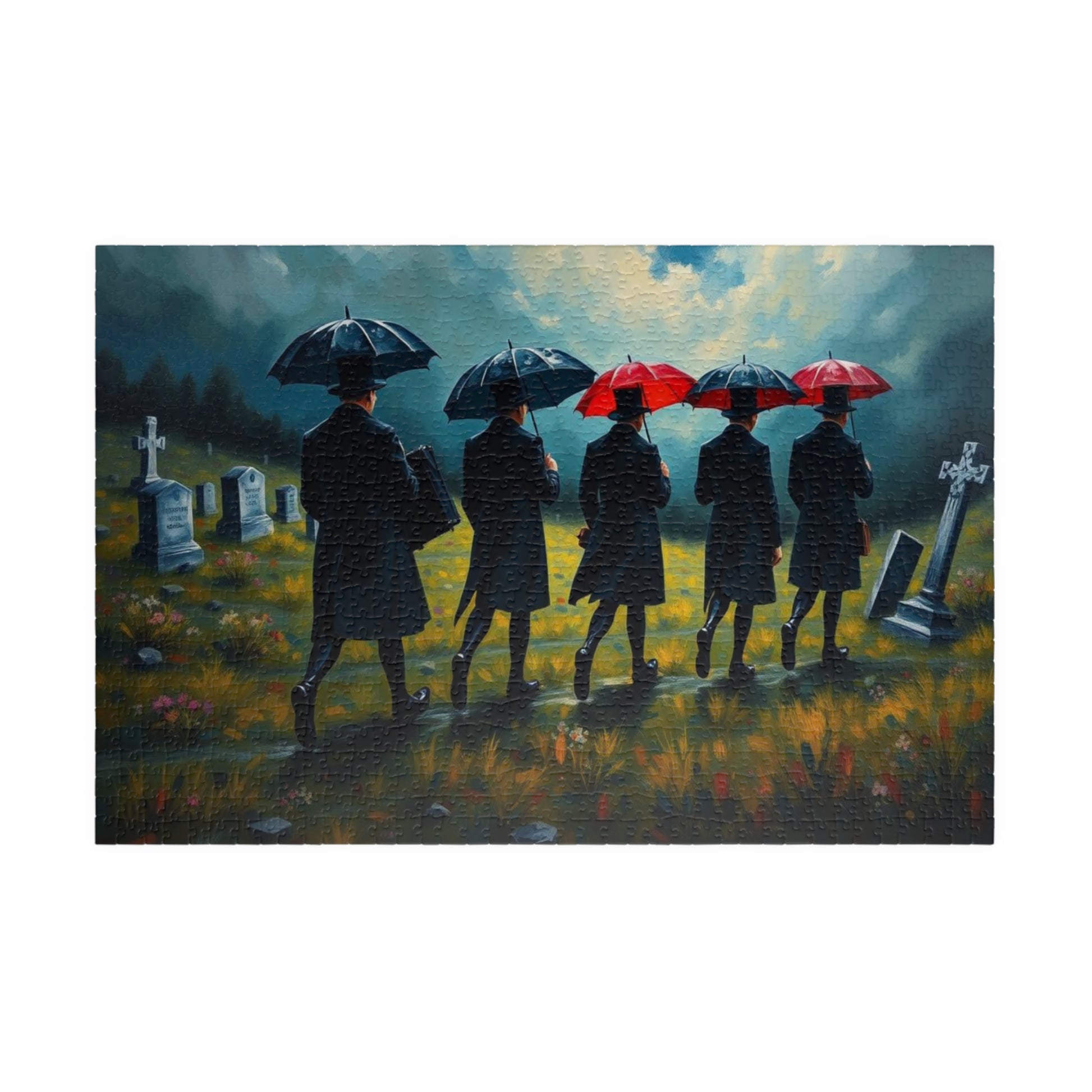 Enter a world of mystery, elegance, and atmospheric beauty with the Gothic Procession Jigsaw Puzzle. Set against a windswept moor and beneath a brooding sky, a line of tall, thin figures dressed in black coats and top hats marches in solemn formation. Umbrellas held high against the storm, their silhouettes cut a striking path past an ancient cemetery shrouded in mist. Every detail—dramatic lighting, vibrant colors, and high-contrast shadows—brings this gothic scene to life. Inspired by Victorian gothic themes, this puzzle is as visually stunning as it is challenging. Whether you're a fan of dark aesthetics, eerie landscapes, or expressive art, this puzzle promises a rich, immersive experience from the first piece to the last.