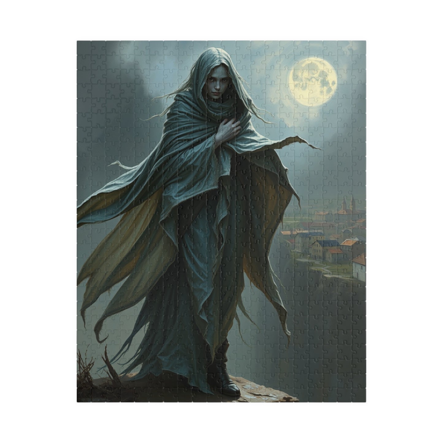 Experience the mystery and allure of the gothic puzzle depicting a banshee in a tattered, silver-gray shroud billowing in the wind, standing on a windswept cliff edge with a moonlit village in the background. Perfect for fans of dark and eerie art, this puzzle adds a haunting touch to your collection and is ideal for those who enjoy a challenge.