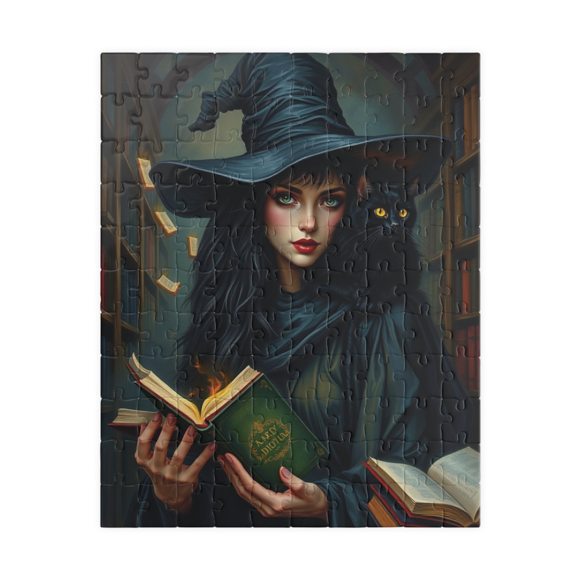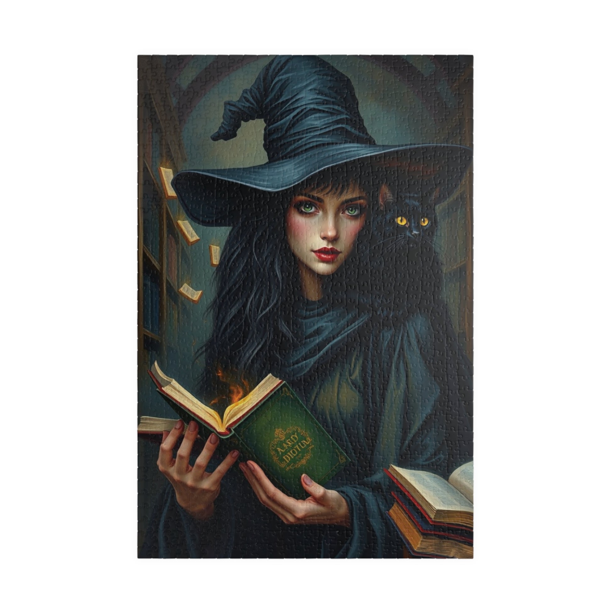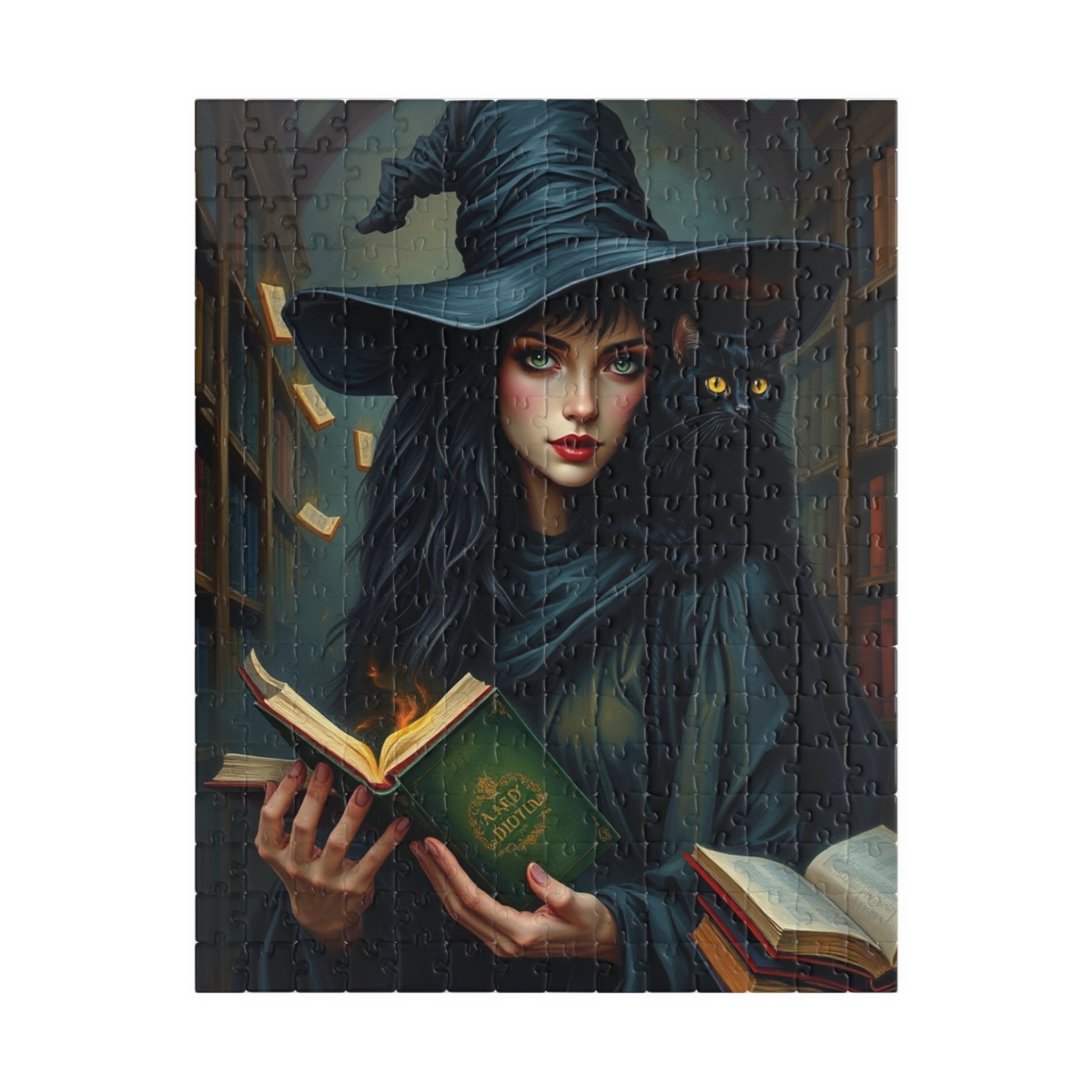 Immerse yourself in a spellbinding world with this captivating gothic witch puzzle. Featuring a striking witch in dark, flowing attire and an intense gaze, a mysterious black cat perched on her shoulder, and a towering shadowy library filled with magically glowing books, this design is bursting with enchantment and intrigue. Rich textures bring this artwork to life, offering puzzle enthusiasts a visually stunning challenge that combines mystery, magic, and artistry. Perfect for fans of gothic aesthetics and magical realms, this puzzle is a true masterpiece waiting to be pieced together!