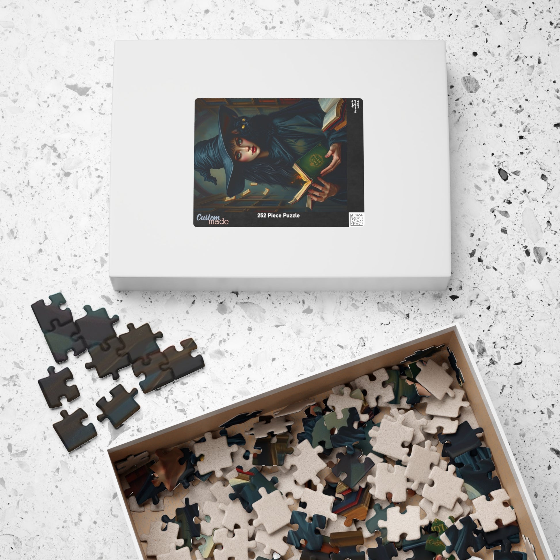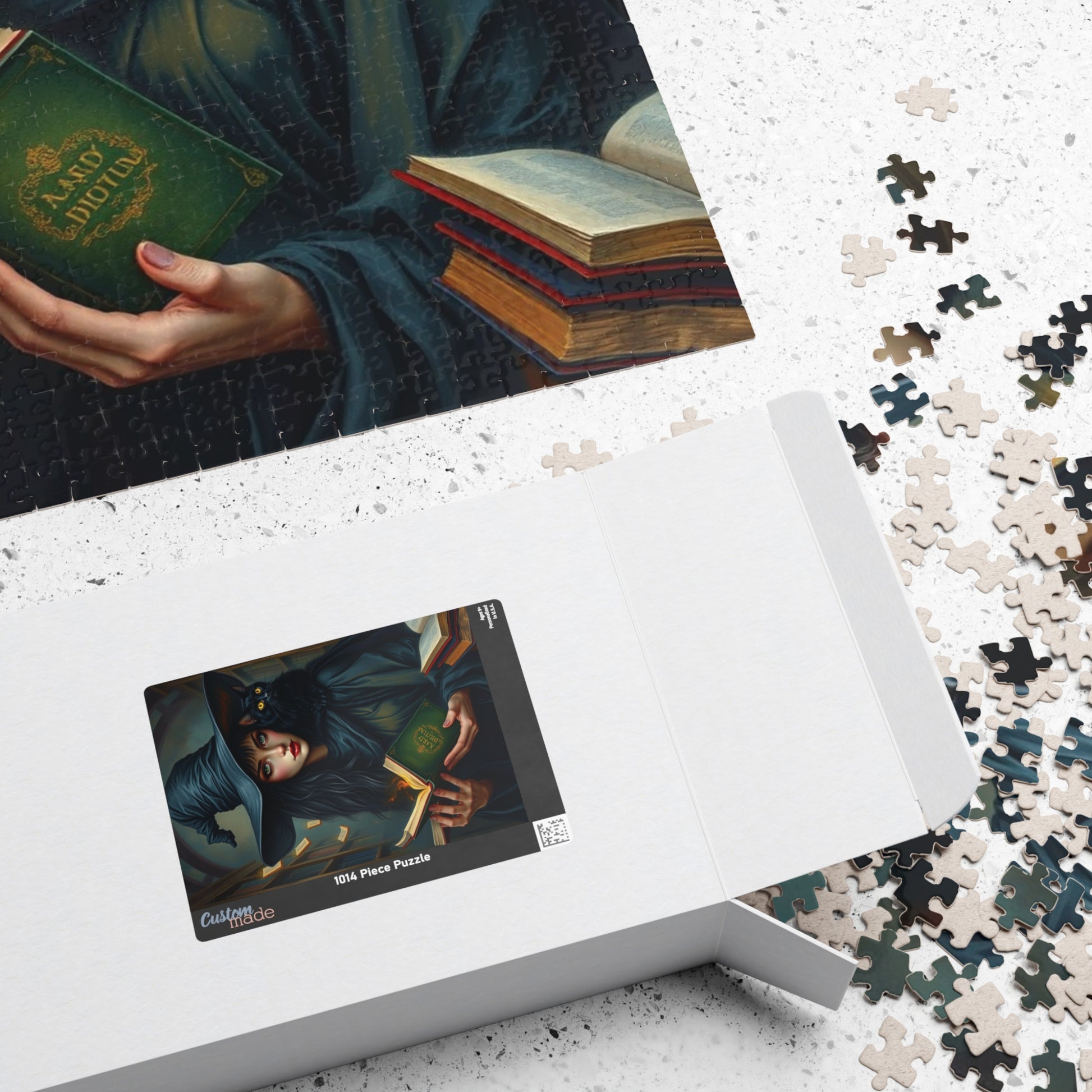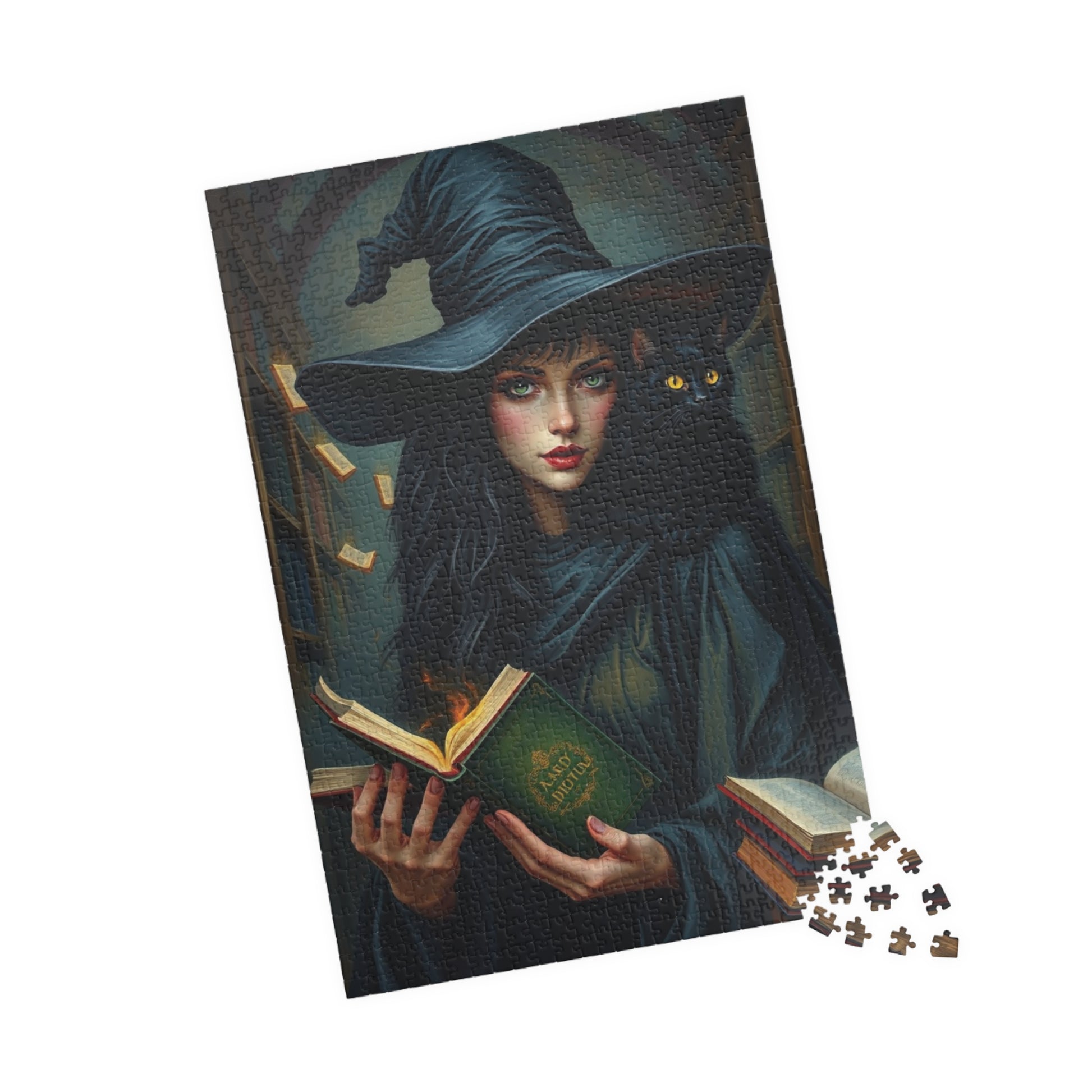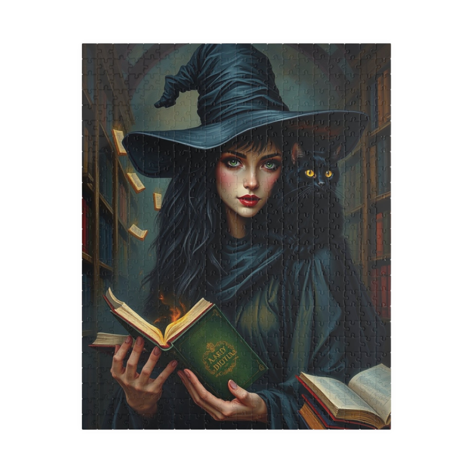 Immerse yourself in a spellbinding world with this captivating gothic witch puzzle. Featuring a striking witch in dark, flowing attire and an intense gaze, a mysterious black cat perched on her shoulder, and a towering shadowy library filled with magically glowing books, this design is bursting with enchantment and intrigue. Rich textures bring this artwork to life, offering puzzle enthusiasts a visually stunning challenge that combines mystery, magic, and artistry. Perfect for fans of gothic aesthetics and magical realms, this puzzle is a true masterpiece waiting to be pieced together!