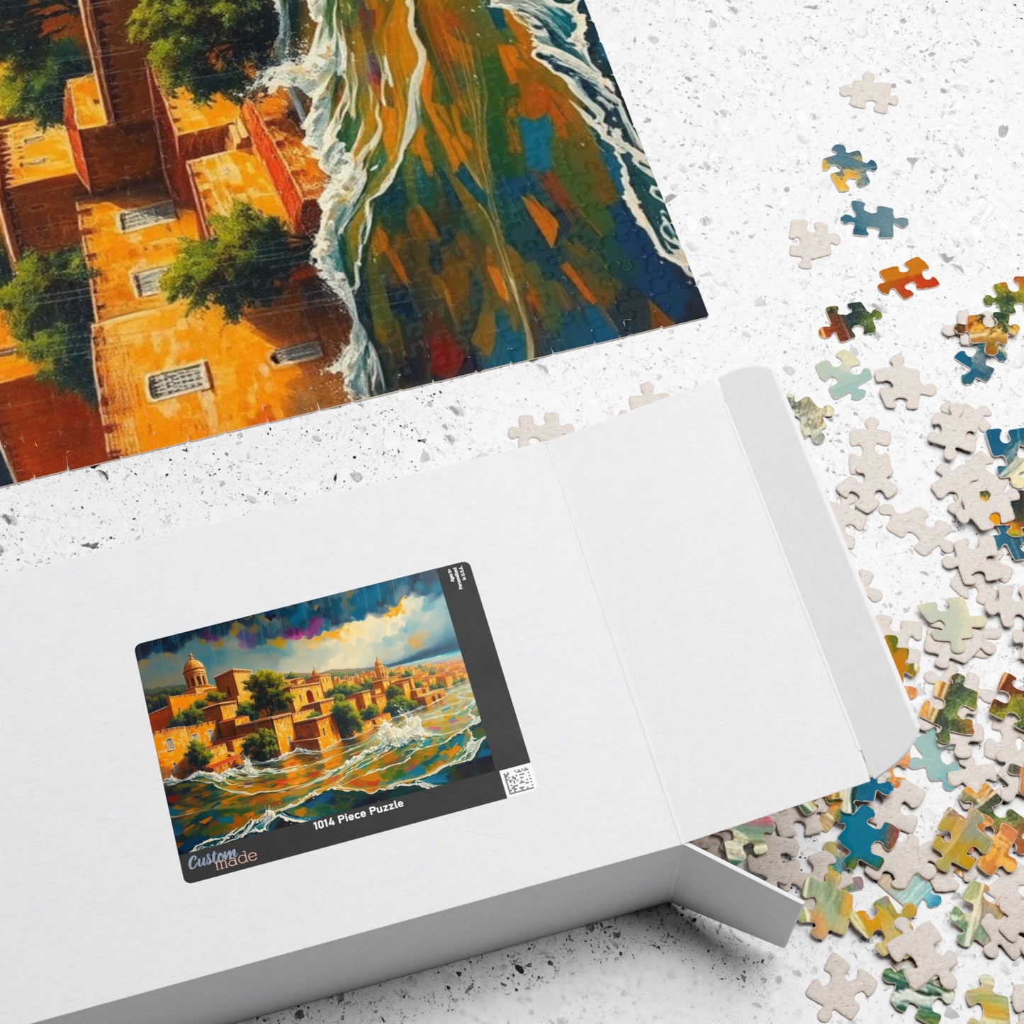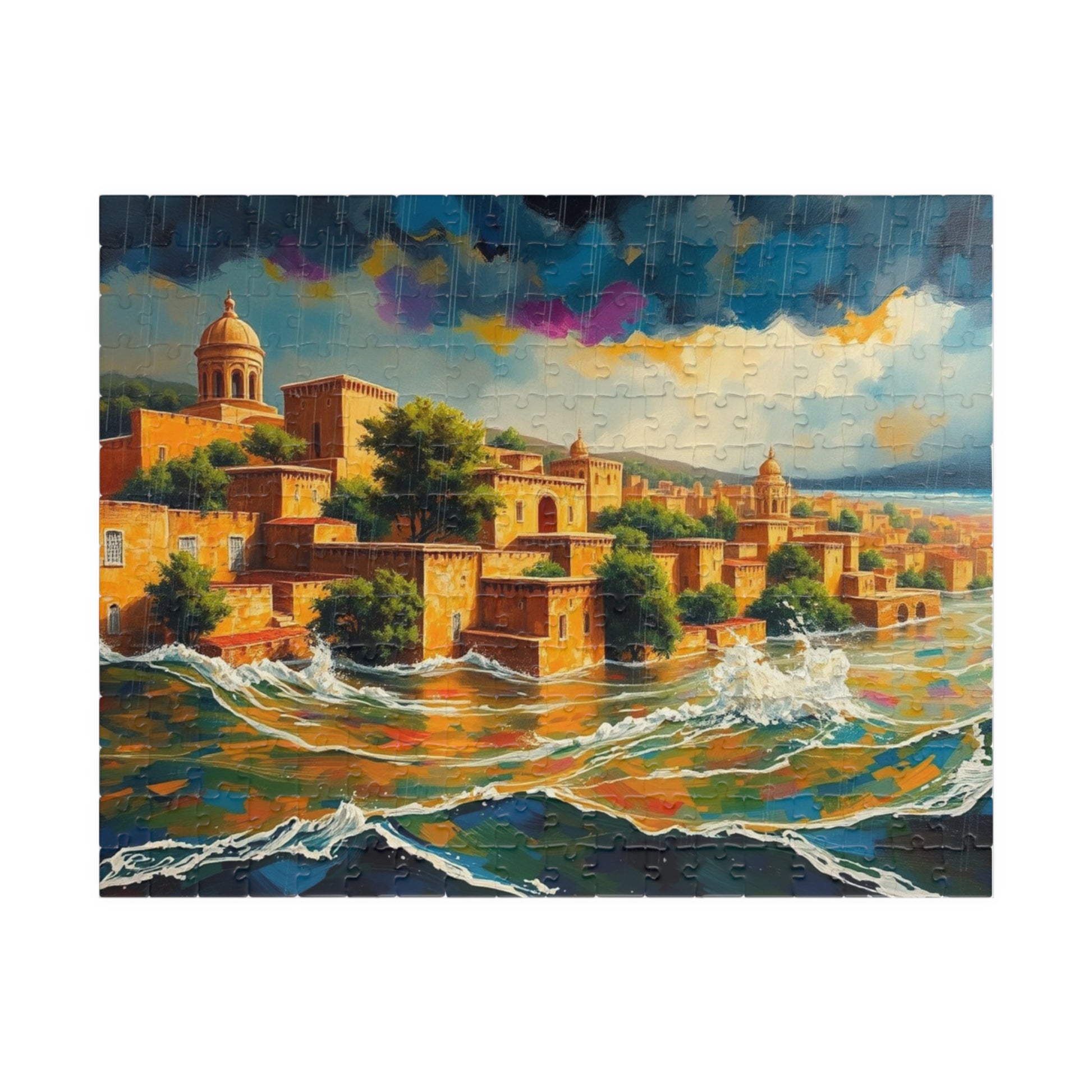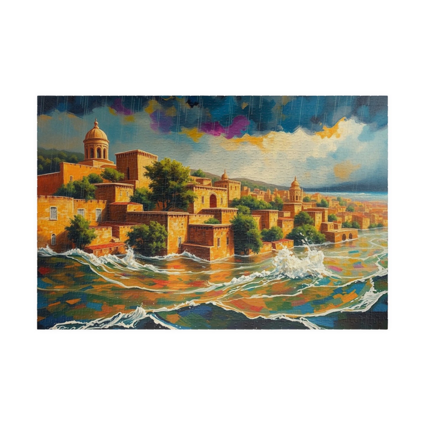 Experience the awe and intensity of nature’s power with this striking puzzle. Depicting a vast ocean of rising floodwaters sweeping over the land, towering waves crash against cliffs while trees are slowly engulfed. The dark, ominous clouds fill the sky, casting an eerie atmosphere, as a few mountain peaks stand resilient above the waterline, reflecting the grandeur of the biblical deluge. This puzzle is perfect for those who enjoy dramatic, detailed scenes and the challenge of piecing together a story of epic proportions.