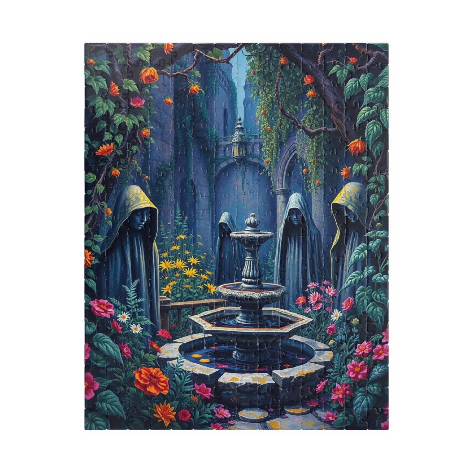 Step into a mysterious gothic garden, where enchantment and danger intertwine. This intricate puzzle brings to life an overgrown paradise, with thorny vines twisting around the stone fountain that drips dark, mysterious liquid. Bioluminescent flowers glow softly in the eerie twilight, casting a ghostly light across the scene. Towering, hooded statues stand silently among the flora, their cold, stone eyes watching with an air of eternal warning. The entire scene pulses with a lively yet haunting energy, immersing you in a dreamlike atmosphere that feels both enchanting and ominous. As you piece together this captivating puzzle, you’ll uncover the hidden secrets within, creating a moment of mysticism and discovery. Ideal for those who love gothic themes or a touch of dark elegance in their puzzle collection, this design offers a thrilling and rewarding challenge.