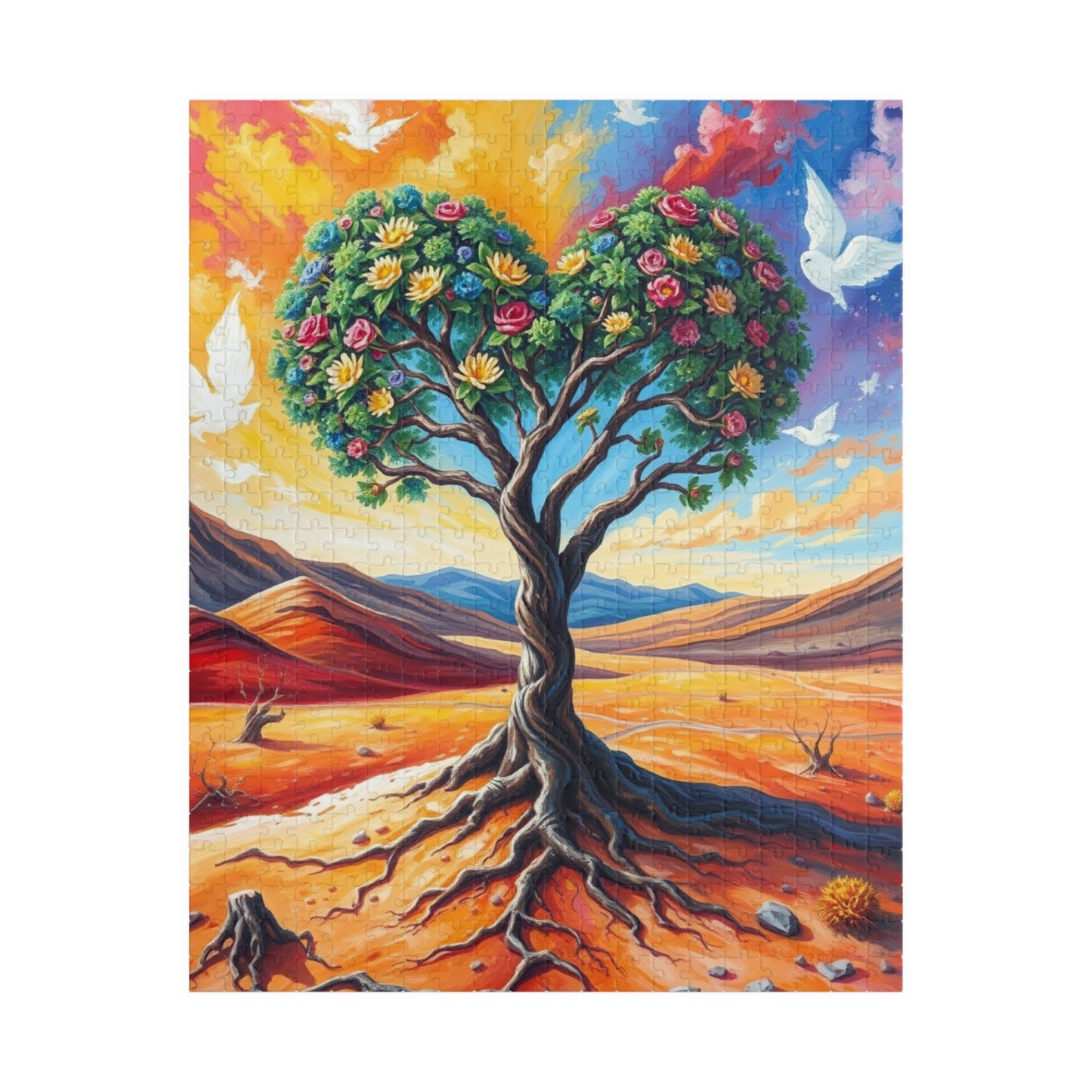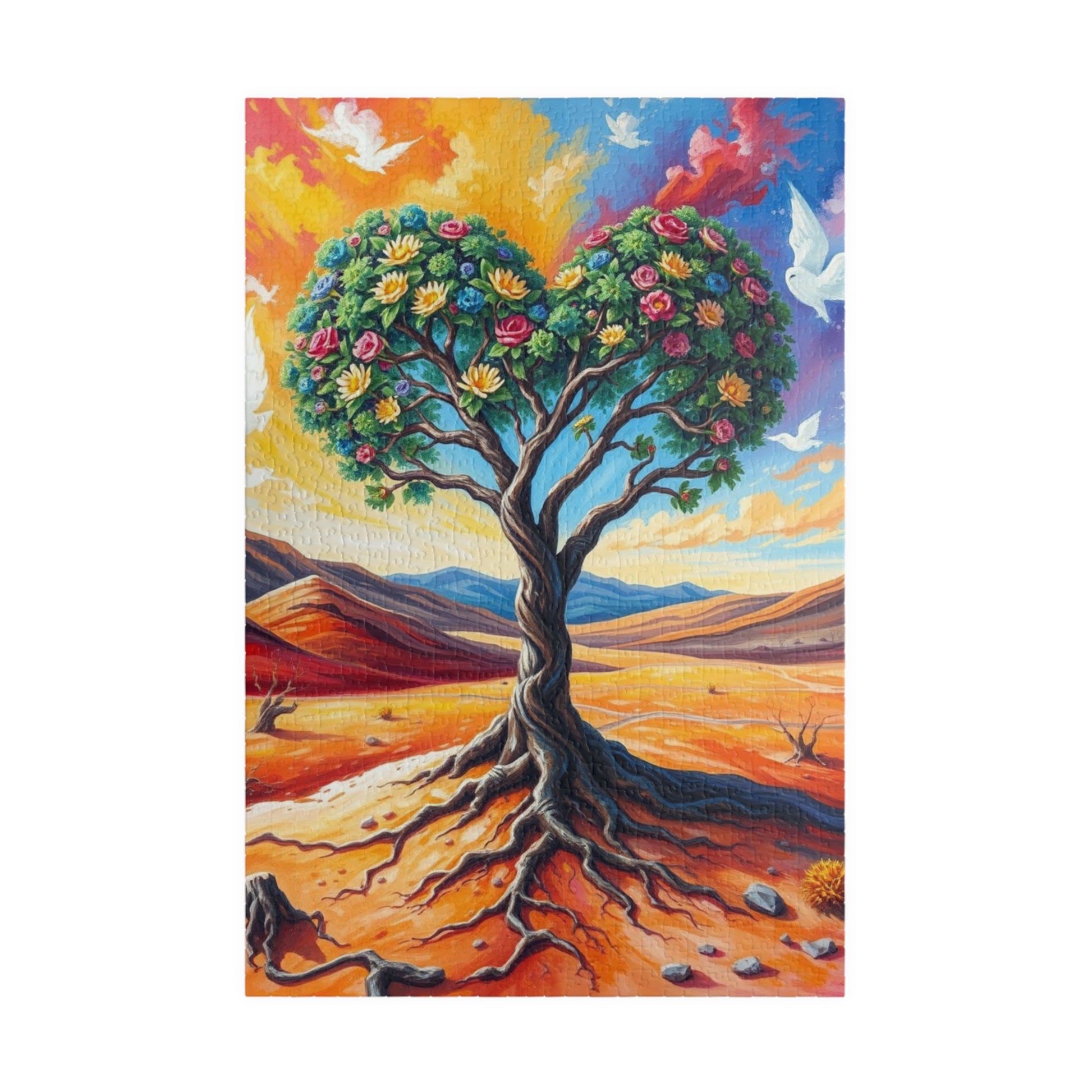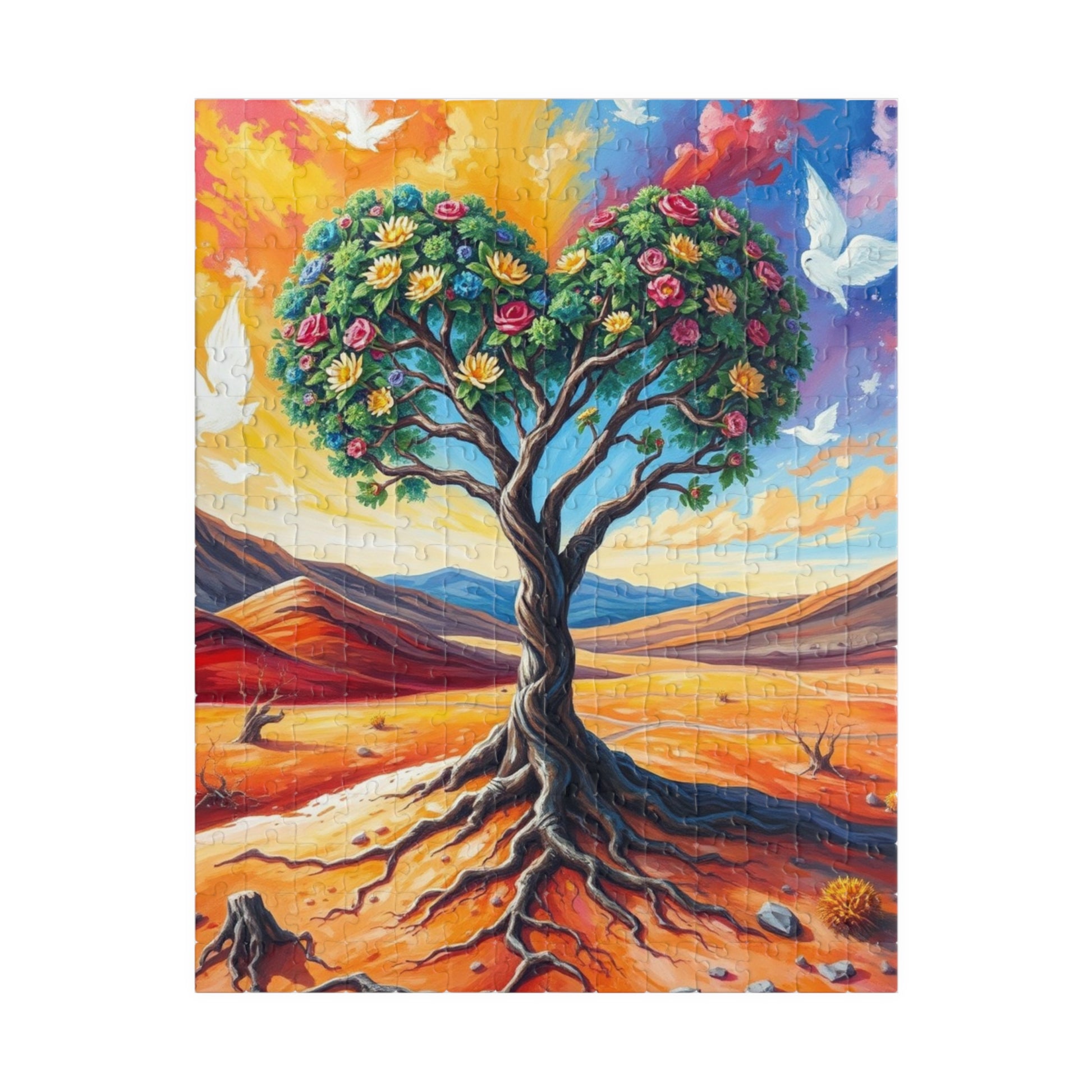 A vibrant puzzle featuring a heart-shaped tree inspired by Frida Kahlo, with intricate patterns connecting the roots to the earth and branches reaching towards a vibrant, cloud-filled sky. Perfect for art lovers and puzzle enthusiasts looking for a unique challenge. Ideal for gifting on birthdays, holidays, or as a thoughtful present for any occasion.