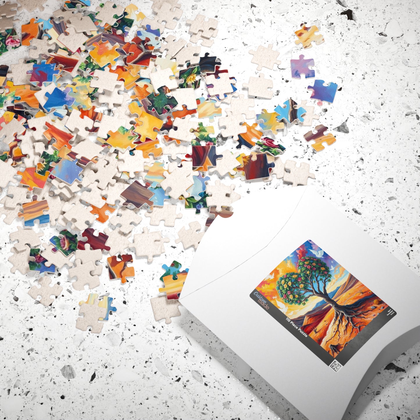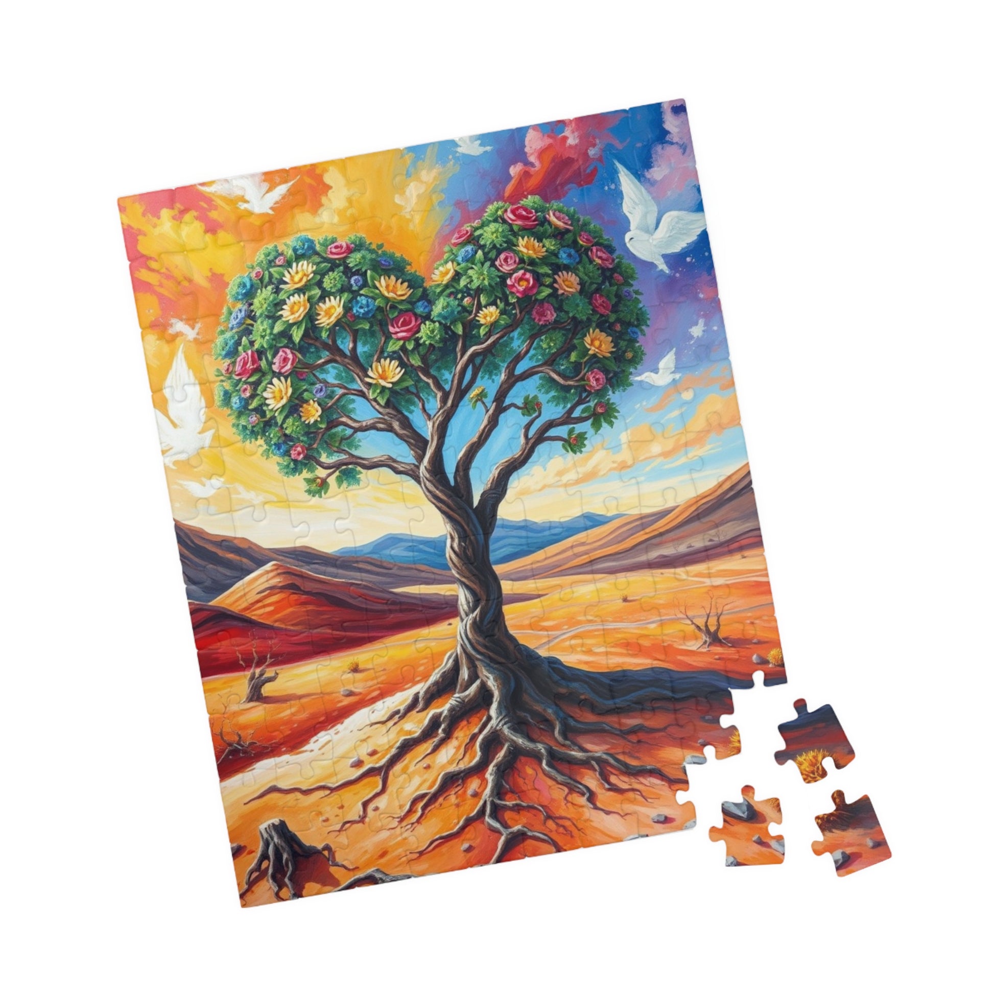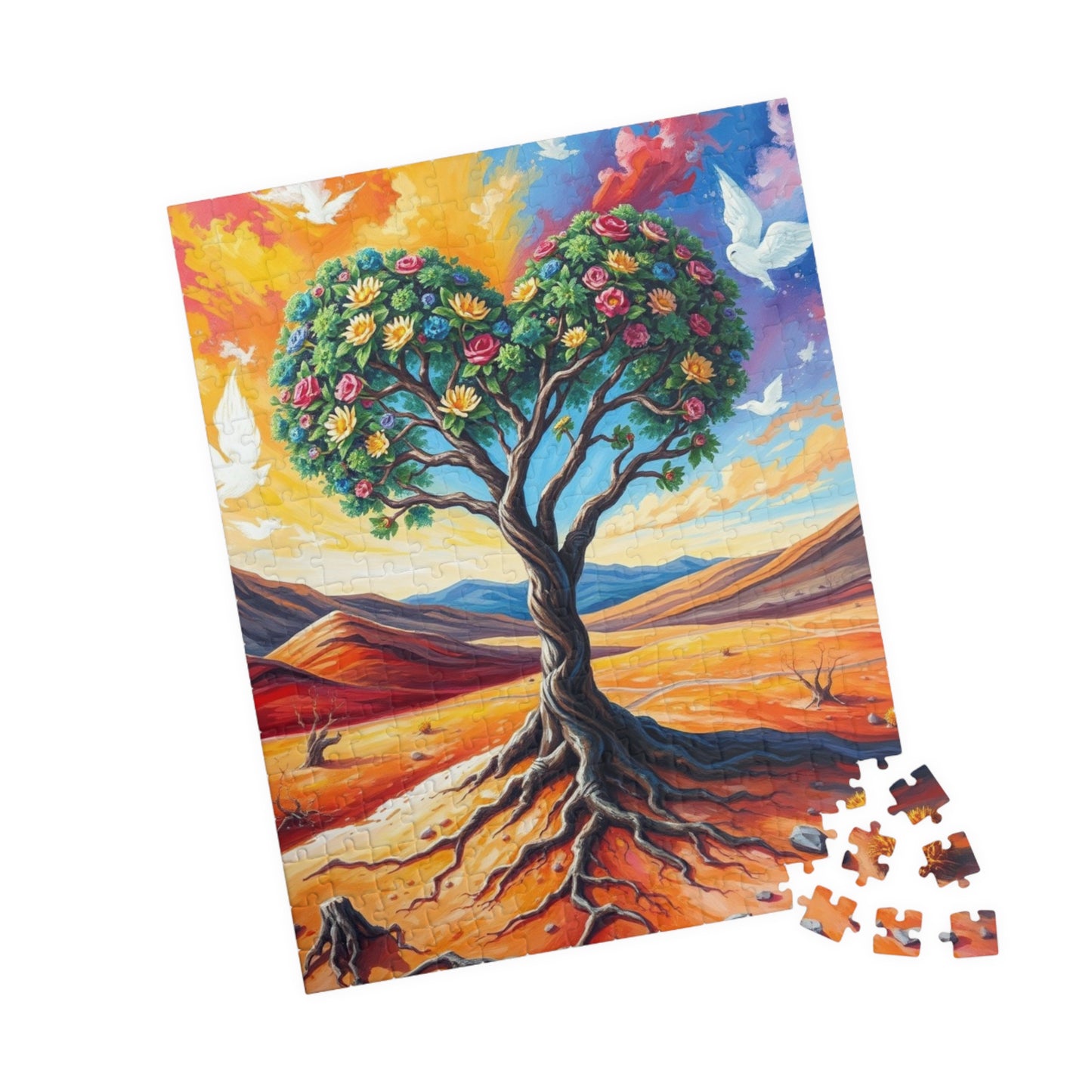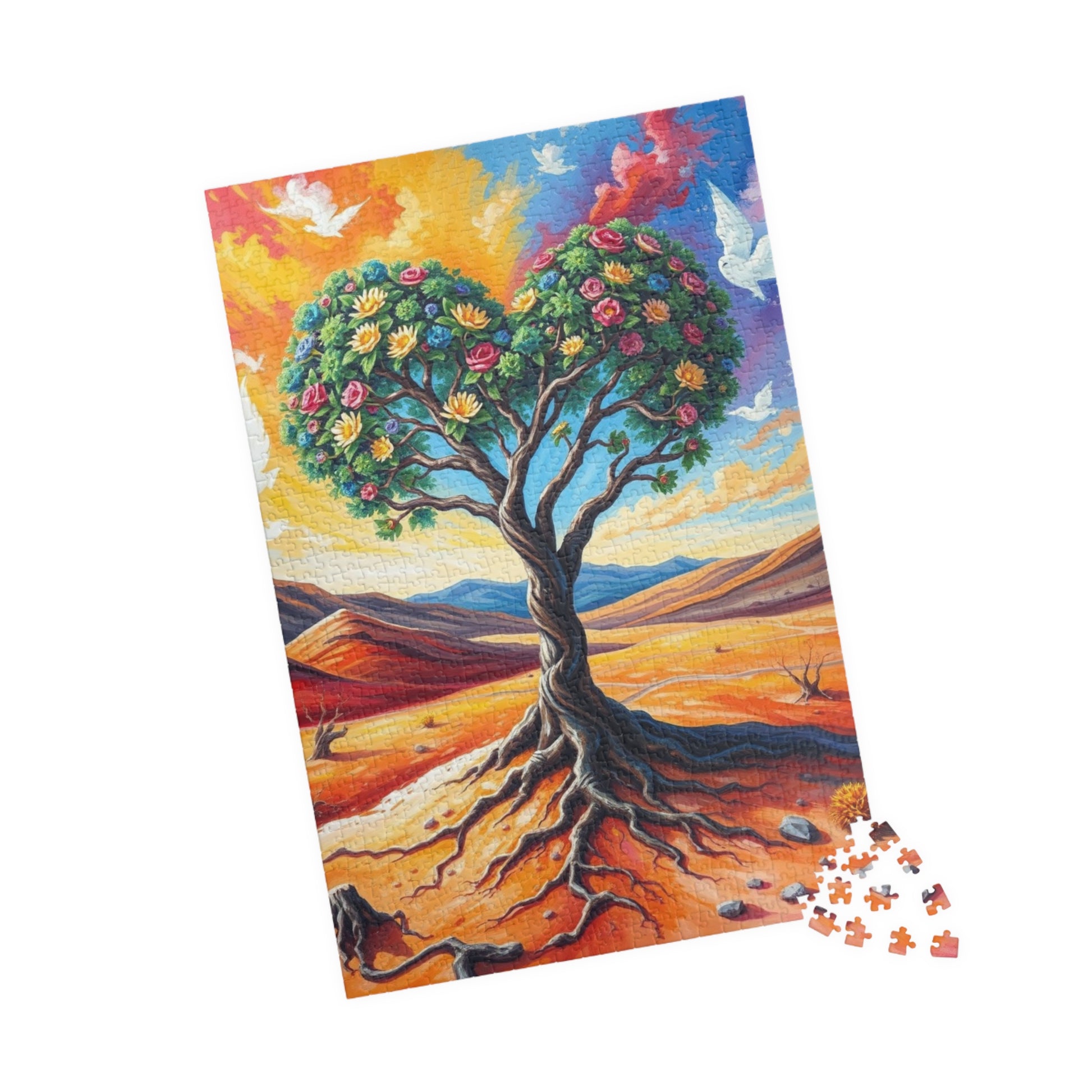 A vibrant puzzle featuring a heart-shaped tree inspired by Frida Kahlo, with intricate patterns connecting the roots to the earth and branches reaching towards a vibrant, cloud-filled sky. Perfect for art lovers and puzzle enthusiasts looking for a unique challenge. Ideal for gifting on birthdays, holidays, or as a thoughtful present for any occasion.