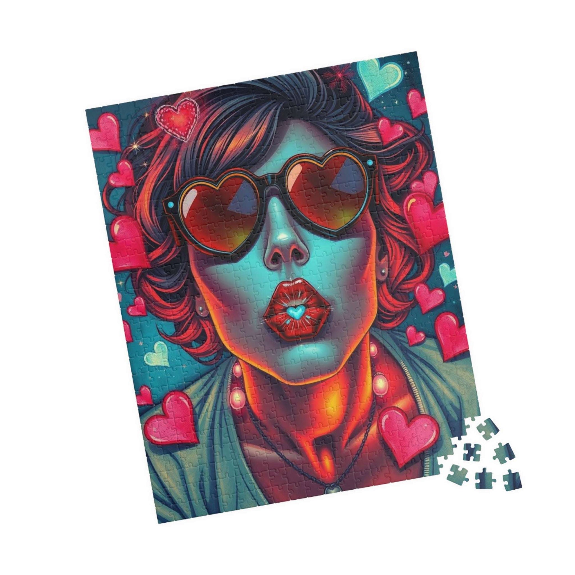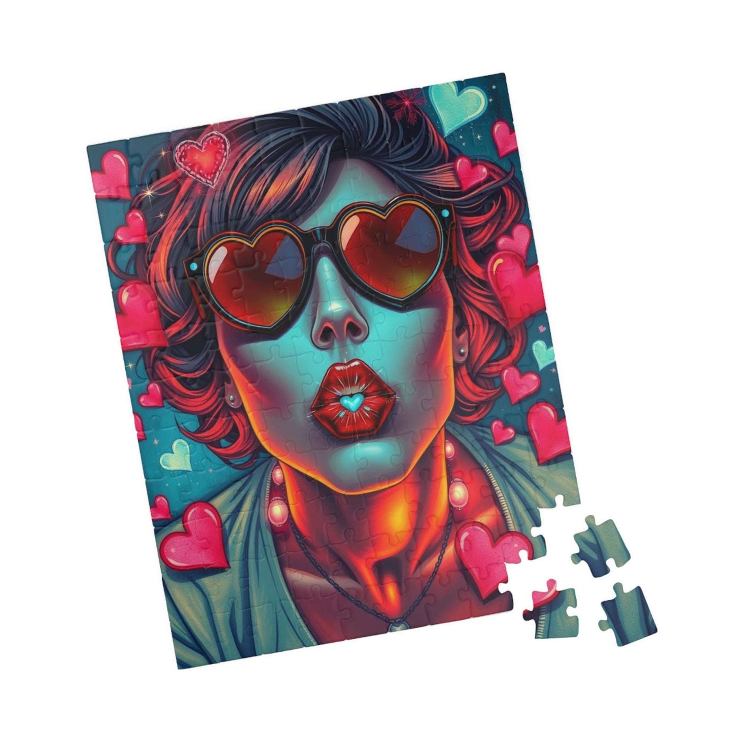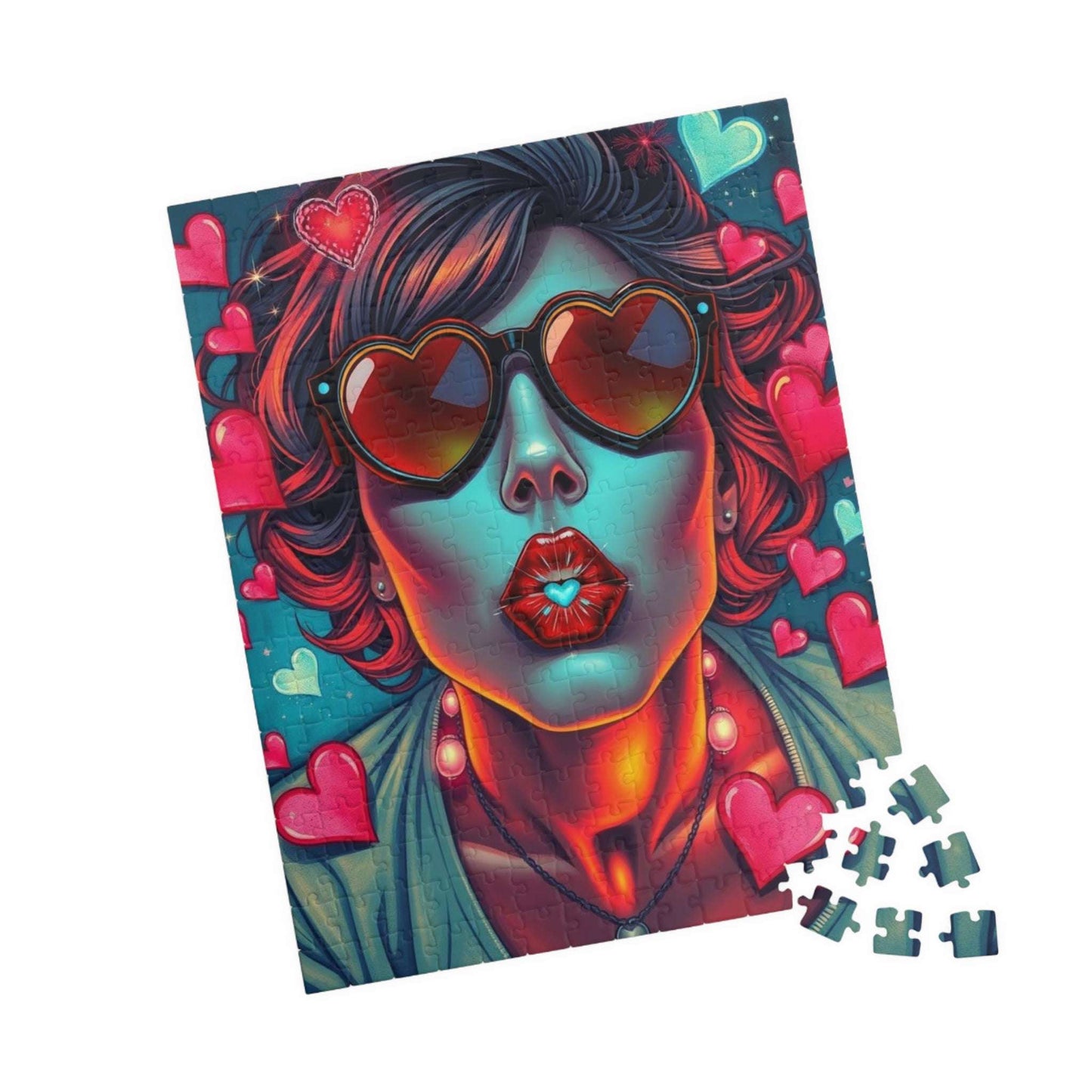 This pop art puzzle features a comic style woman with red lipstick and heart-shaped sunglasses blowing a kiss amidst hearts and sparkles, giving a nostalgic and vibrant vibe. Perfect for puzzle lovers who enjoy colorful and fun designs. Ideal for gifting during holidays, birthdays, or to someone who appreciates unique and artsy decor.