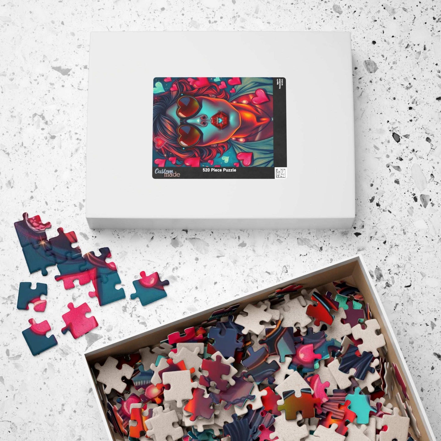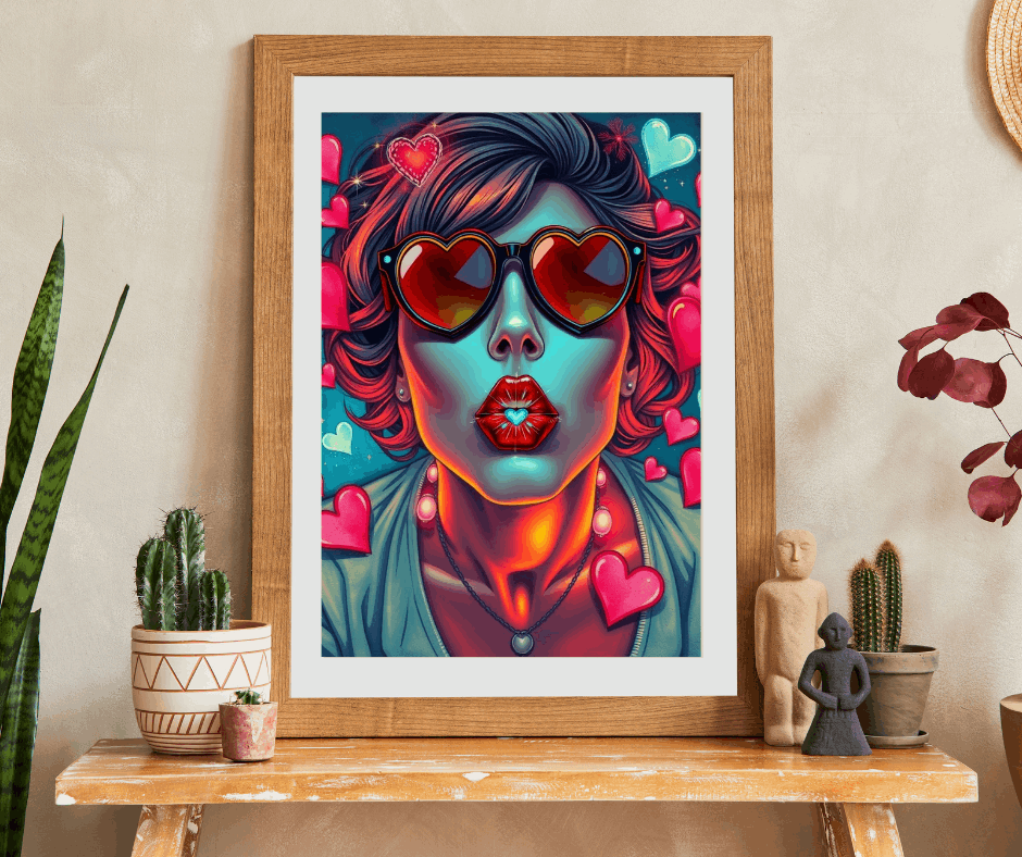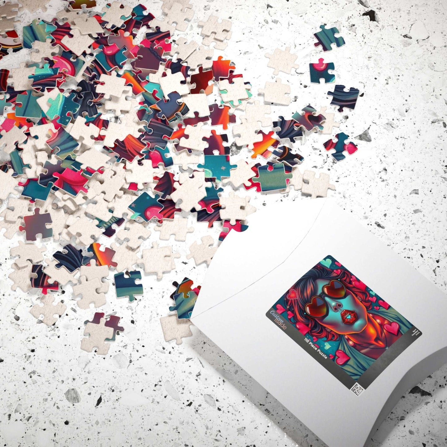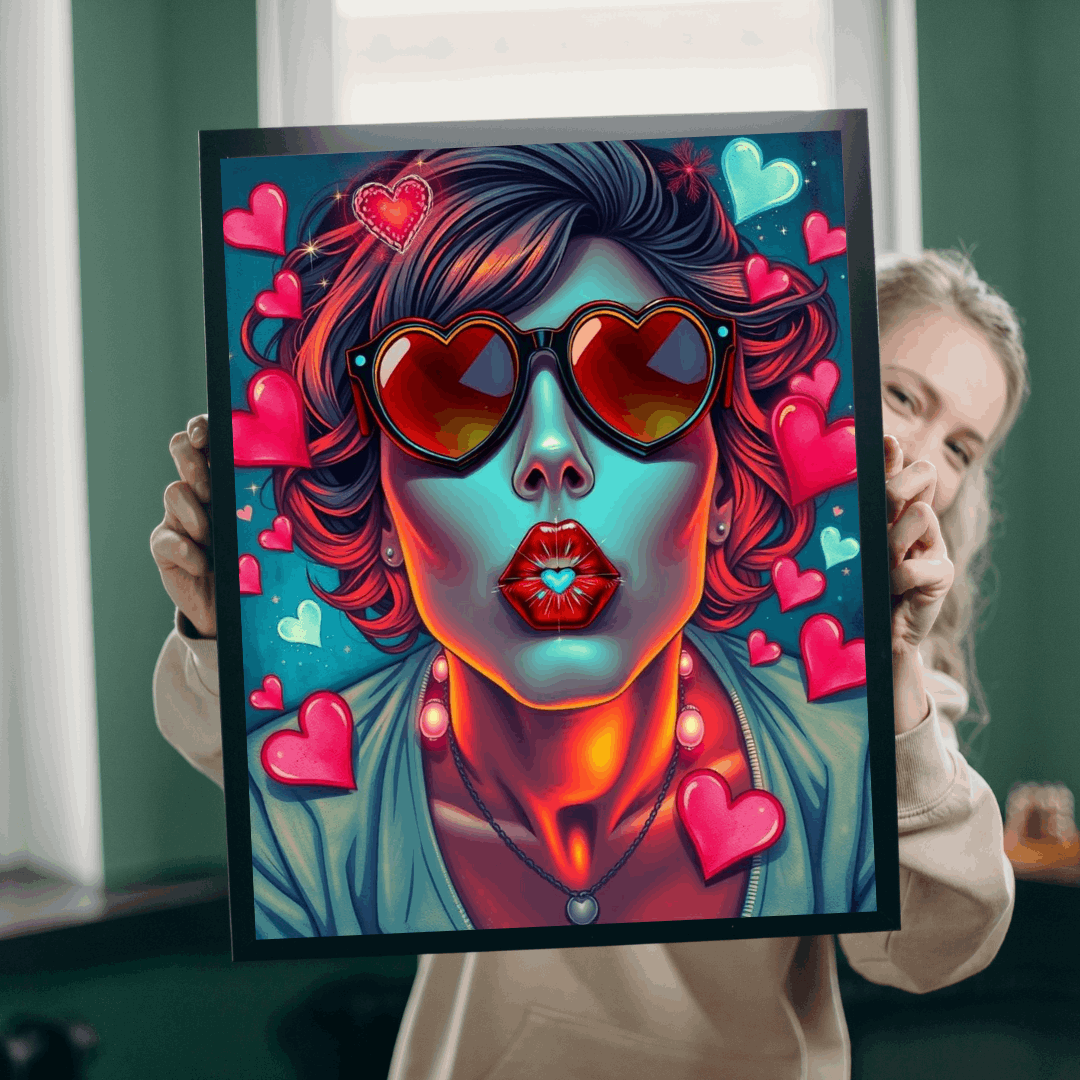 This pop art puzzle features a comic style woman with red lipstick and heart-shaped sunglasses blowing a kiss amidst hearts and sparkles, giving a nostalgic and vibrant vibe. Perfect for puzzle lovers who enjoy colorful and fun designs. Ideal for gifting during holidays, birthdays, or to someone who appreciates unique and artsy decor.