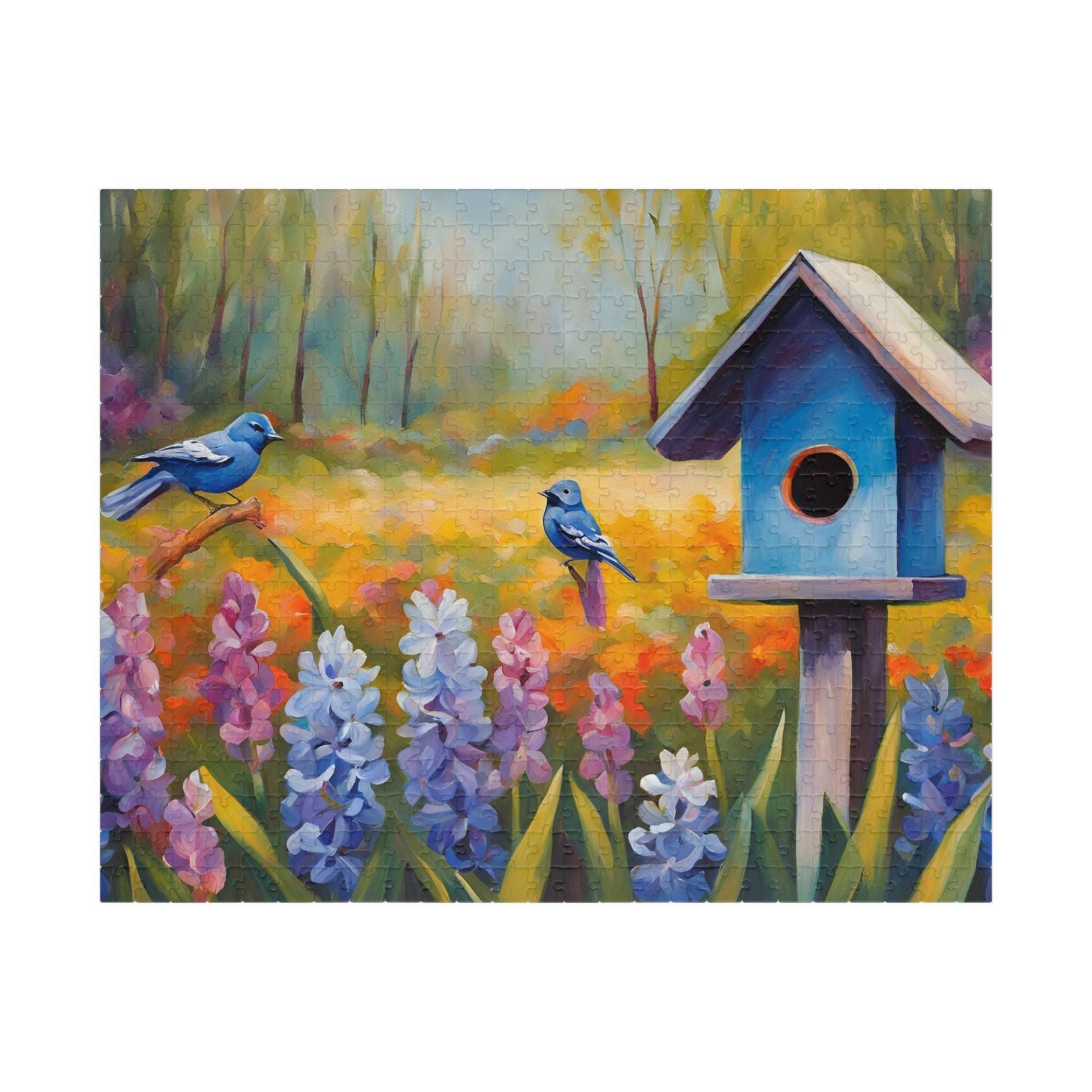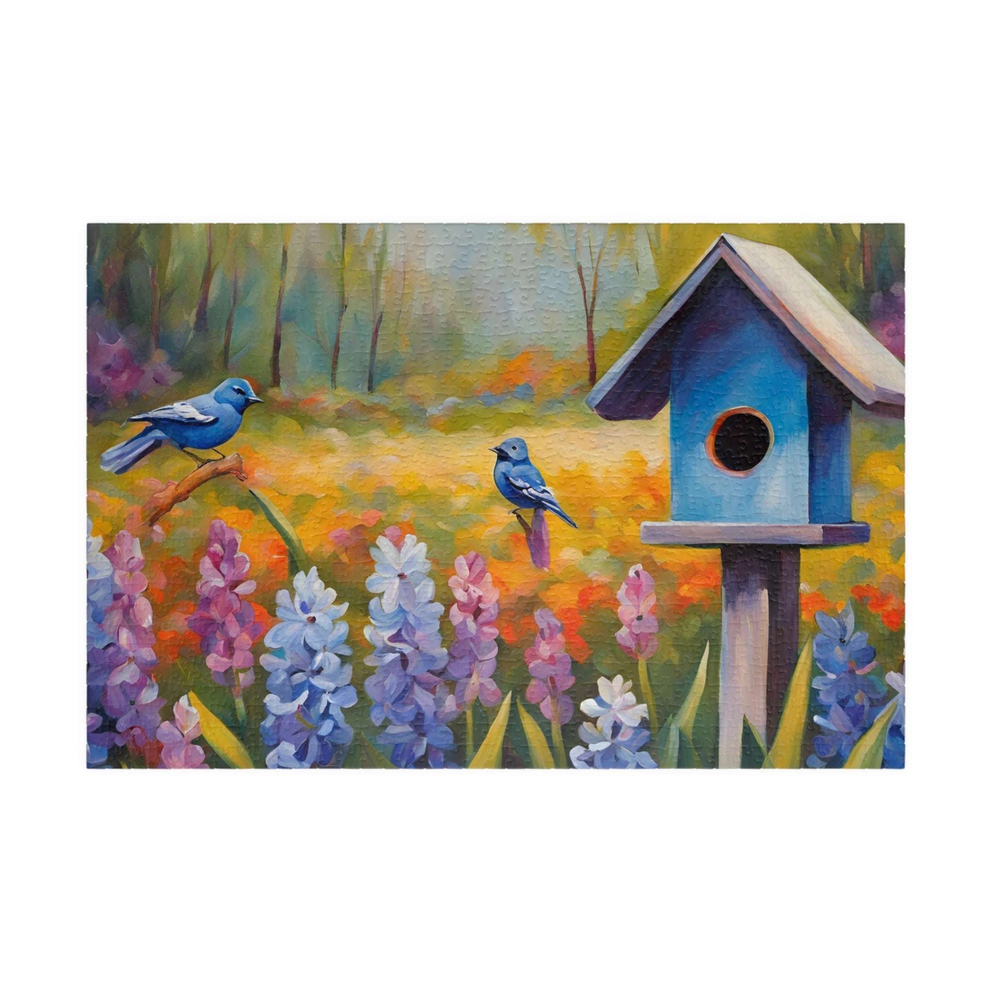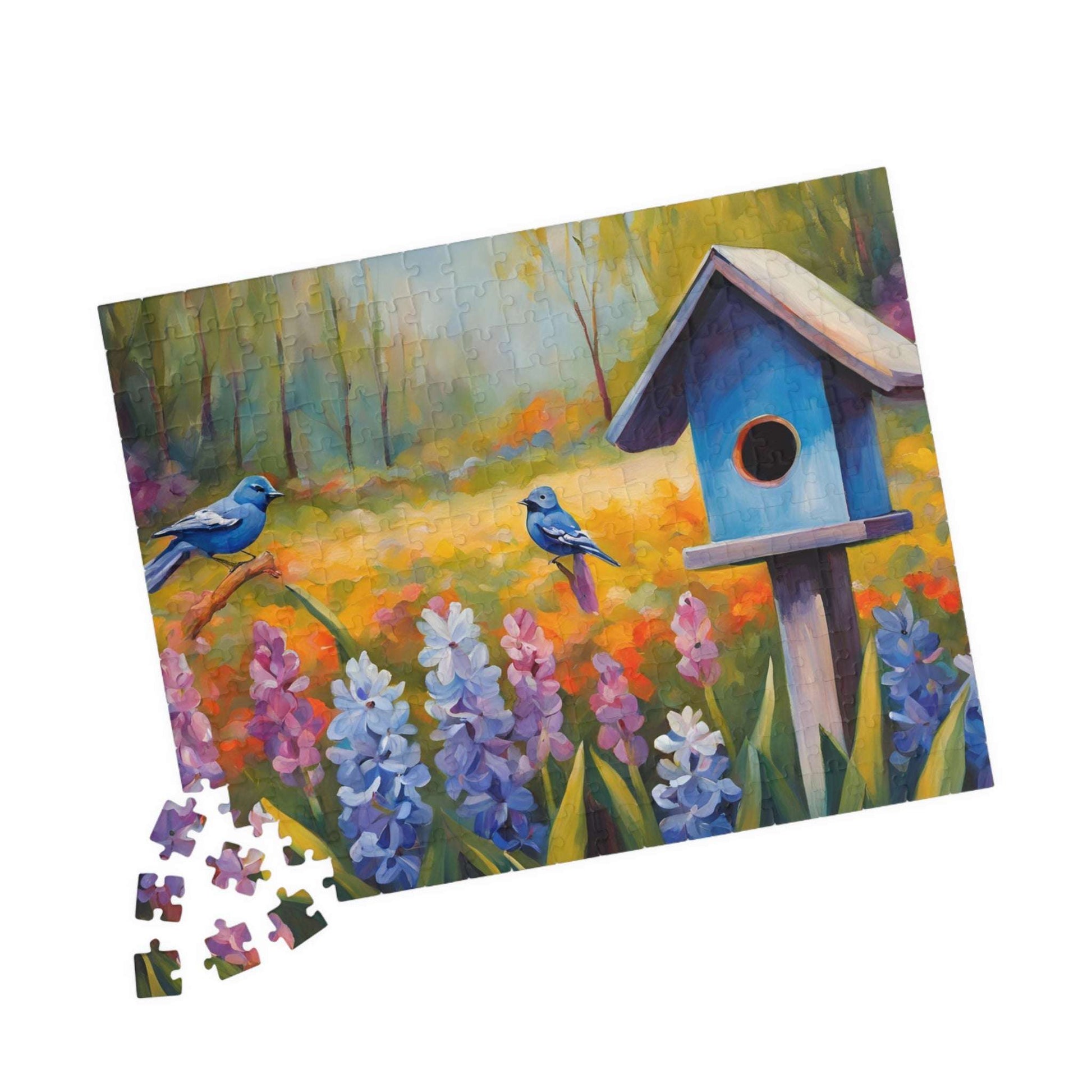 Jigsaw Puzzle, Charming Wooden Birdhouse Surrounded by Blooming Hyacinths and Birds, Mindfulness Activity, Indoor Entertainment, Family