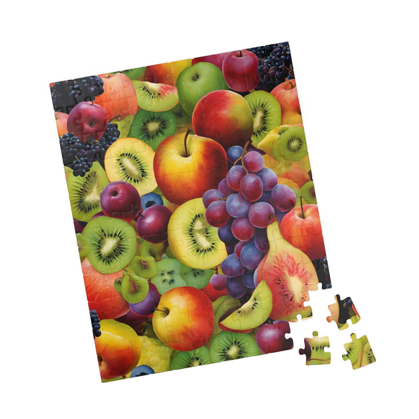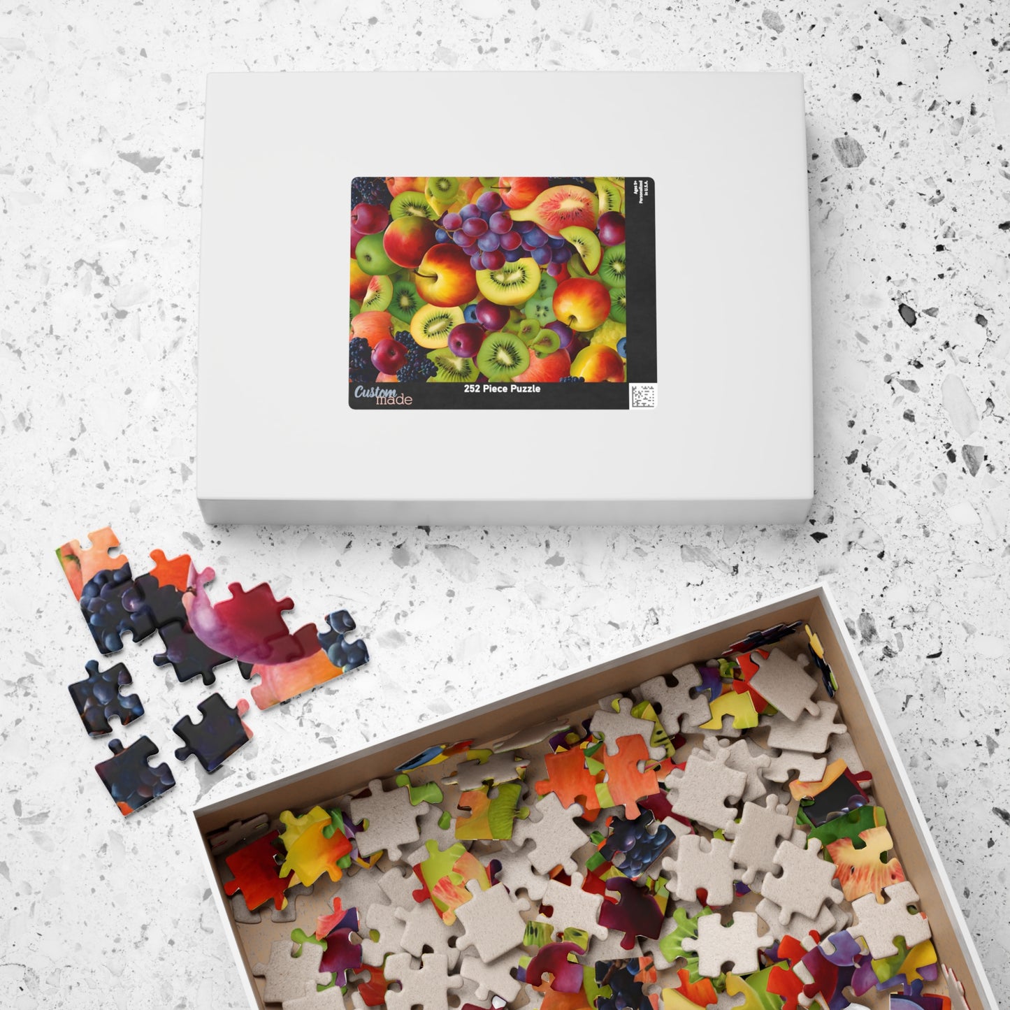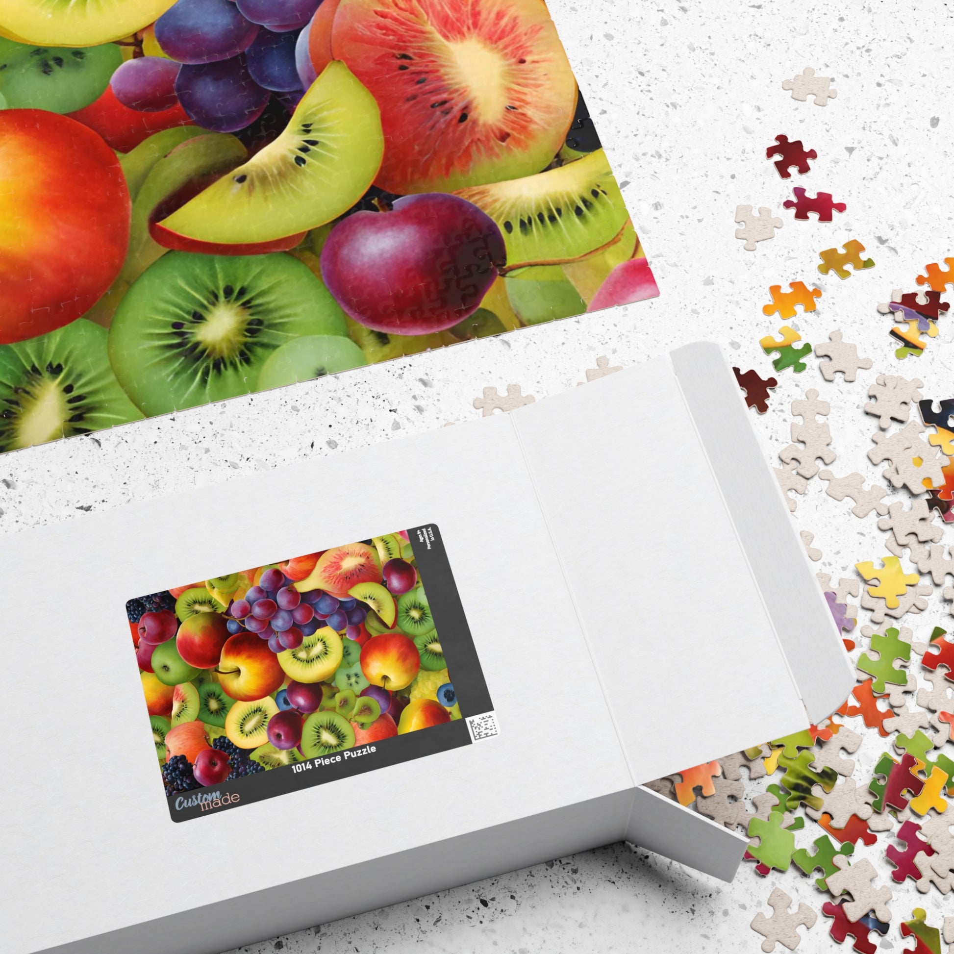 Colorful puzzle depicting a chaotic collage of various fruits, perfect for fruit lovers and puzzle enthusiasts. Ideal for leisurely weekends or as a fun family activity during holidays and gatherings.