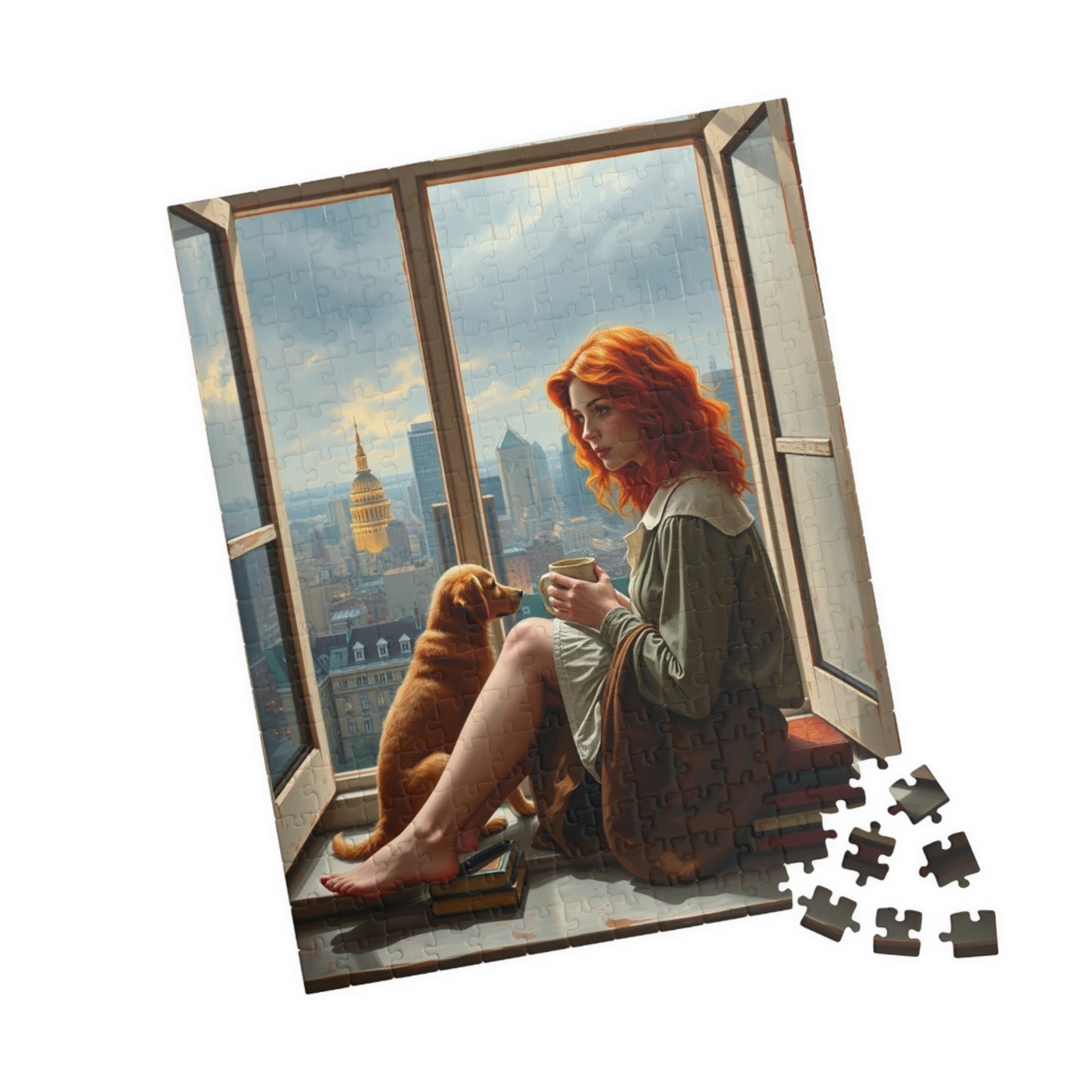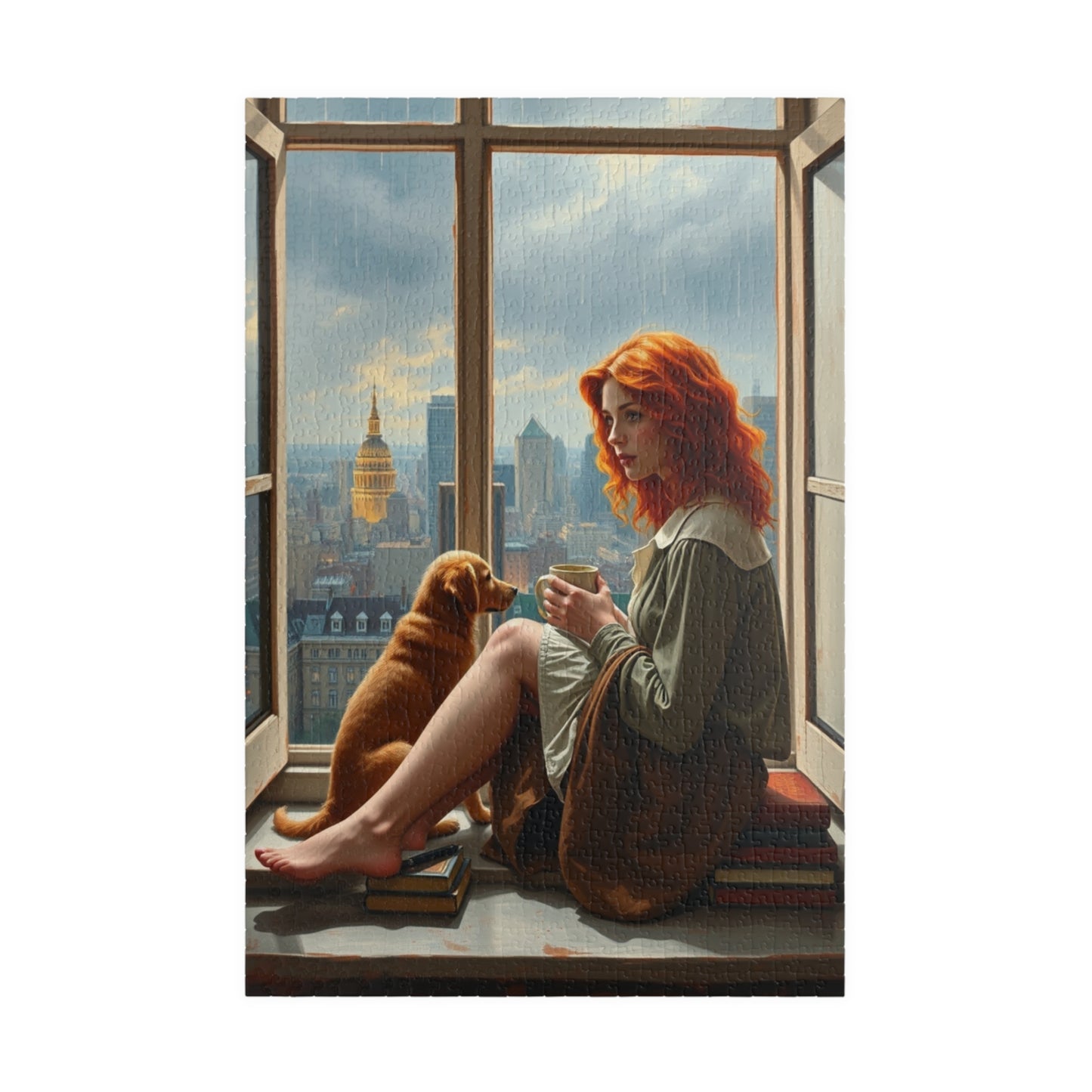 Immerse yourself in a cozy atmosphere with this puzzle featuring a woman with red hair sitting on a windowsill with a dog and a cup of coffee, overlooking a rainy cityscape. Perfect for puzzle enthusiasts who enjoy vibrant and detailed designs. Ideal for relaxing indoor activities or as a thoughtful gift for holidays and rainy days.