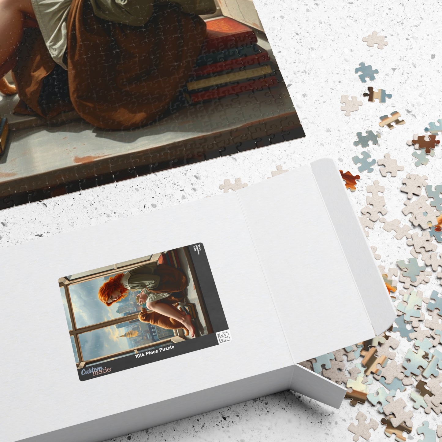 Jigsaw Puzzle, Woman Sitting on Windowsill with Red Hair, Books, Dog, Cityscape, Rainy Sky, 110, 252, 520, 1014-Piece - Relaxing Indoor