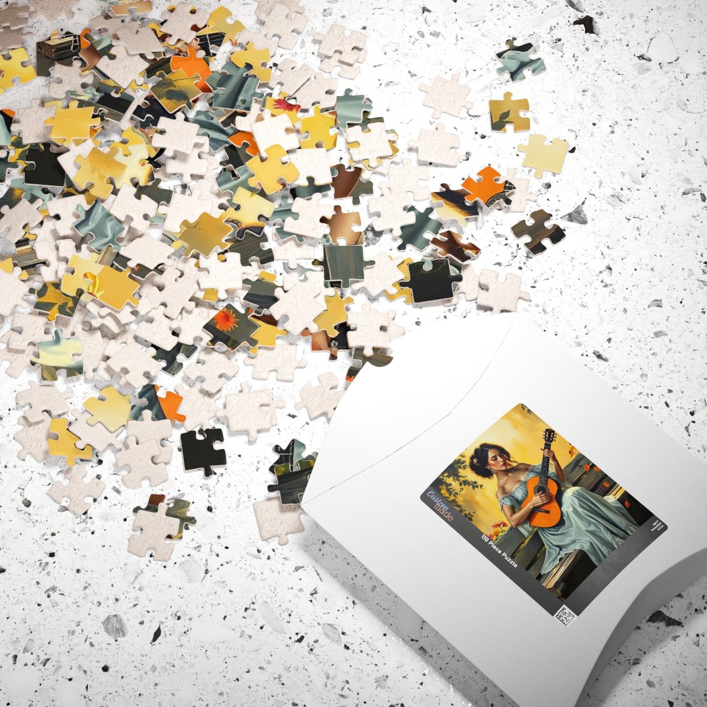 Celebrate culture and grace with this stunning puzzle featuring a timeless scene of a graceful Latina woman. Depicted with refined features, she sits elegantly on a weathered bench, strumming a guitar, her folkloric dress flowing in vibrant, intricate detail. Surrounded by colorful flowers and bathed in soft light, the visible textures lend a painterly charm, creating an artwork that feels both classic and alive. Perfect for puzzle enthusiasts and art lovers alike, this piece invites you to savor each detail as you assemble a beautiful homage to tradition and artistry.