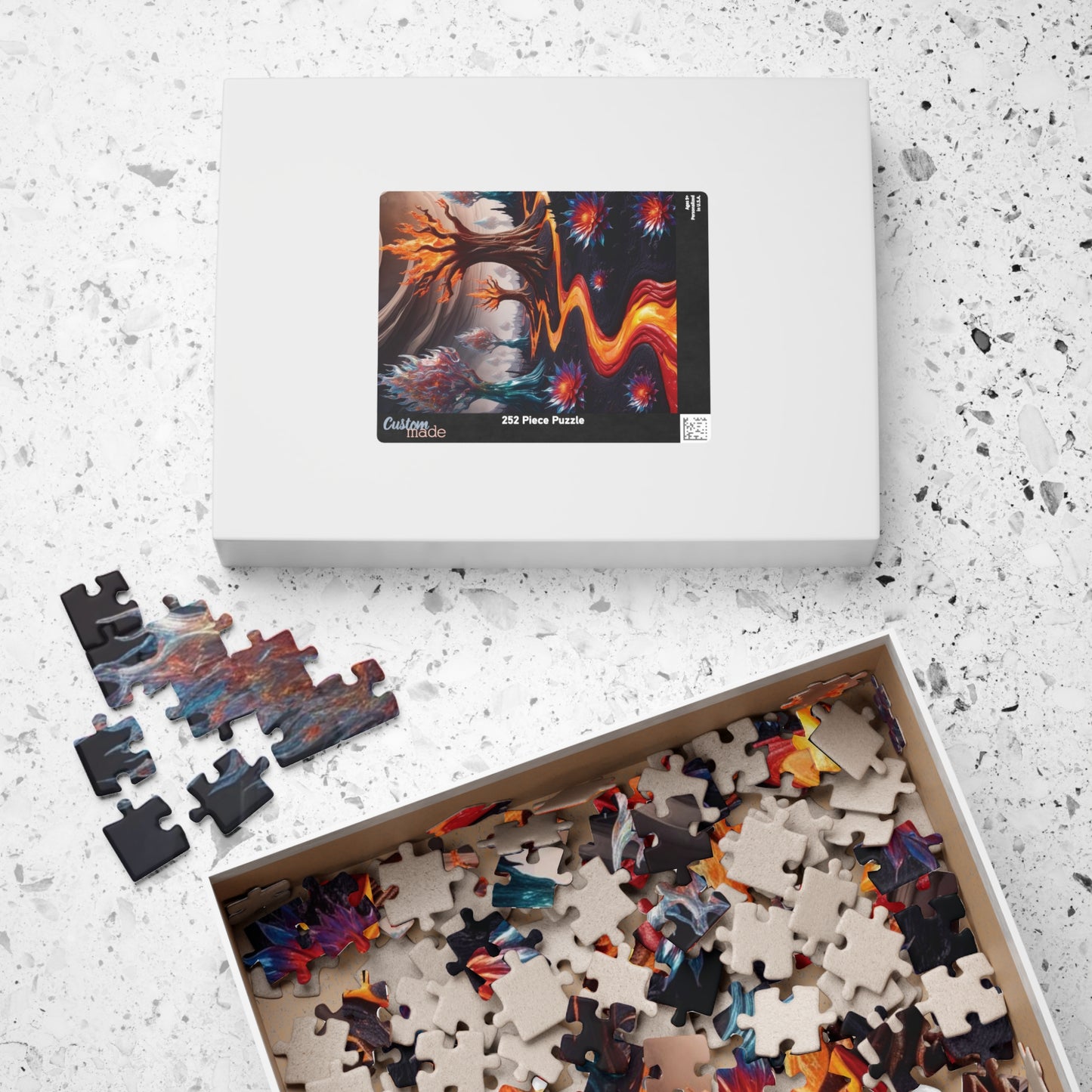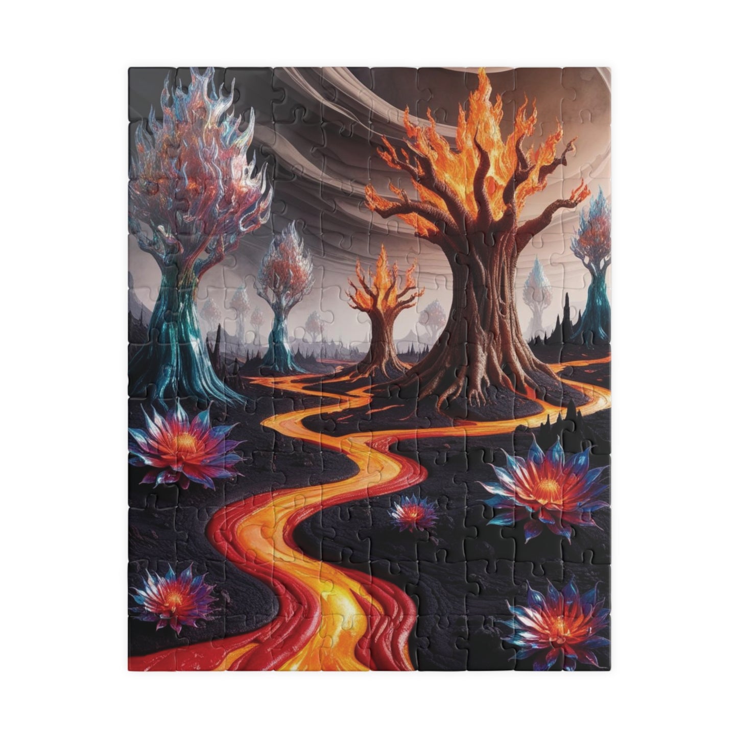 Immerse yourself in a mesmerizing landscape where molten rivers cascade like streams of glowing paint, weaving through a terrain of surreal wonder. Trees made of shimmering glass and fire stand tall, while volcanic flowers bloom into intricate fractal patterns, creating a dreamlike scene that feels both otherworldly and enchanting. Perfect for puzzle enthusiasts who love captivating designs, this puzzle combines artistry and challenge, making it an unforgettable addition to your collection or a unique gift for someone special.