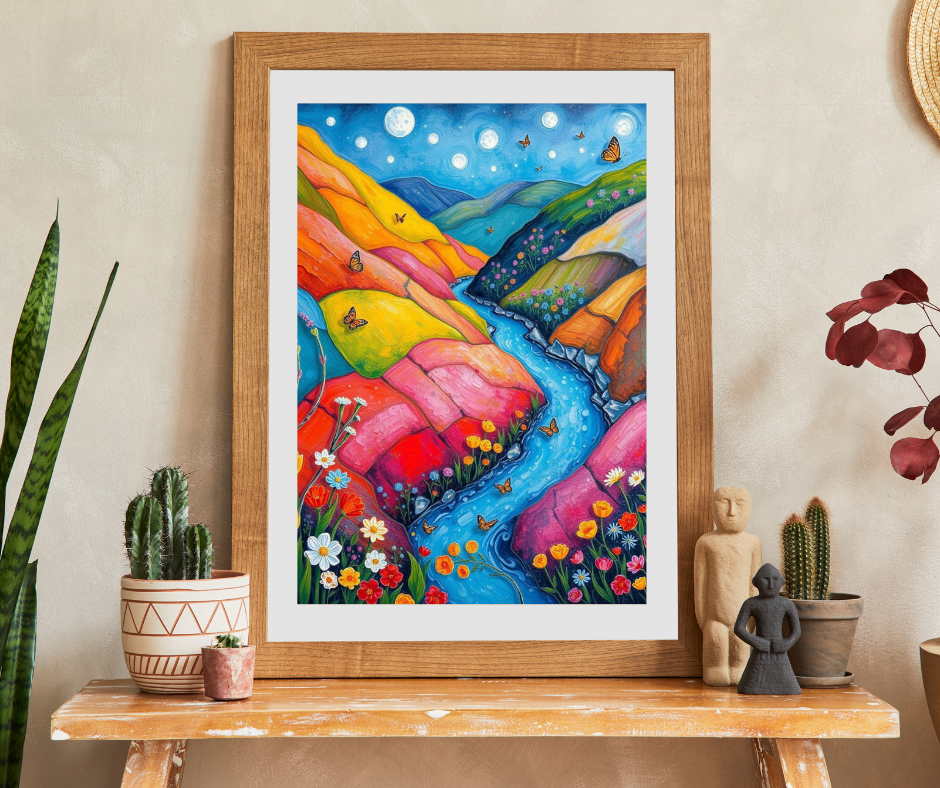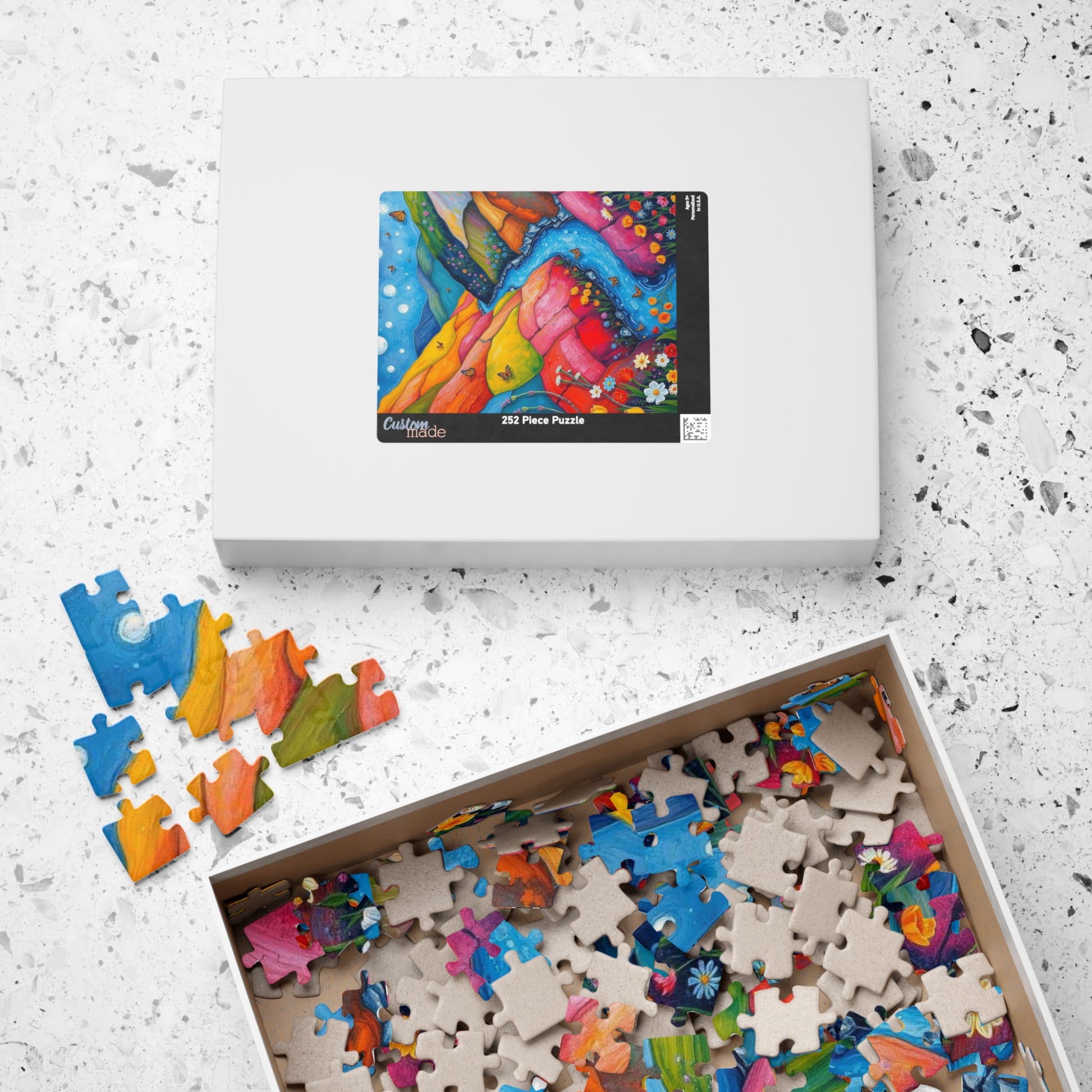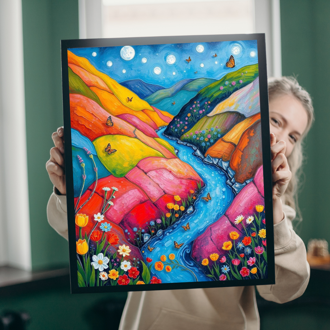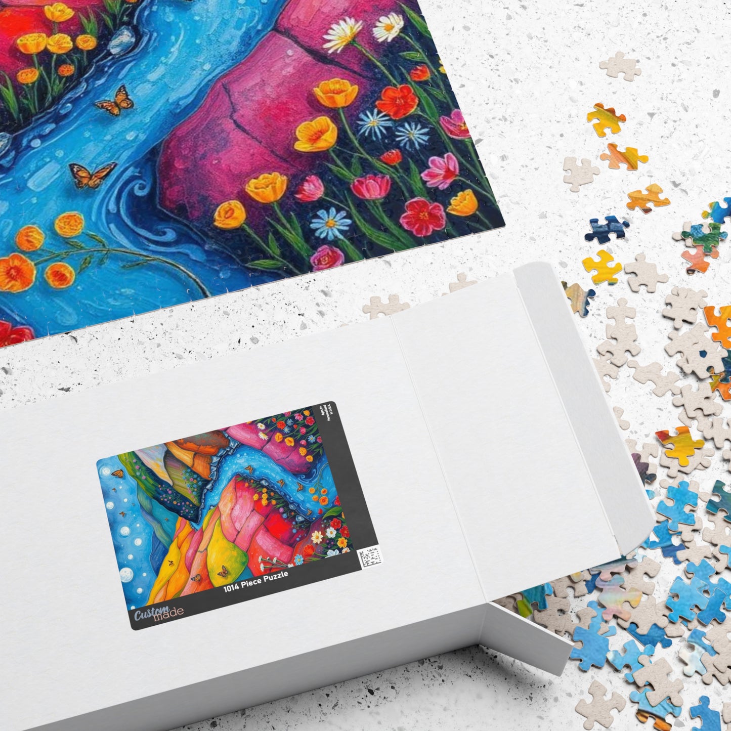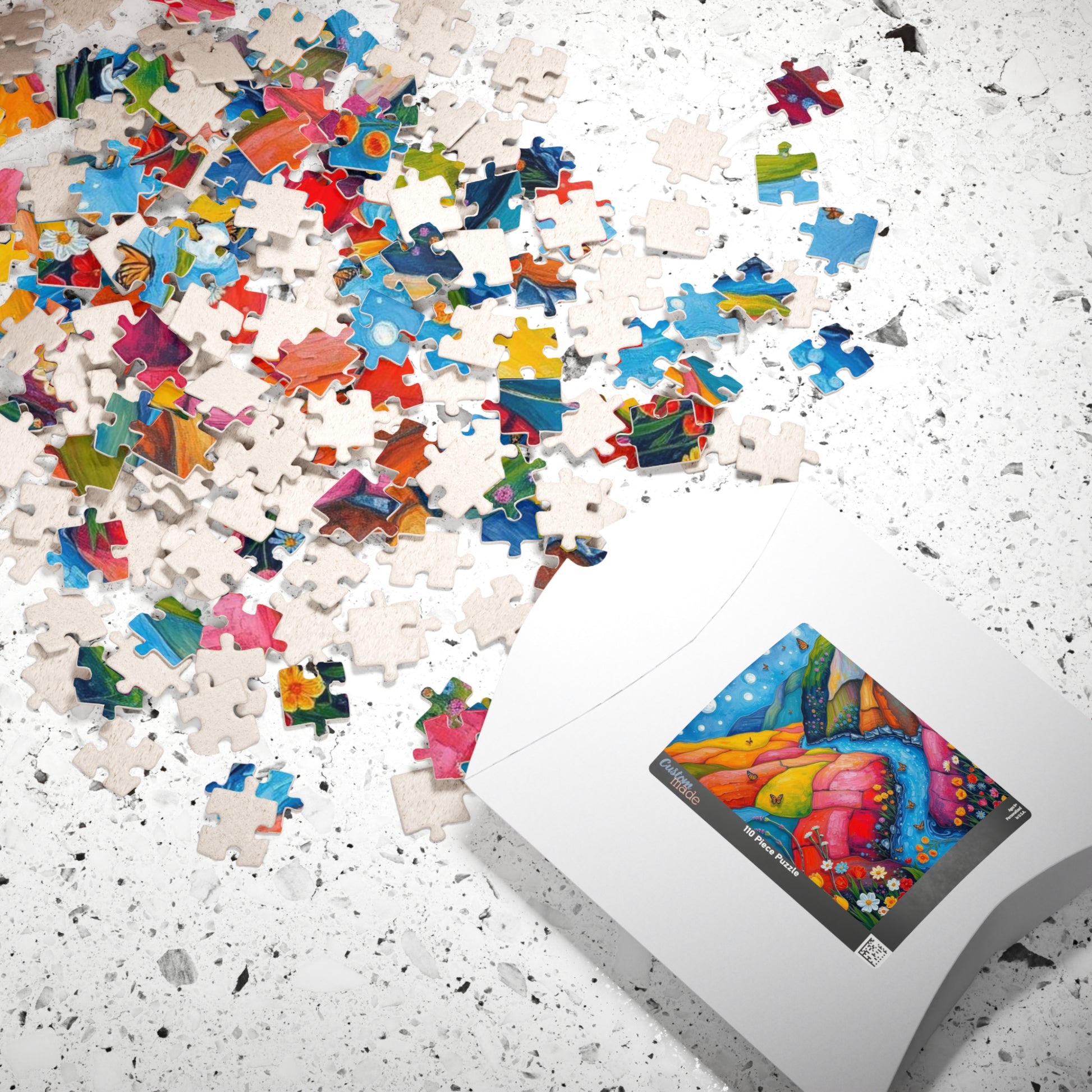 Step into a dreamland where summer sings in swirls of color. River Through Candy Hills invites you to explore a magical valley where a shimmering river winds between soft, sugar-toned hills. Vibrant wildflowers bloom in impossible shades, and butterflies dance overhead like floating confetti. Inspired by the whimsical, poetic color palette of Marc Chagall, this puzzle offers a serene and surreal summer escape—perfect for puzzle lovers who crave both challenge and charm. Every piece unlocks a new pocket of beauty in this pastel wonderland. This product makes an excellent gift for puzzle enthusiasts or anyone seeking a fun, engaging activity. Ideal for holidays, birthday celebrations, or simply as a relaxing pastime, it adds a splash of color and artistry to everyday life.