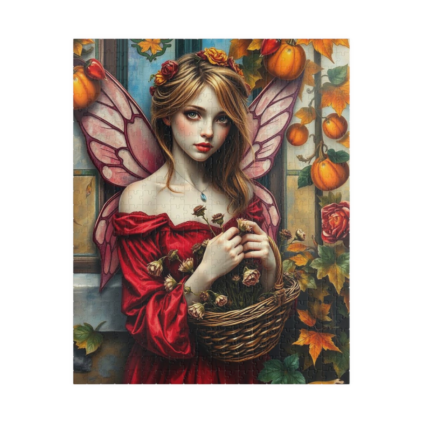 This puzzle depicts a melancholy fairy in a crimson gown with withered flowers, set against a backdrop of pumpkins, rosehips, and autumn leaves. Perfect for fairy tale lovers and those who enjoy whimsical and magical artwork. Ideal for Halloween and fall-themed decorations.